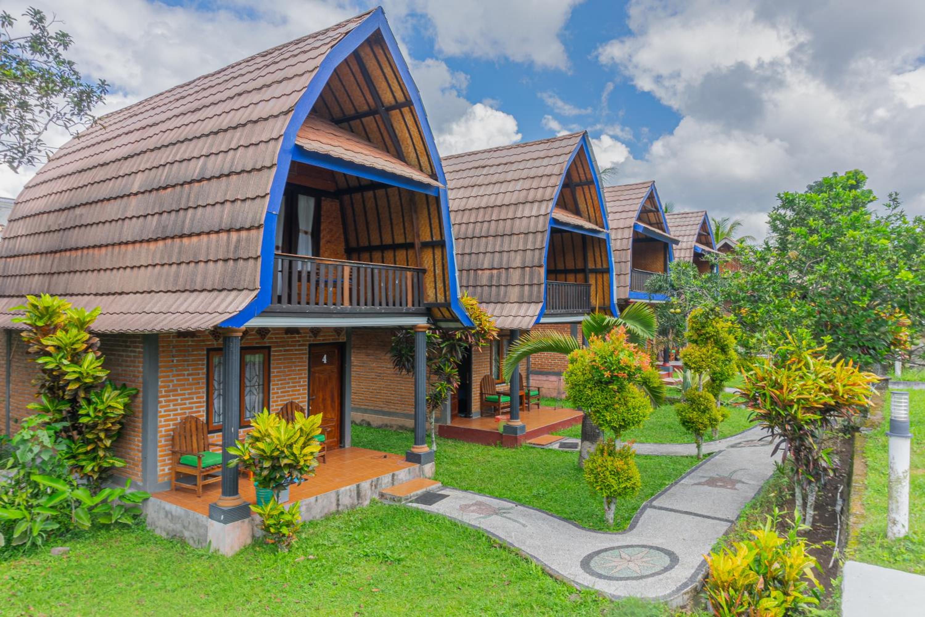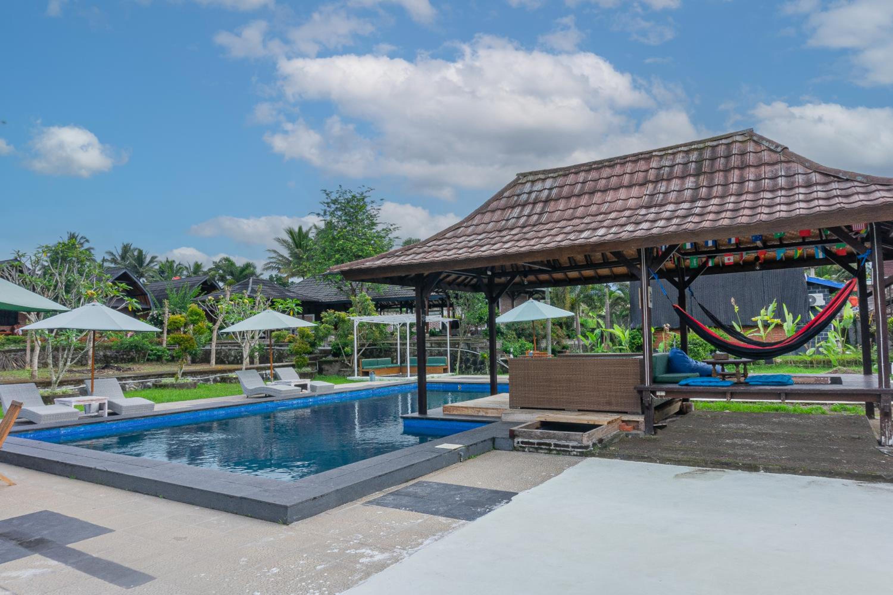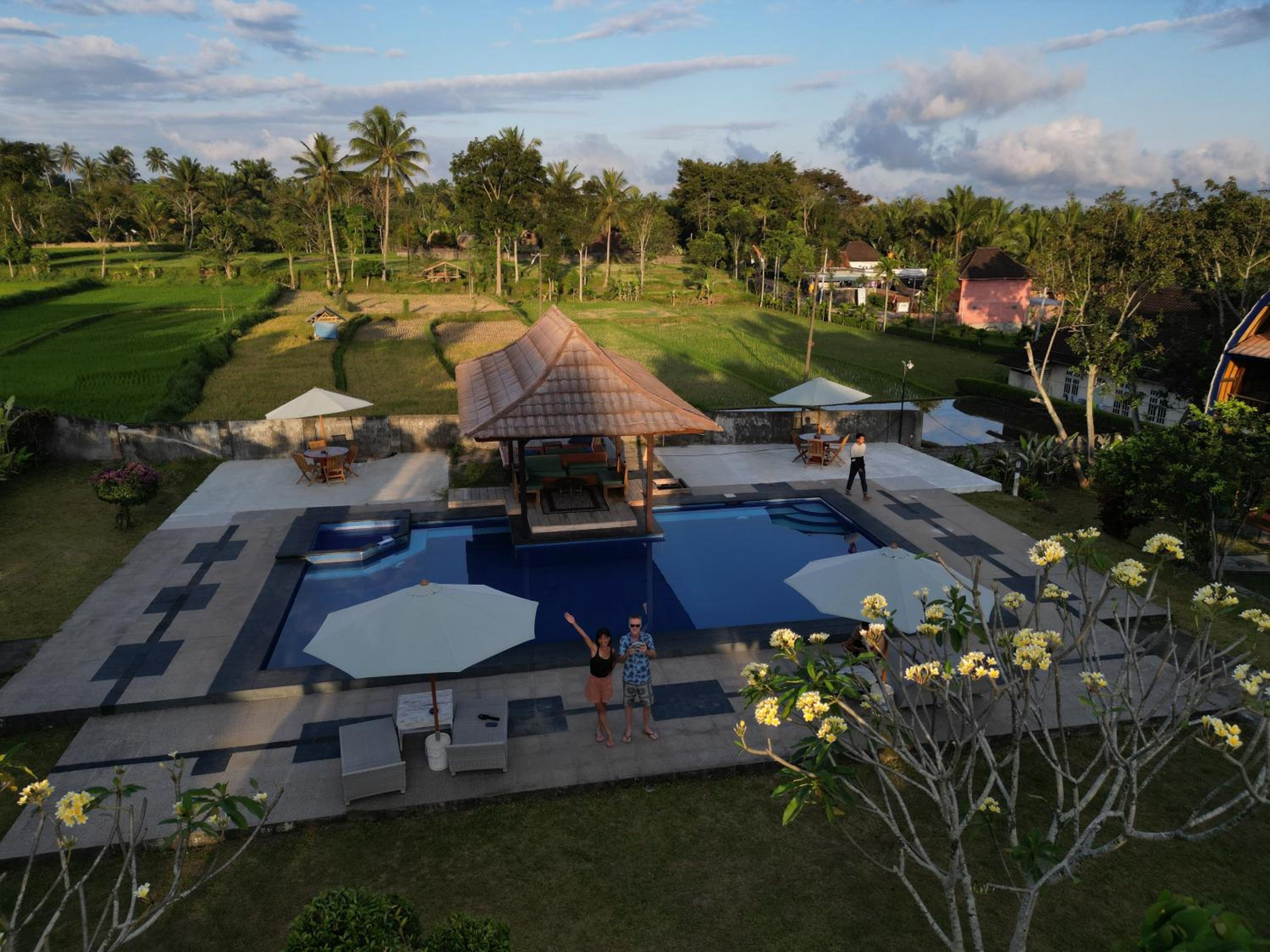 Heel leuk hotel met huisjes met een mooi onderhouden tuin ervoor. Er is een zwembad. De ontbijtzaal kijkt uit op de prachtige rijstvelden. Het ontbijt was heerlijk, erge lekkere ananaspannekoeken, vers fruit en vers geperst sinaasappelsap. En ook nog een warme croissant..ze willen je nog echt verwennen hier. Er zit een restaurant tegenover waar alles lekker is , dat is ook van hun..de bedden lagen goed en de kamers zijn schoon. Verwacht geen 5 sterren maar een knus familie hotel waar ze alles voor je willen regelen.