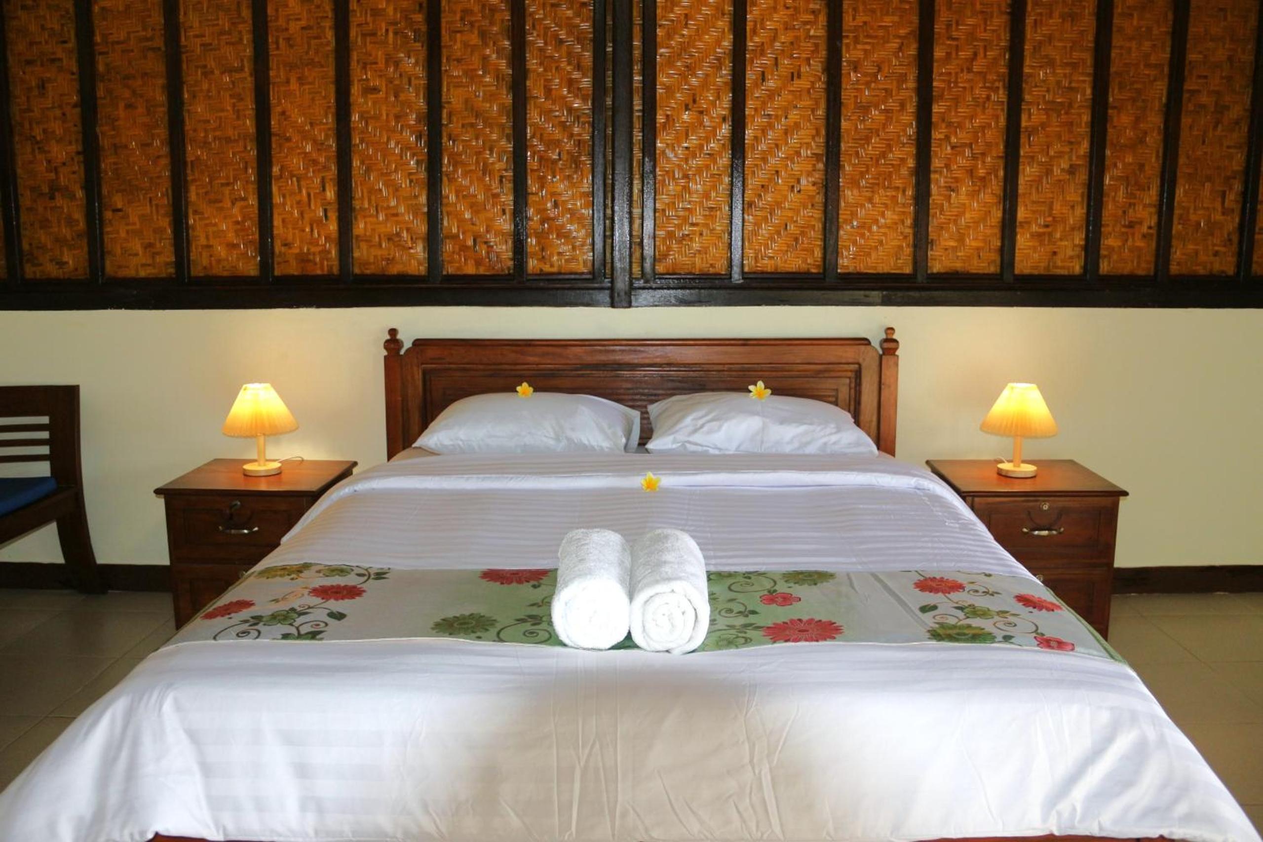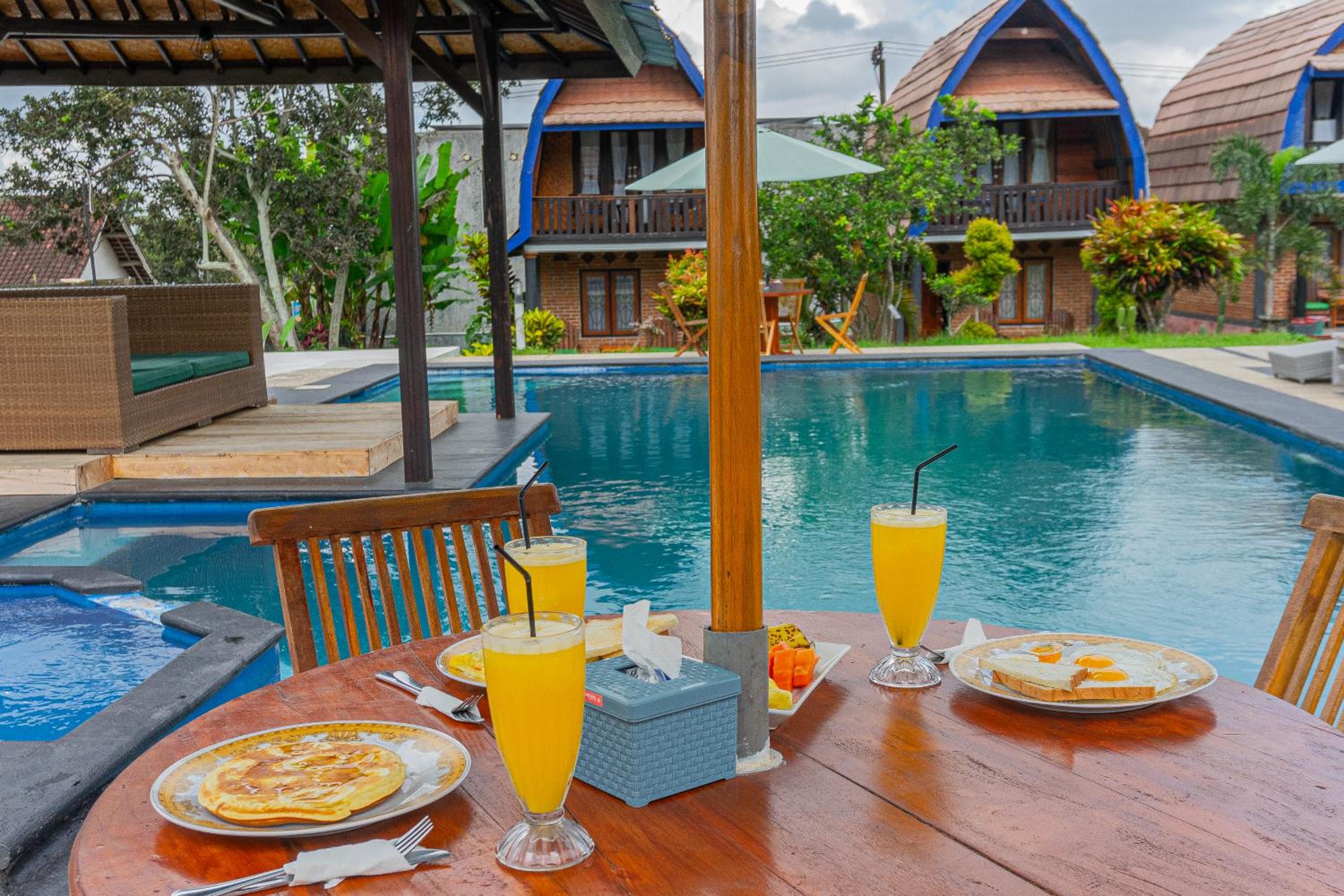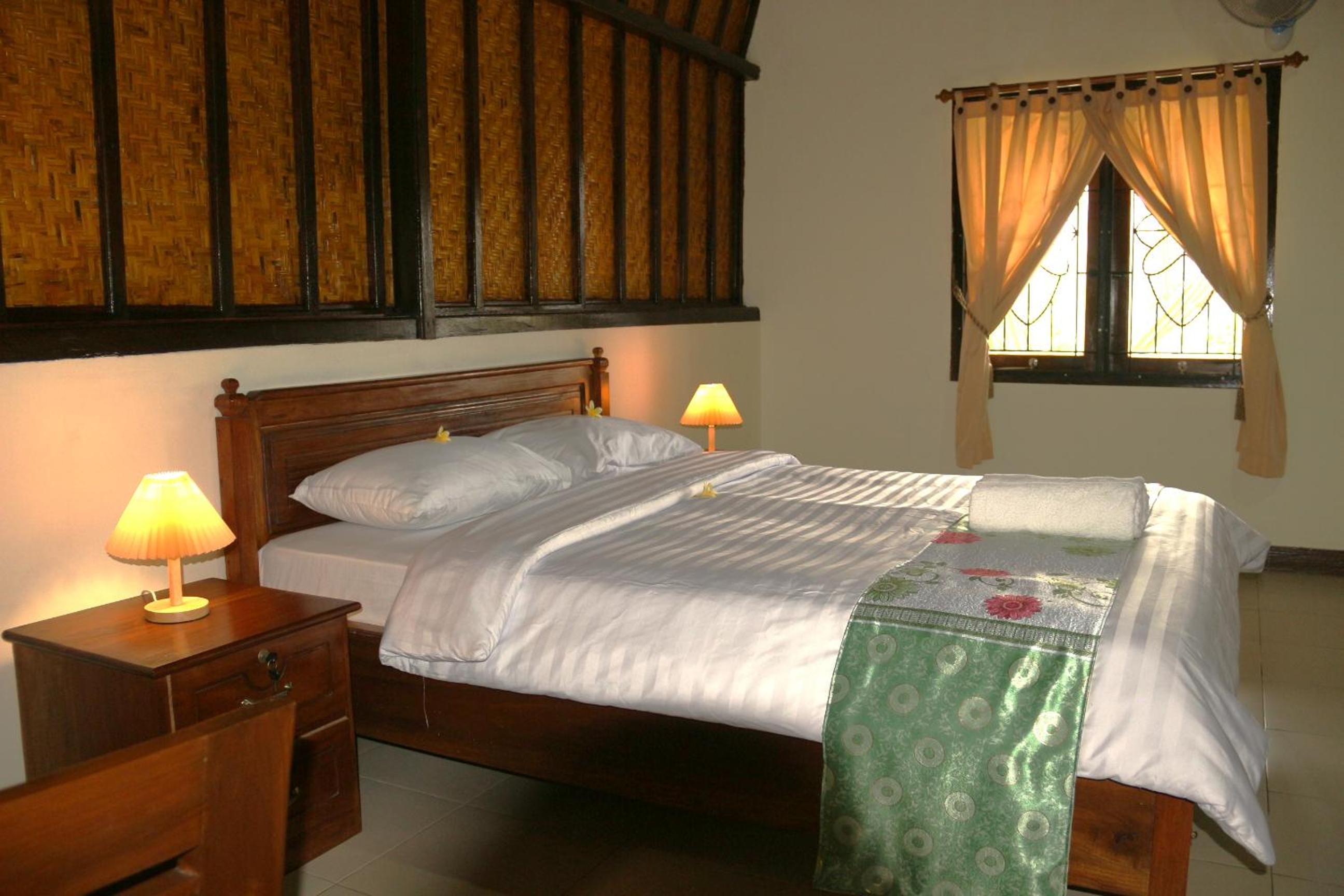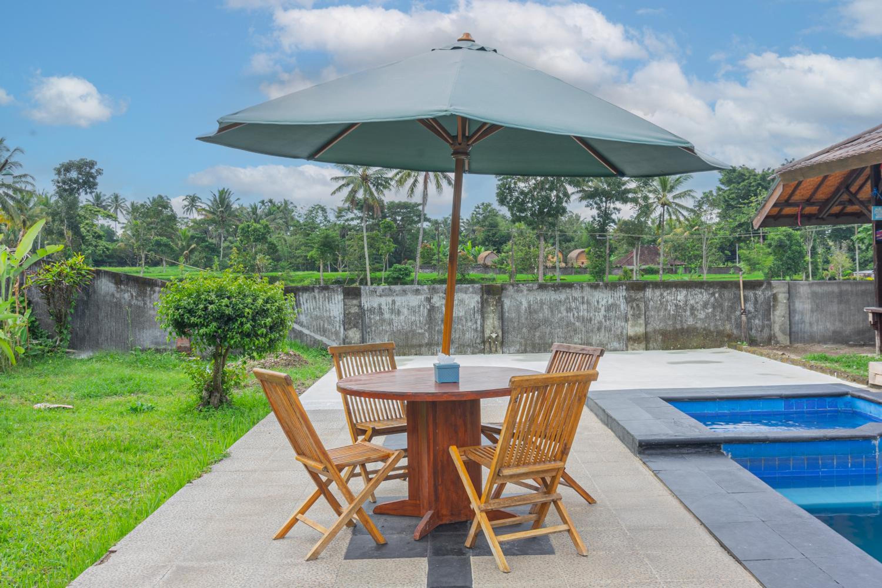 Heel leuk hotel met huisjes met een mooi onderhouden tuin ervoor. Er is een zwembad. De ontbijtzaal kijkt uit op de prachtige rijstvelden. Het ontbijt was heerlijk, erge lekkere ananaspannekoeken, vers fruit en vers geperst sinaasappelsap. En ook nog een warme croissant..ze willen je nog echt verwennen hier. Er zit een restaurant tegenover waar alles lekker is , dat is ook van hun..de bedden lagen goed en de kamers zijn schoon. Verwacht geen 5 sterren maar een knus familie hotel waar ze alles voor je willen regelen.