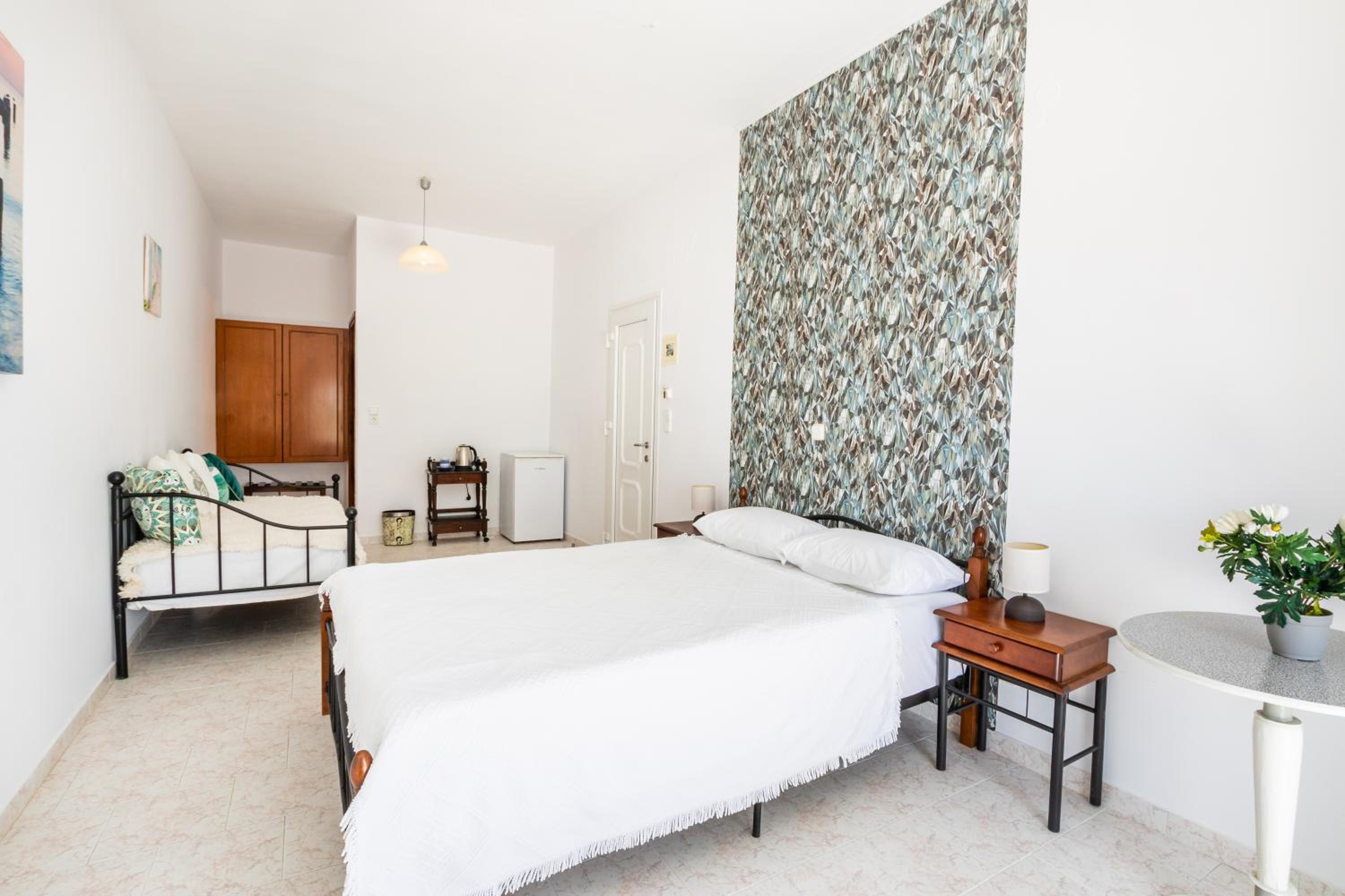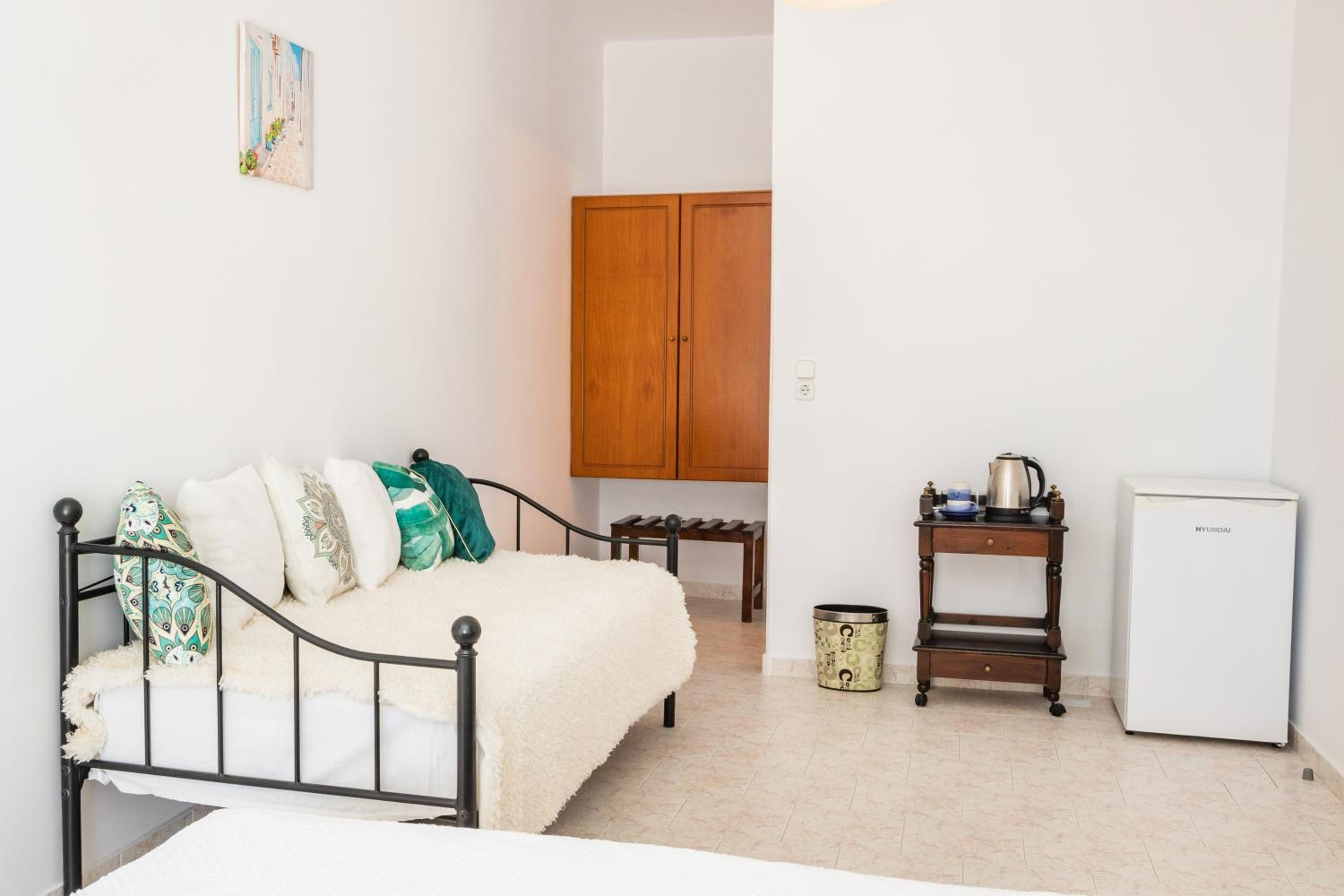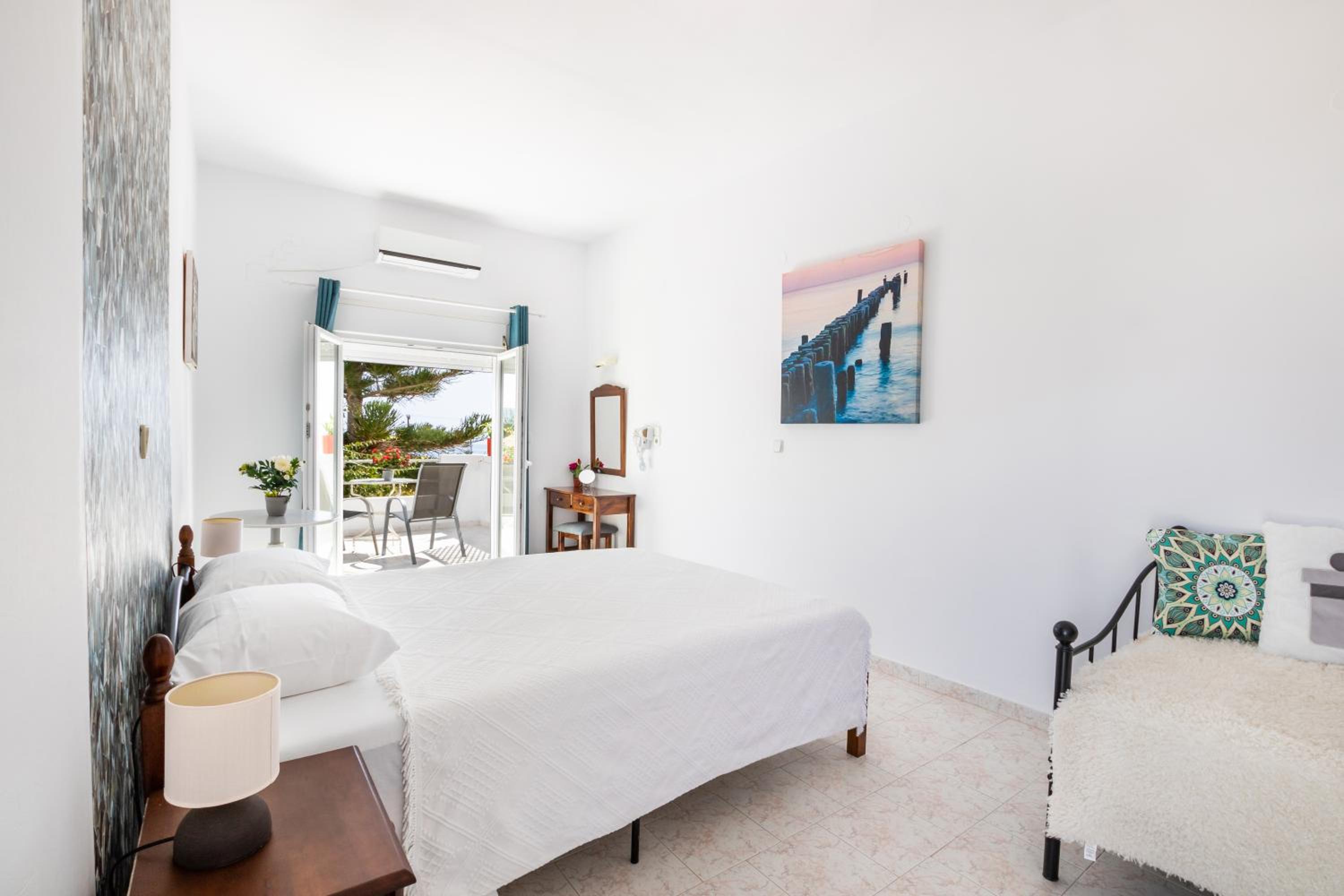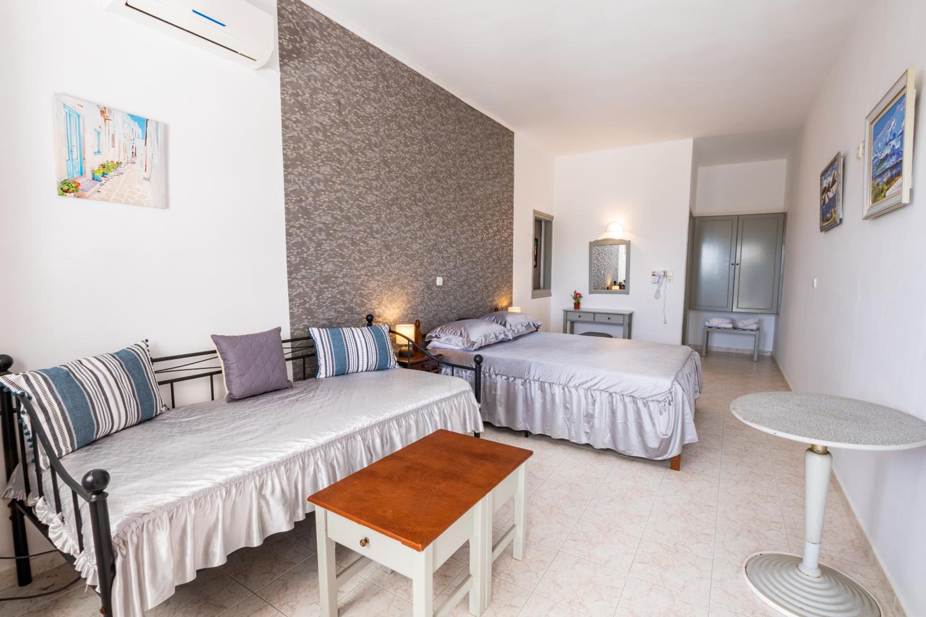 The room was spotlessly cleaned every day. The mattress and the pillows were so comfy! They have 2 types of pillow, one normal (soft) and one orthopedic. We just asked to have both and she kindly provided them for us. If you don't like the mattress, you can try its other side, just turn it. The AC was working perfectly, as was the fridge (we froze bottles of water to bring them to the beach). We had the terrace to have coffee during the day or to drink wine at night, and dry our clothes. The shower is very good and has good pressure. Fresh clean towels daily. Plenty of space in the wardrobe to store your stuff (you really don't need much, you are going to the beach!). The best island beach is Amoopi, a sand beach about 10-15 minutes by foot from there.