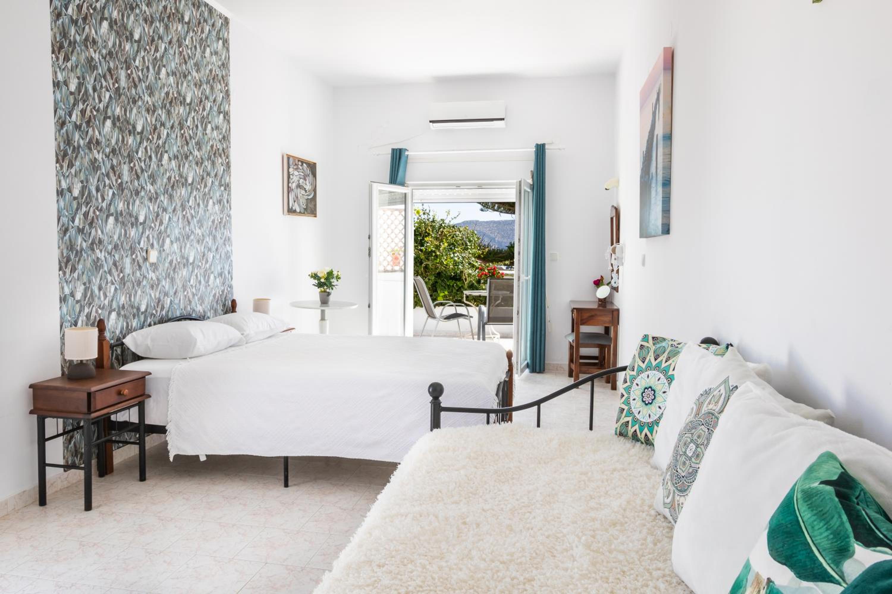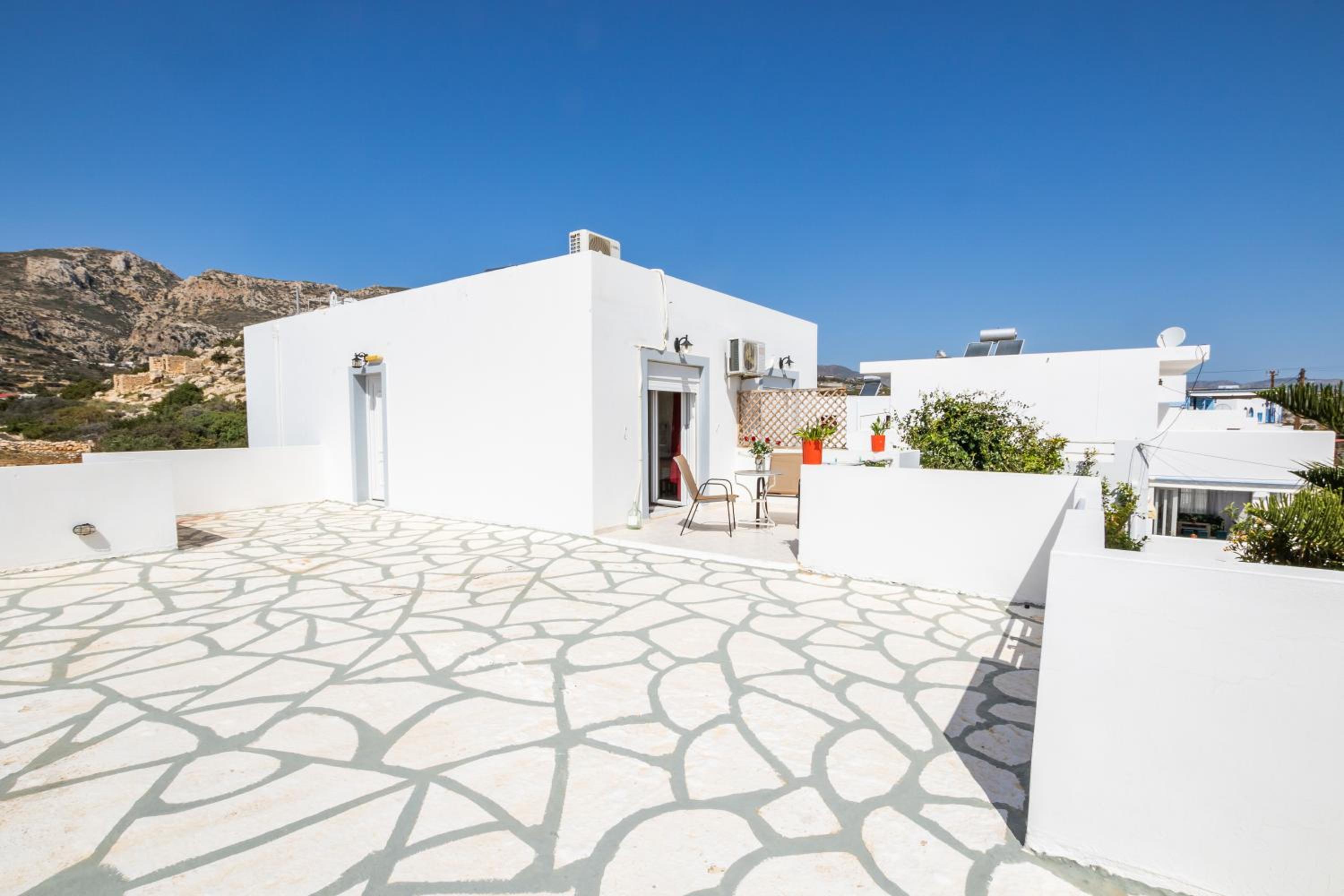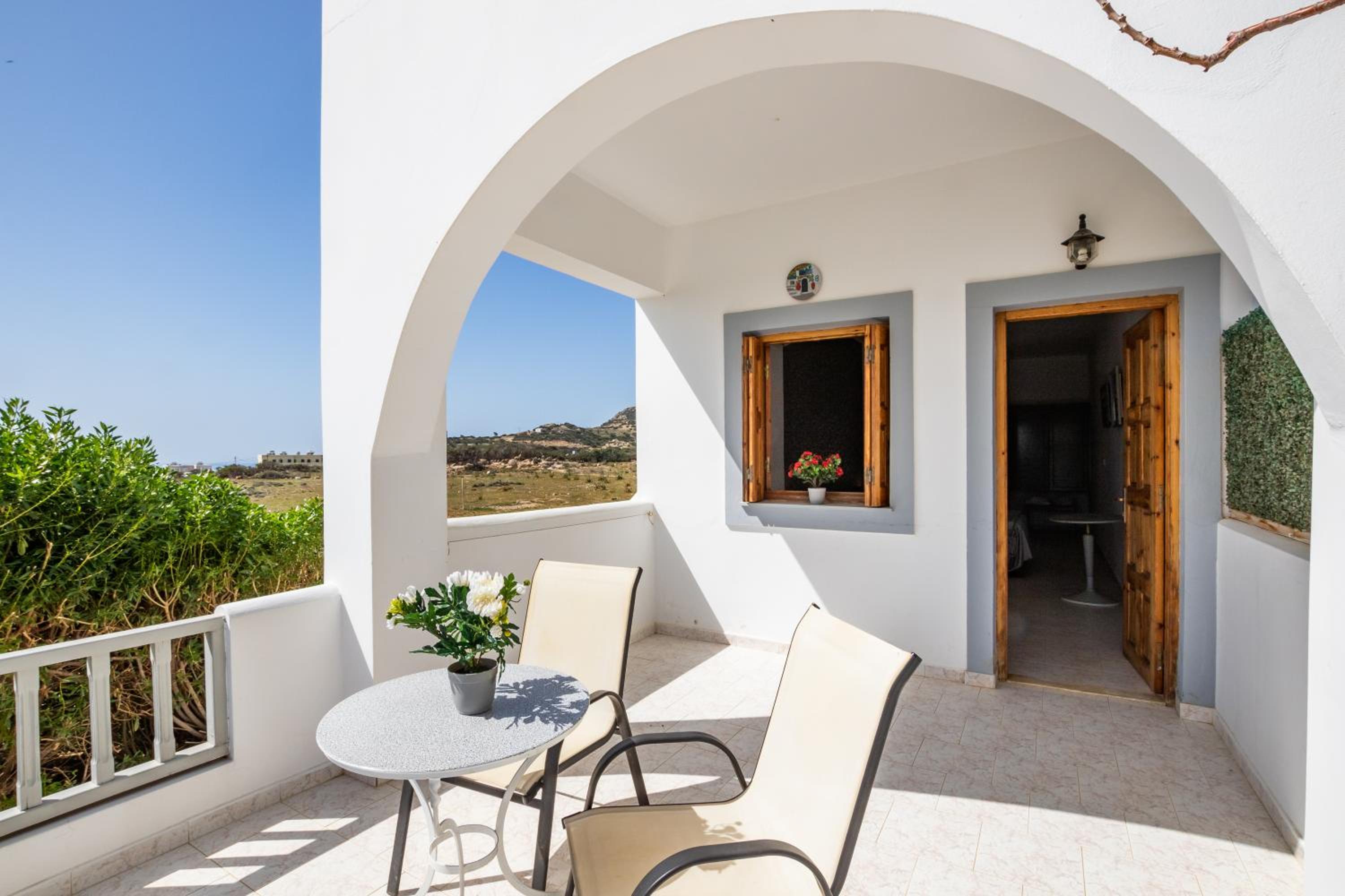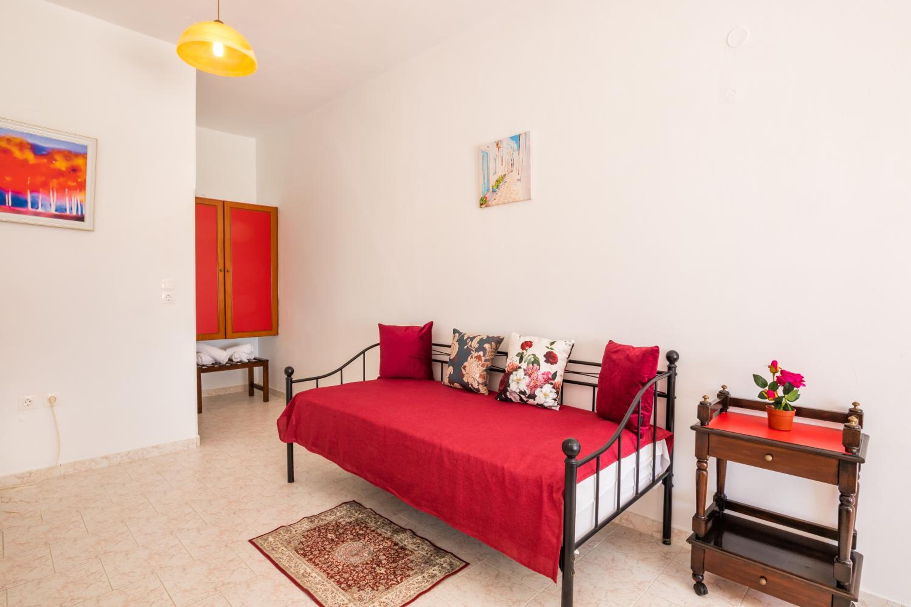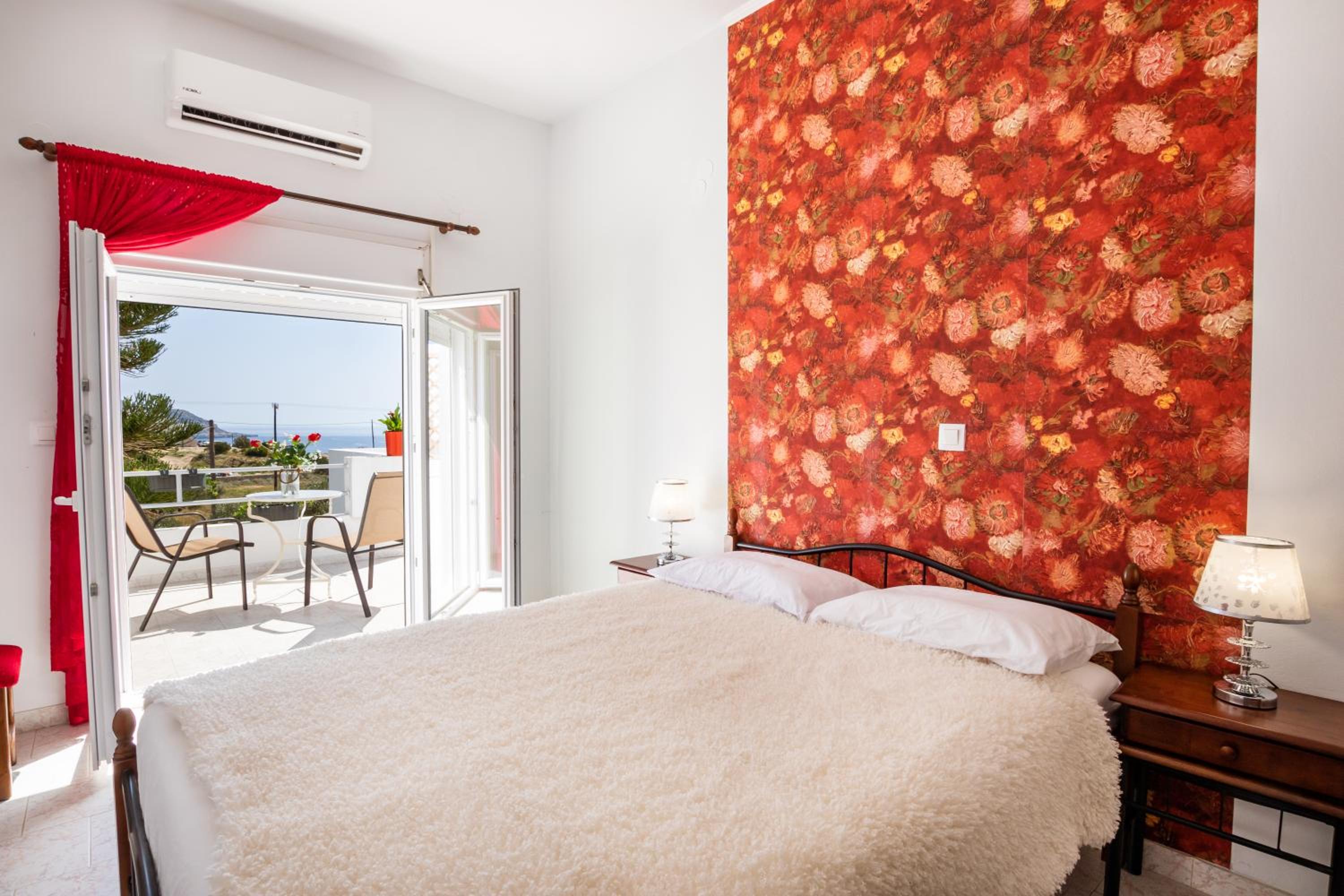 The room was spotlessly cleaned every day. The mattress and the pillows were so comfy! They have 2 types of pillow, one normal (soft) and one orthopedic. We just asked to have both and she kindly provided them for us. If you don't like the mattress, you can try its other side, just turn it. The AC was working perfectly, as was the fridge (we froze bottles of water to bring them to the beach). We had the terrace to have coffee during the day or to drink wine at night, and dry our clothes. The shower is very good and has good pressure. Fresh clean towels daily. Plenty of space in the wardrobe to store your stuff (you really don't need much, you are going to the beach!). The best island beach is Amoopi, a sand beach about 10-15 minutes by foot from there.