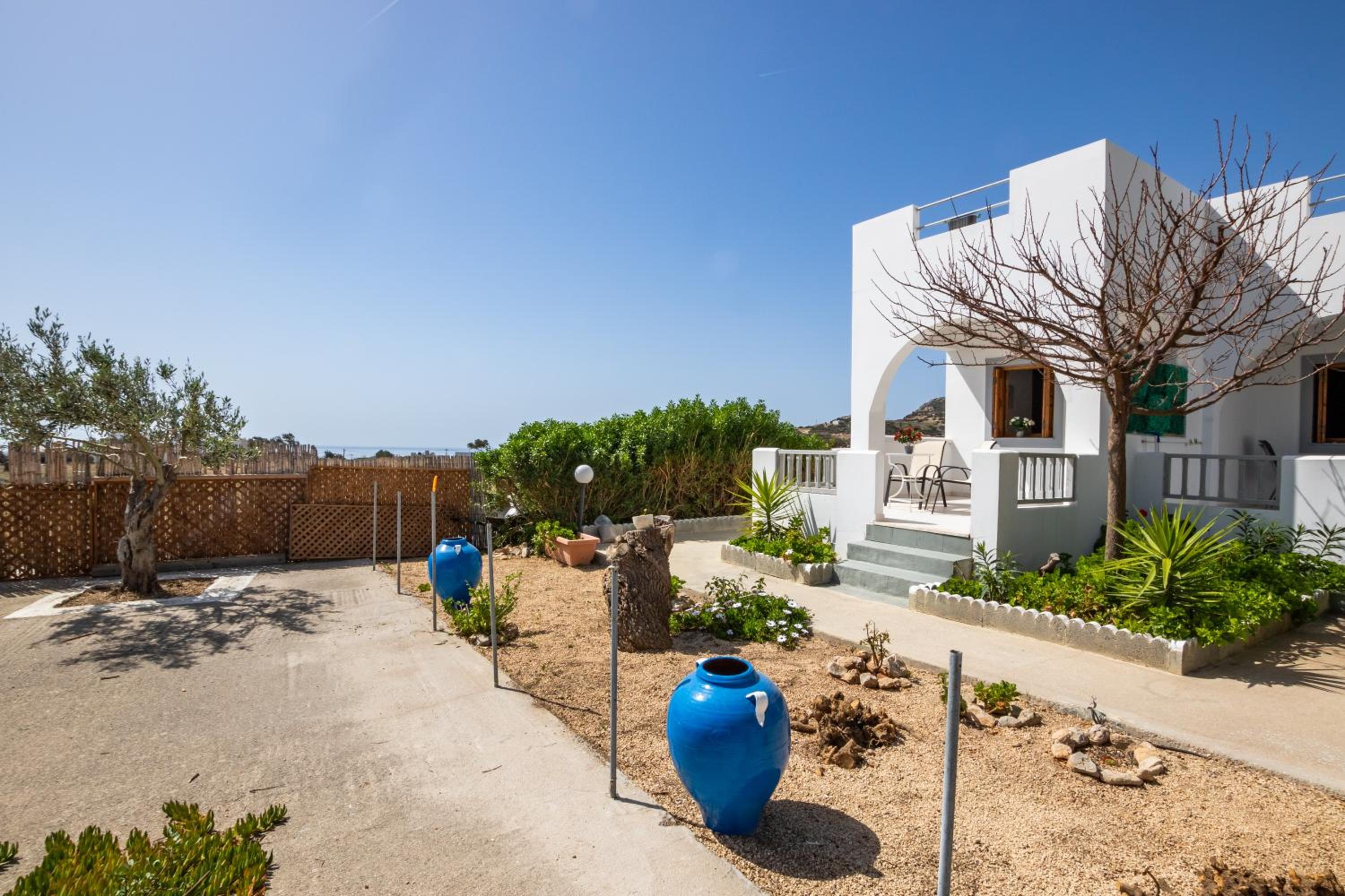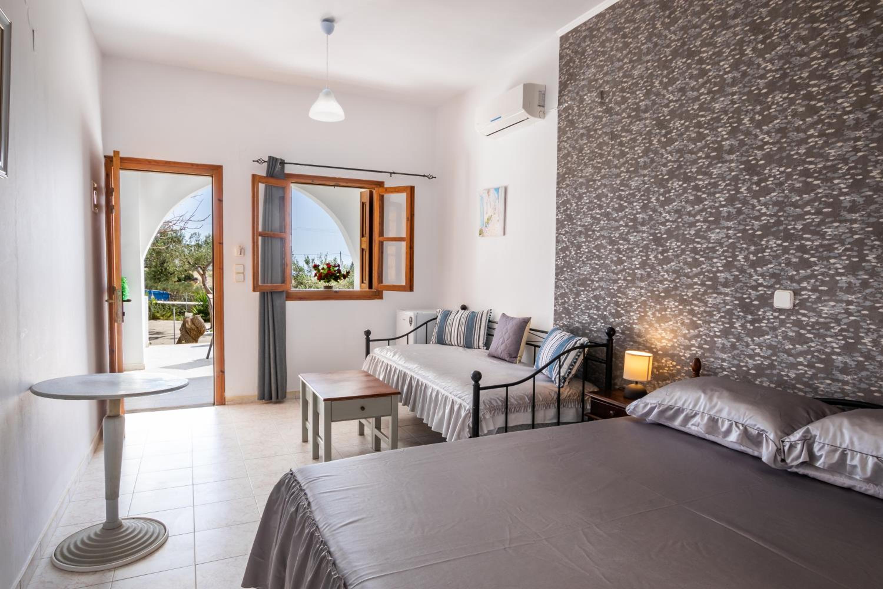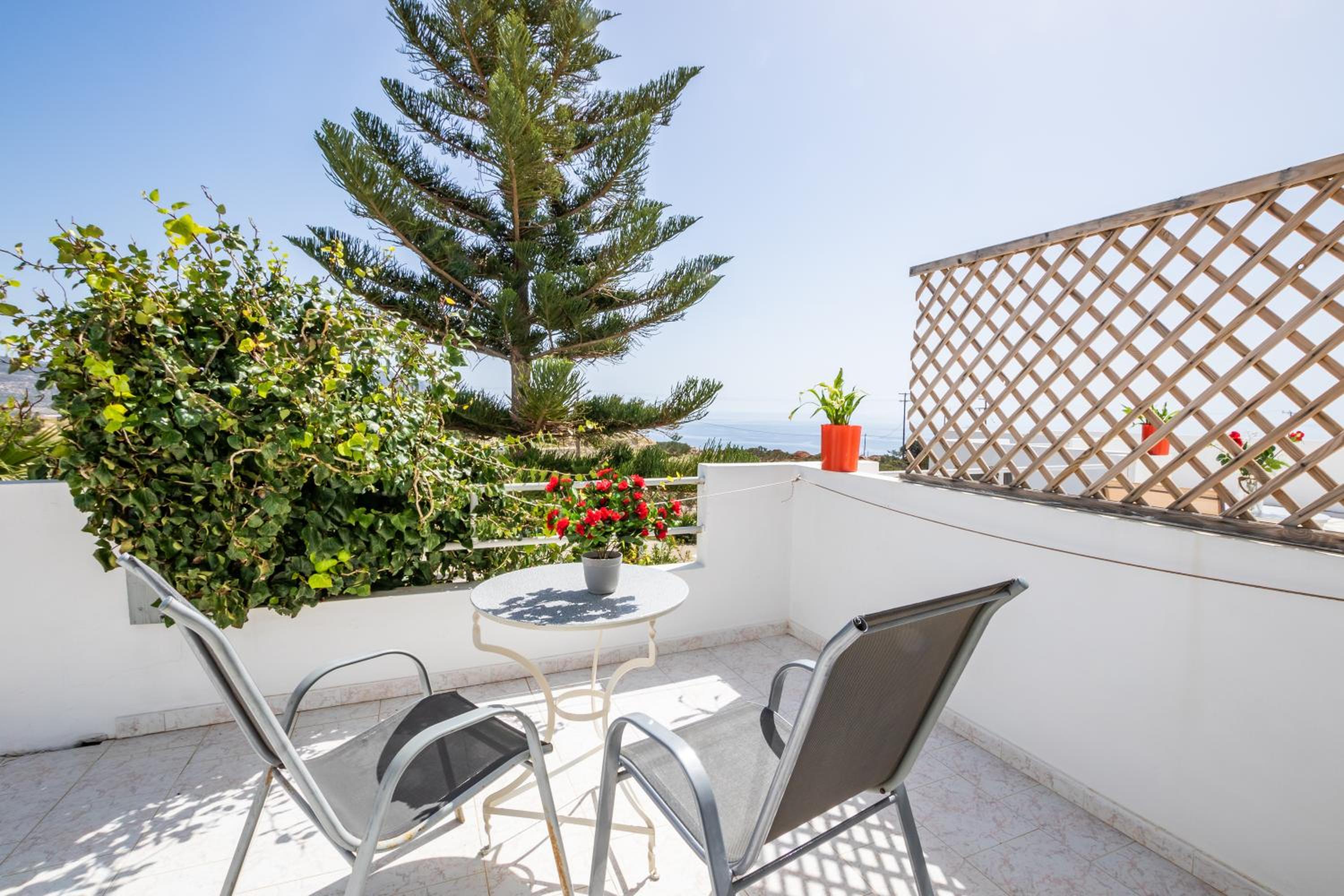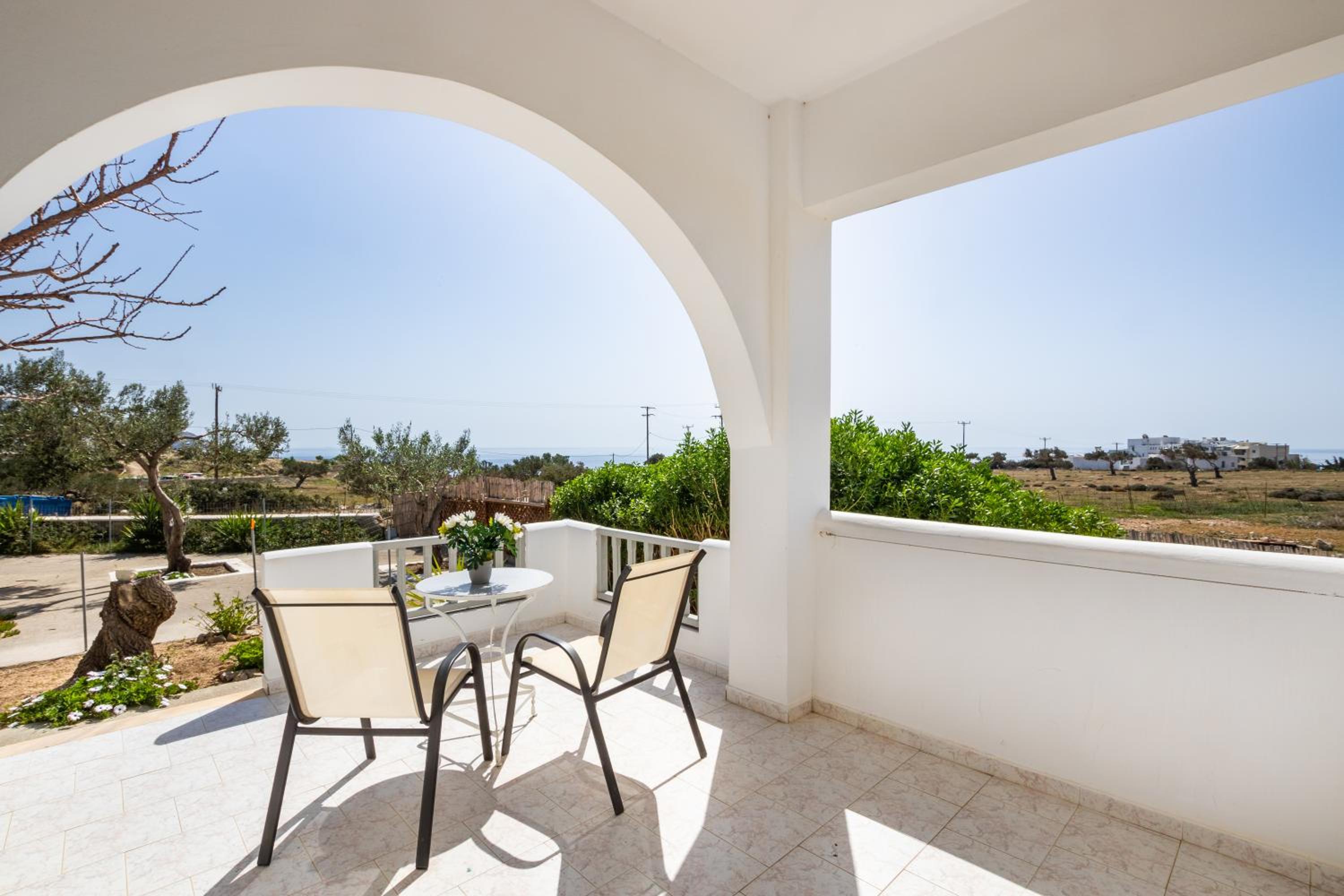 The room was spotlessly cleaned every day. The mattress and the pillows were so comfy! They have 2 types of pillow, one normal (soft) and one orthopedic. We just asked to have both and she kindly provided them for us. If you don't like the mattress, you can try its other side, just turn it. The AC was working perfectly, as was the fridge (we froze bottles of water to bring them to the beach). We had the terrace to have coffee during the day or to drink wine at night, and dry our clothes. The shower is very good and has good pressure. Fresh clean towels daily. Plenty of space in the wardrobe to store your stuff (you really don't need much, you are going to the beach!). The best island beach is Amoopi, a sand beach about 10-15 minutes by foot from there.