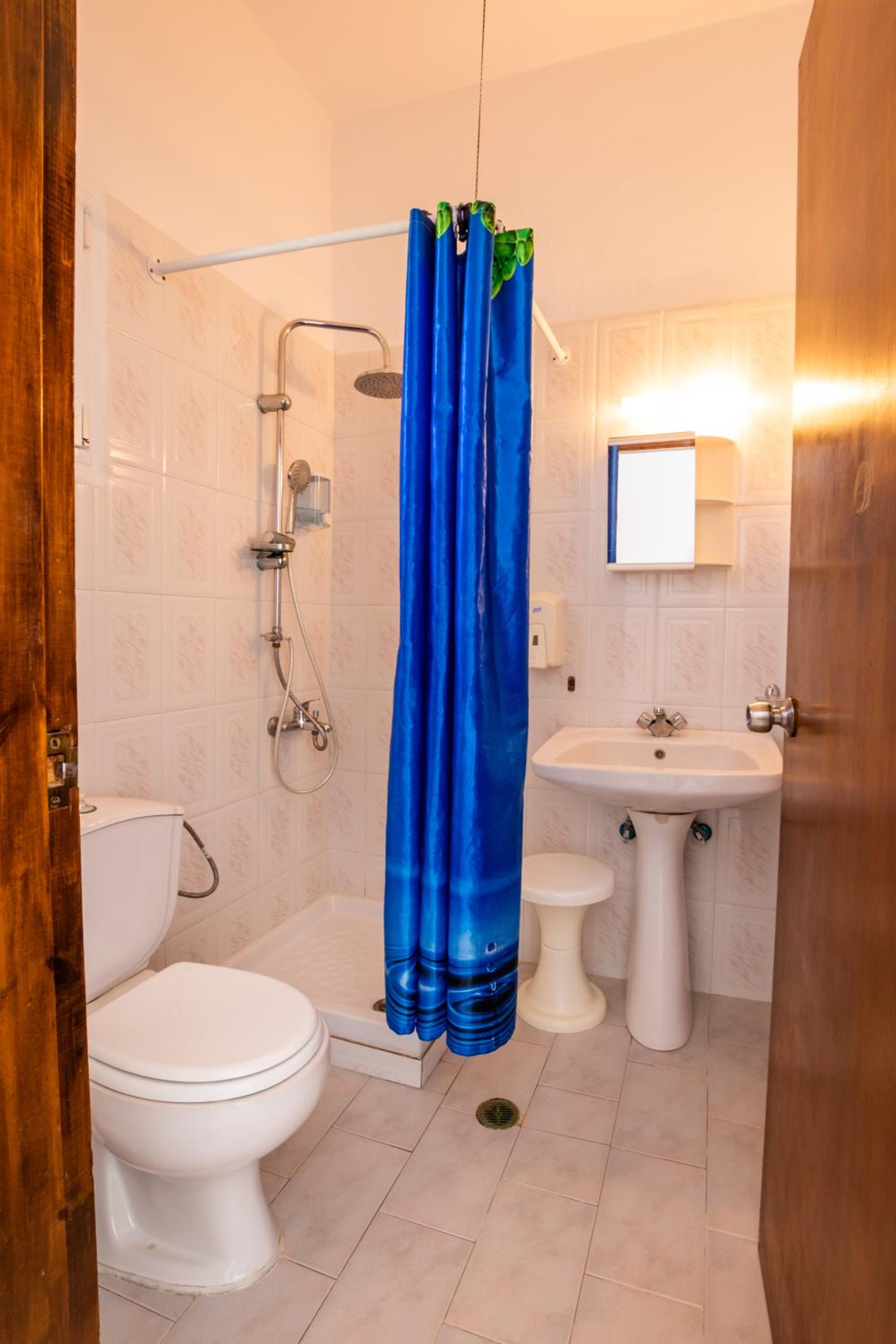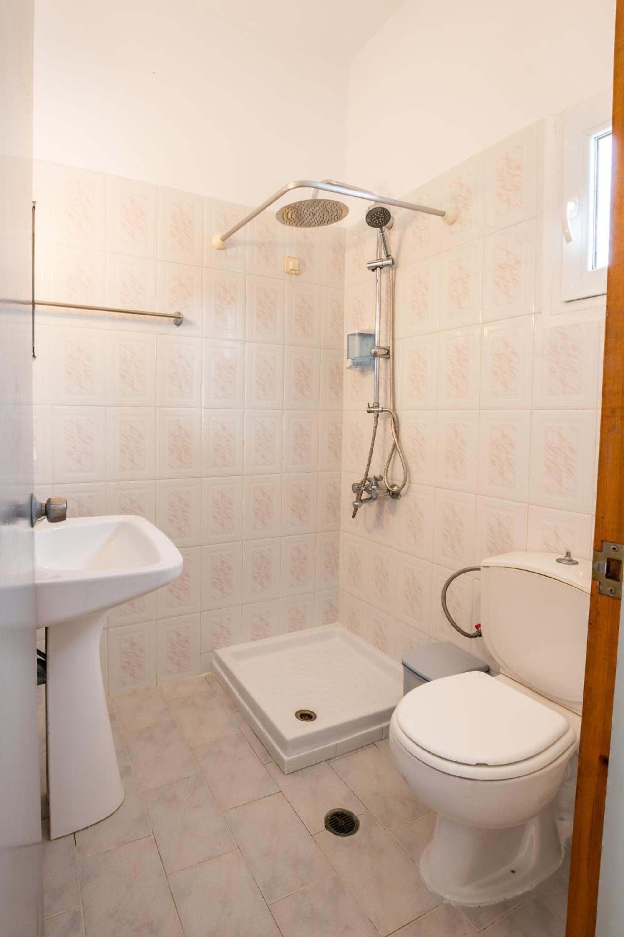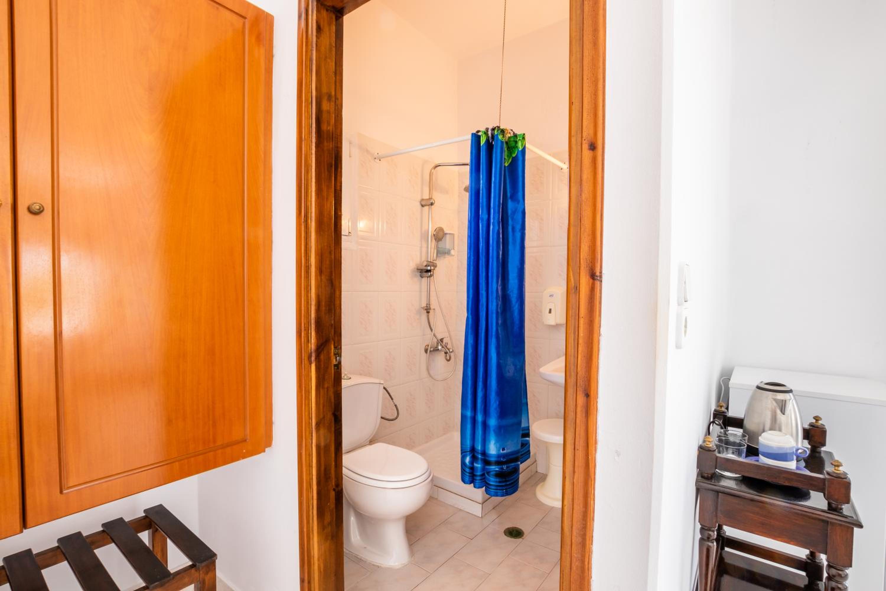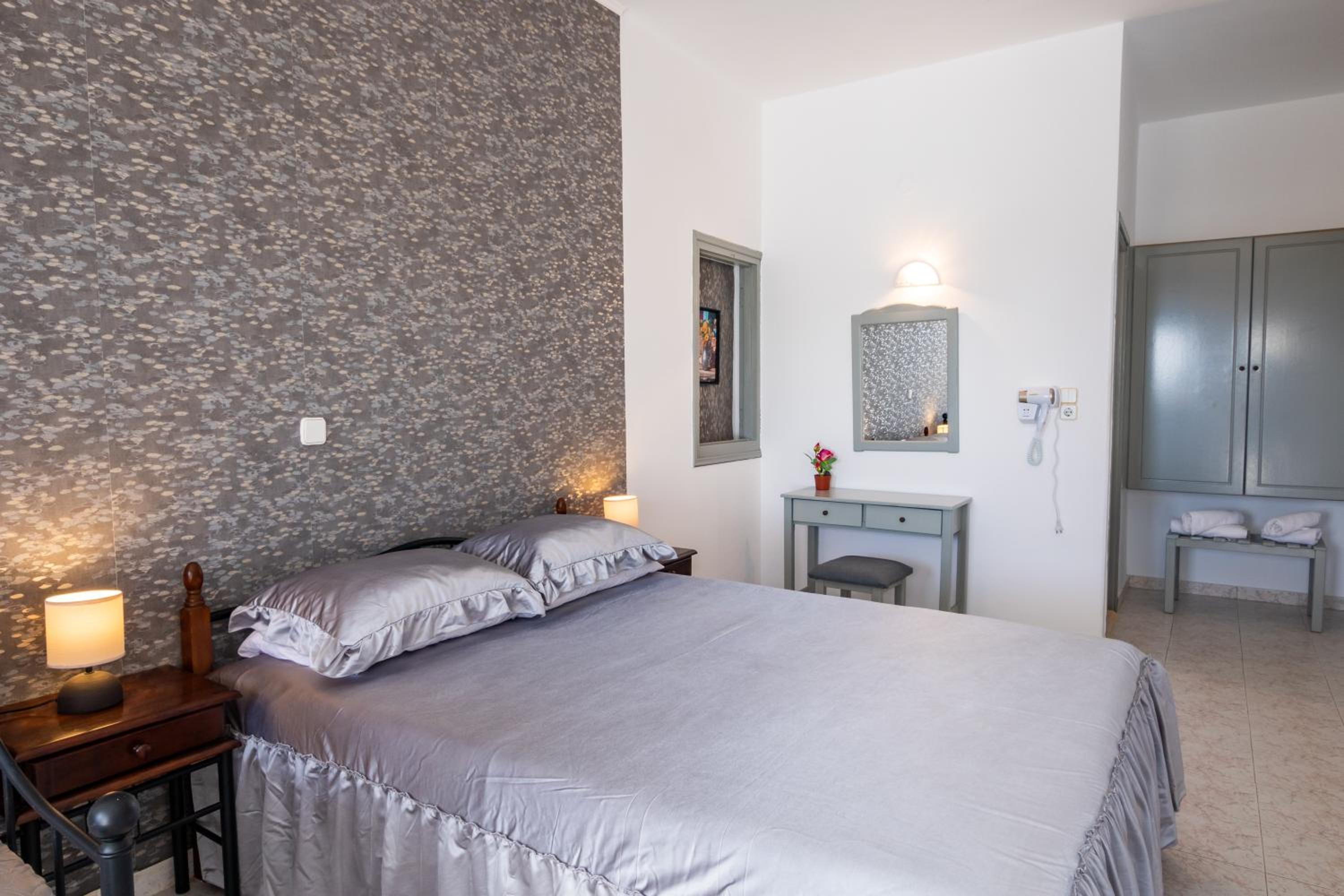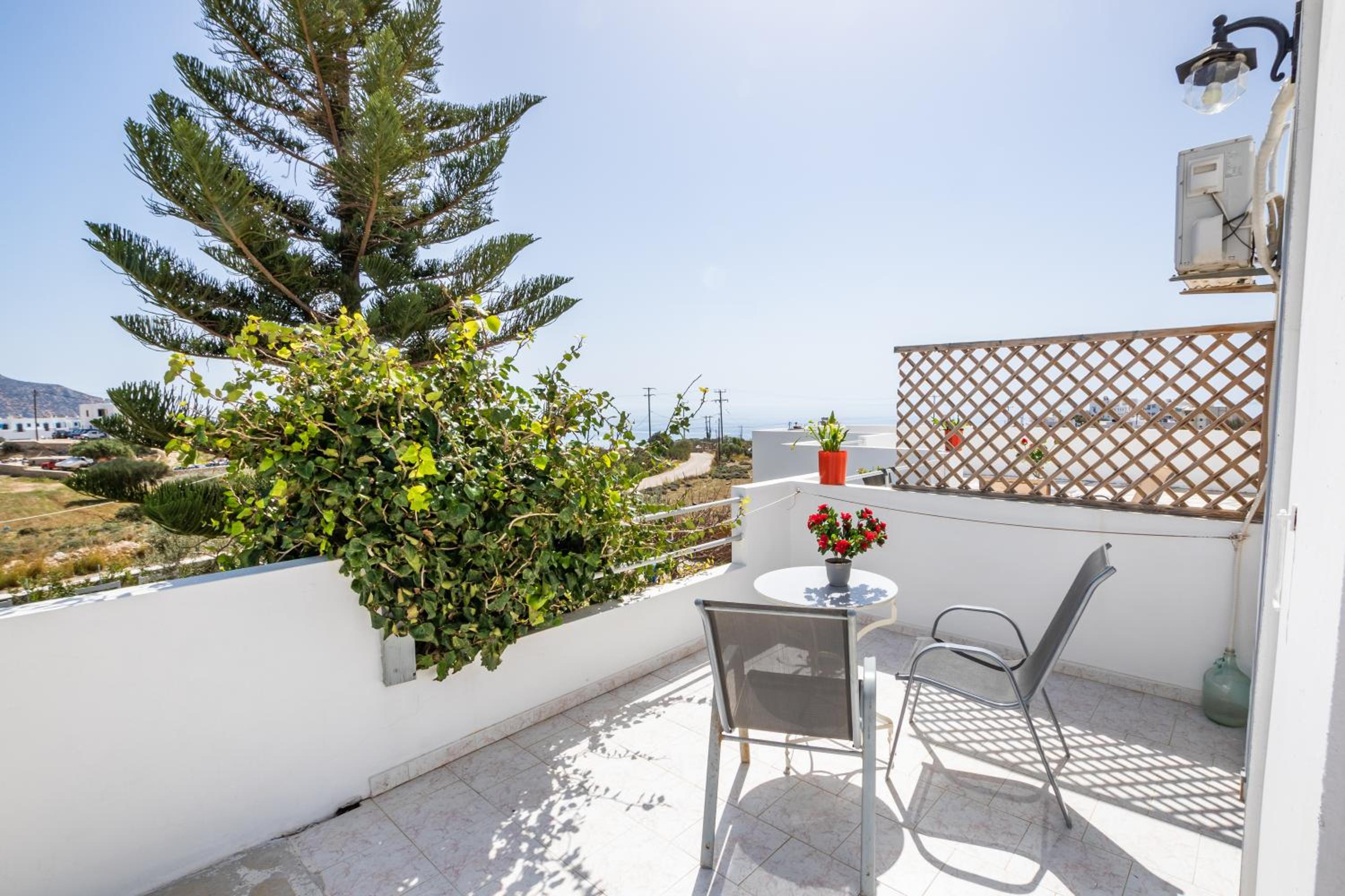 The room was spotlessly cleaned every day. The mattress and the pillows were so comfy! They have 2 types of pillow, one normal (soft) and one orthopedic. We just asked to have both and she kindly provided them for us. If you don't like the mattress, you can try its other side, just turn it. The AC was working perfectly, as was the fridge (we froze bottles of water to bring them to the beach). We had the terrace to have coffee during the day or to drink wine at night, and dry our clothes. The shower is very good and has good pressure. Fresh clean towels daily. Plenty of space in the wardrobe to store your stuff (you really don't need much, you are going to the beach!). The best island beach is Amoopi, a sand beach about 10-15 minutes by foot from there.