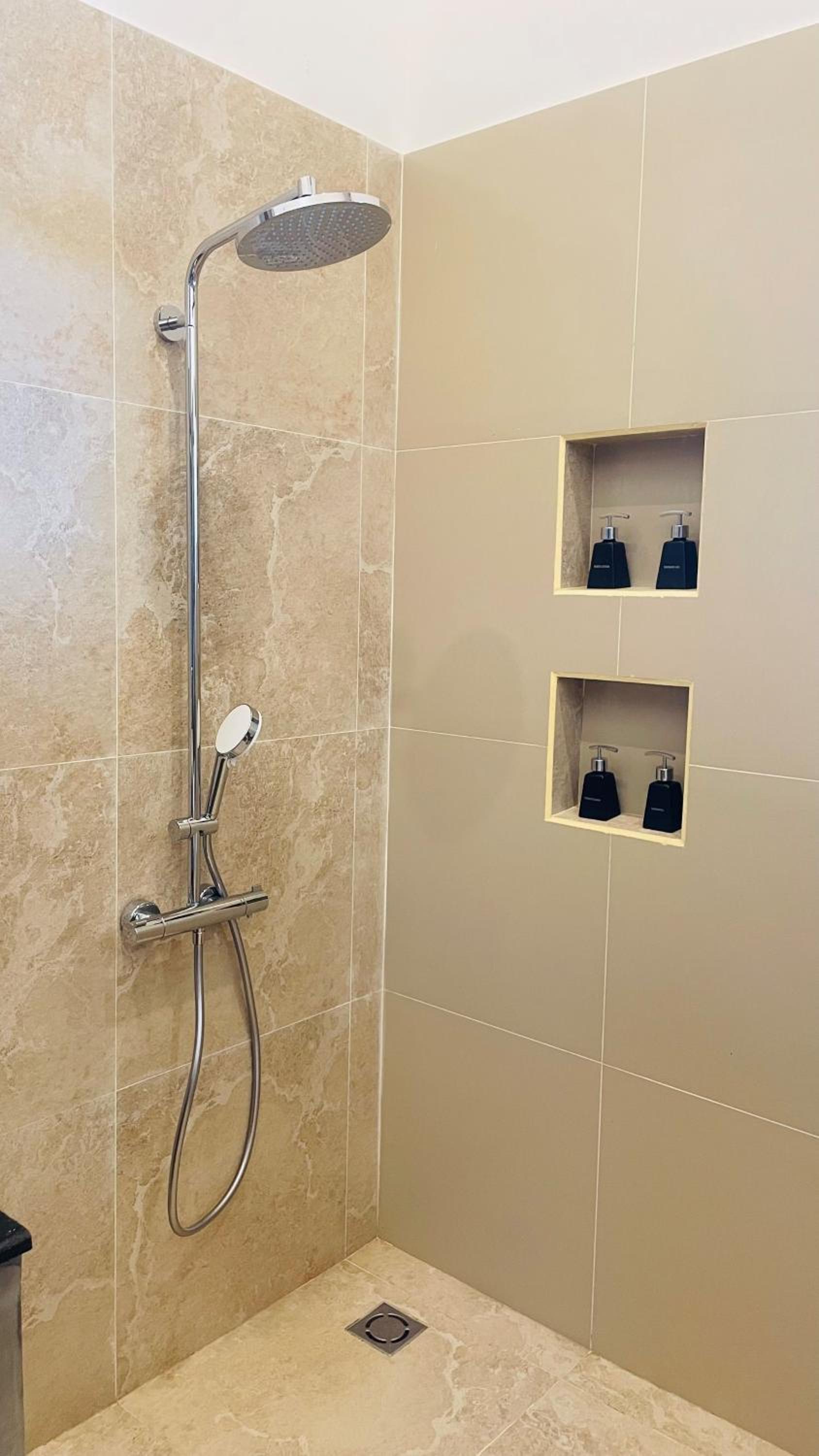 • In der Dusche fehlt eine Ablage für Shampoo, Duschgel etc.