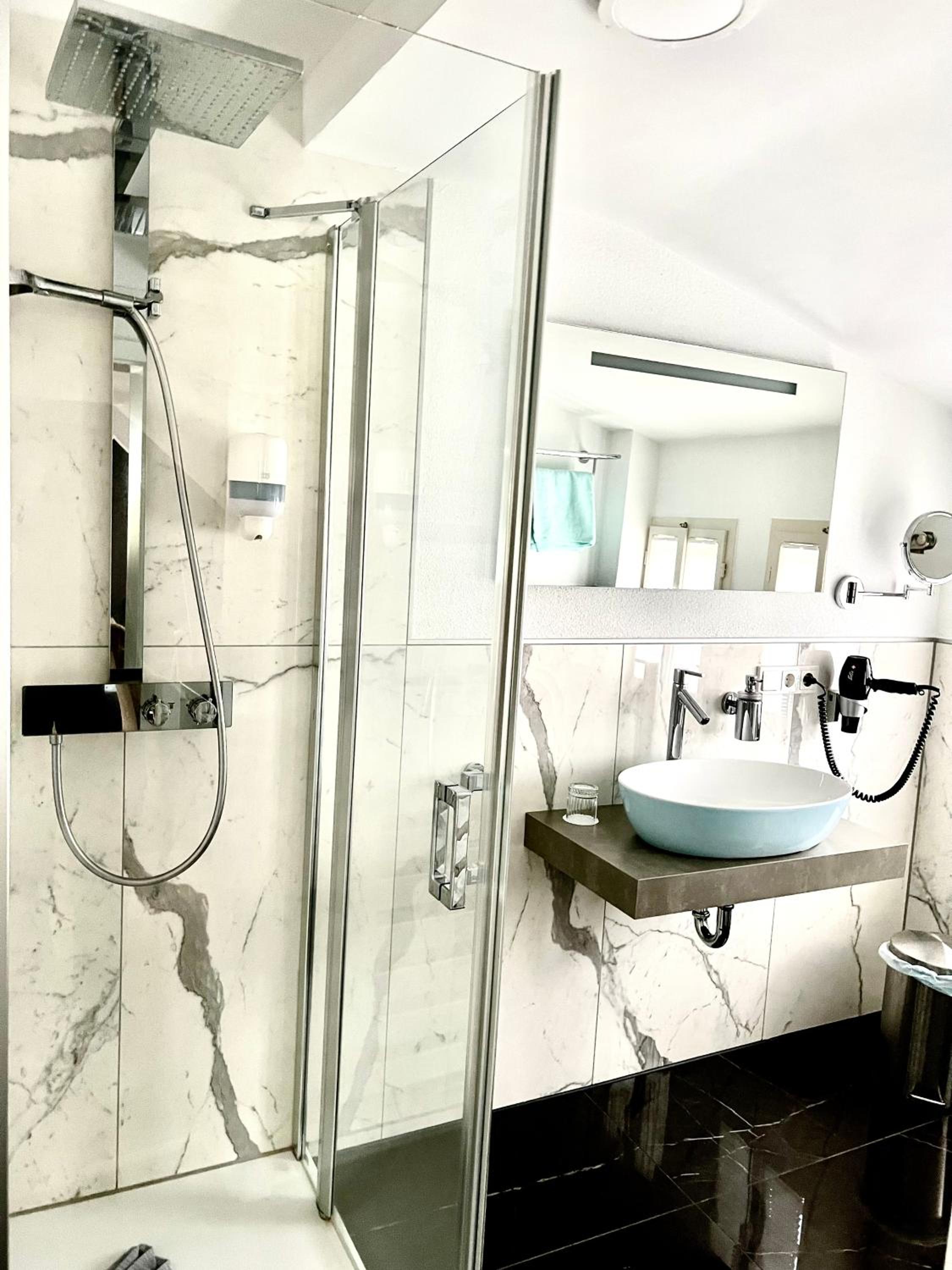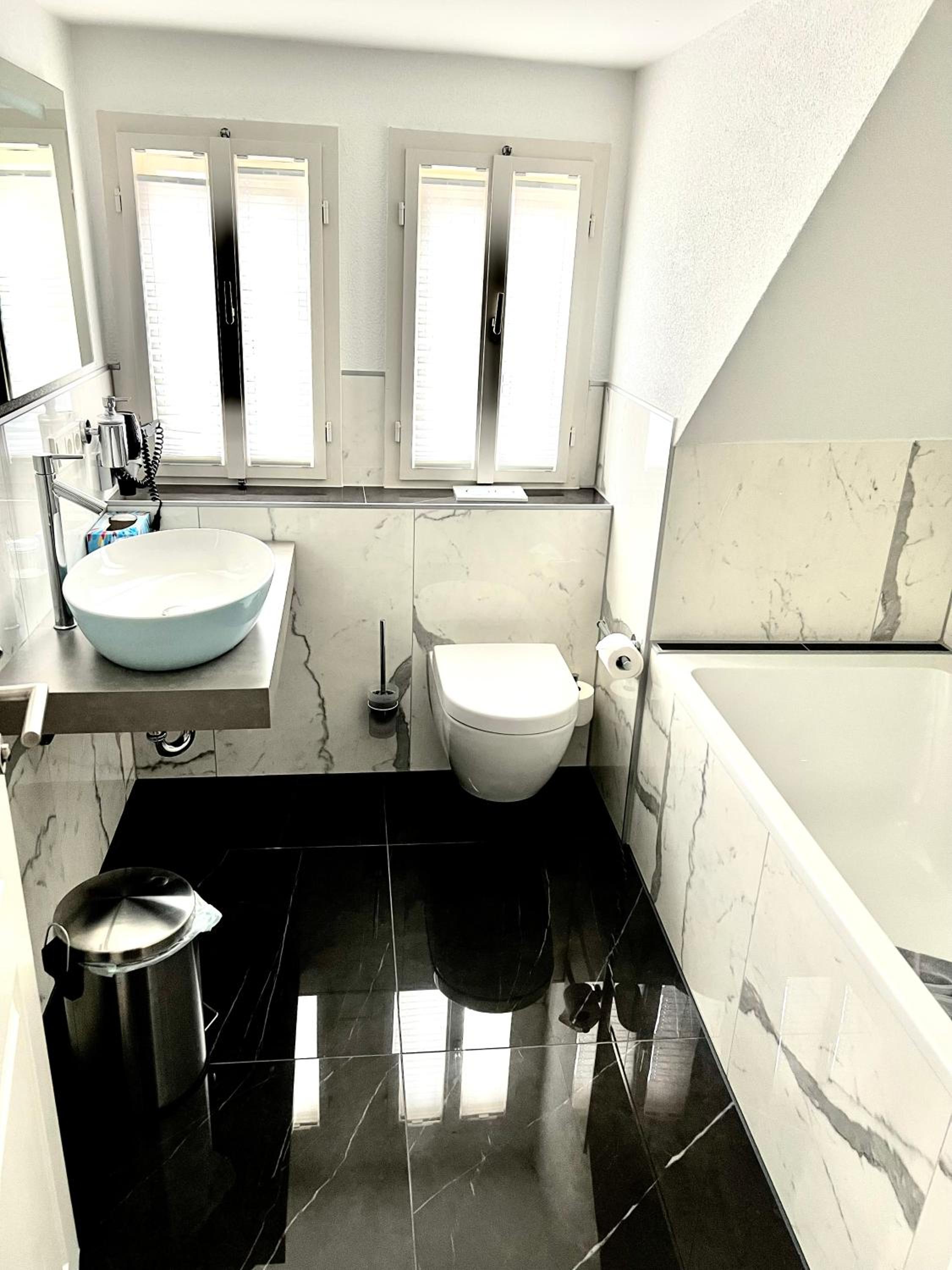 Das Bad ist hochwertig und geschmackvoll ausgestattet.