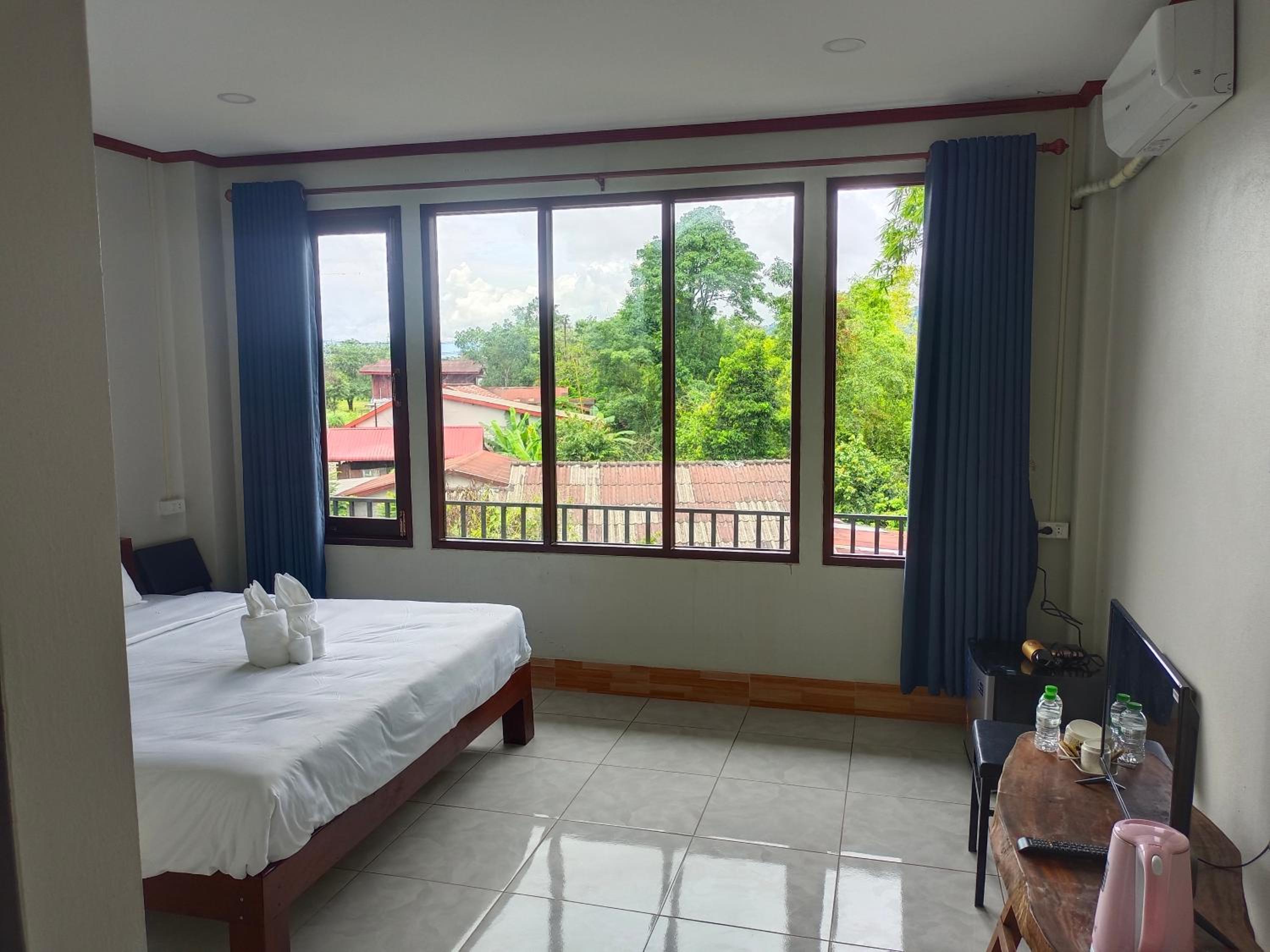Gute Ausstattung (in Laos nicht selbstverständlich), wir hatten sogar Stühle und einen Tisch auf dem Zimmer und einen kleinen Balkon mit Stühlen. Ich glaube, wir hatten Glück und das beste Zimmer.