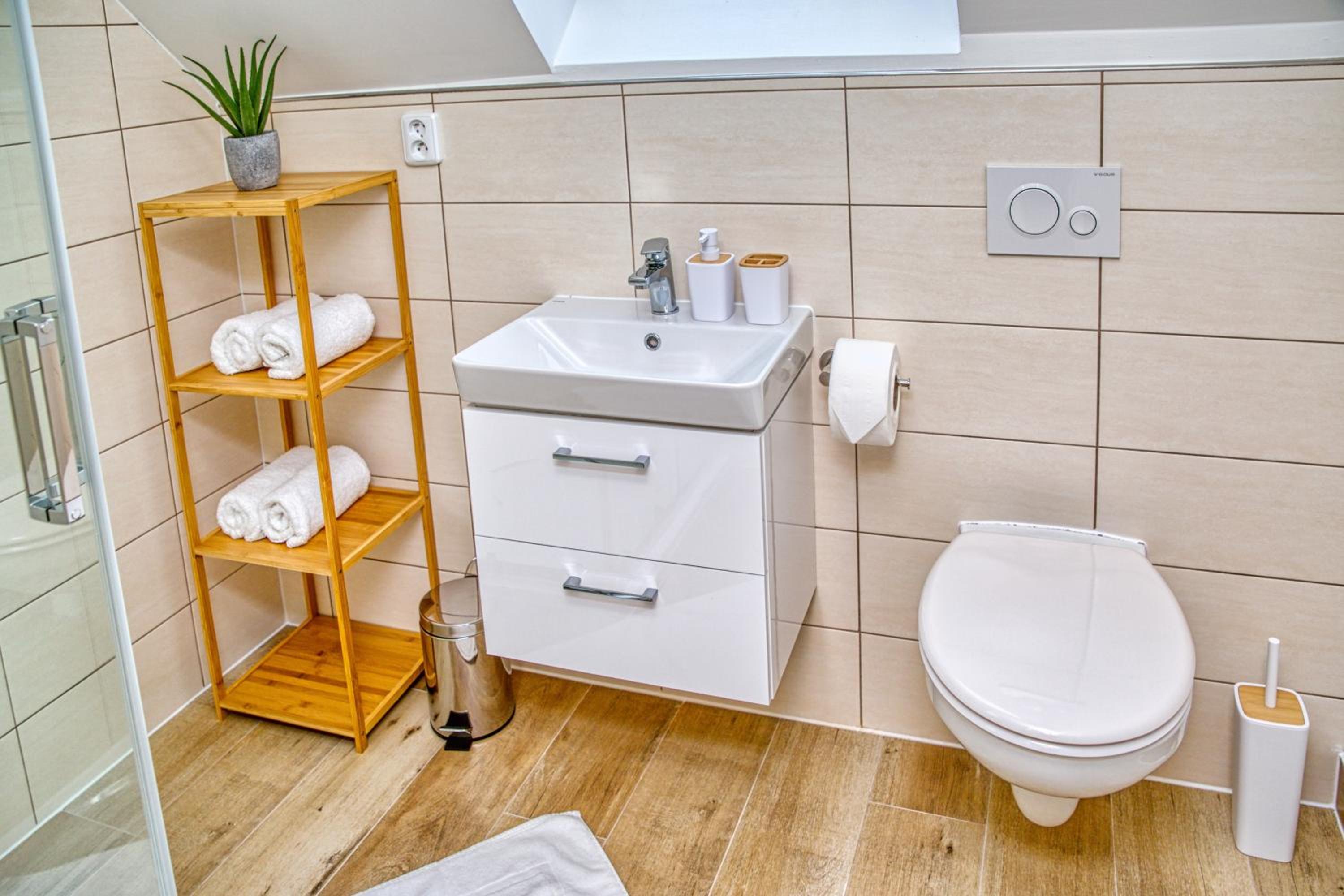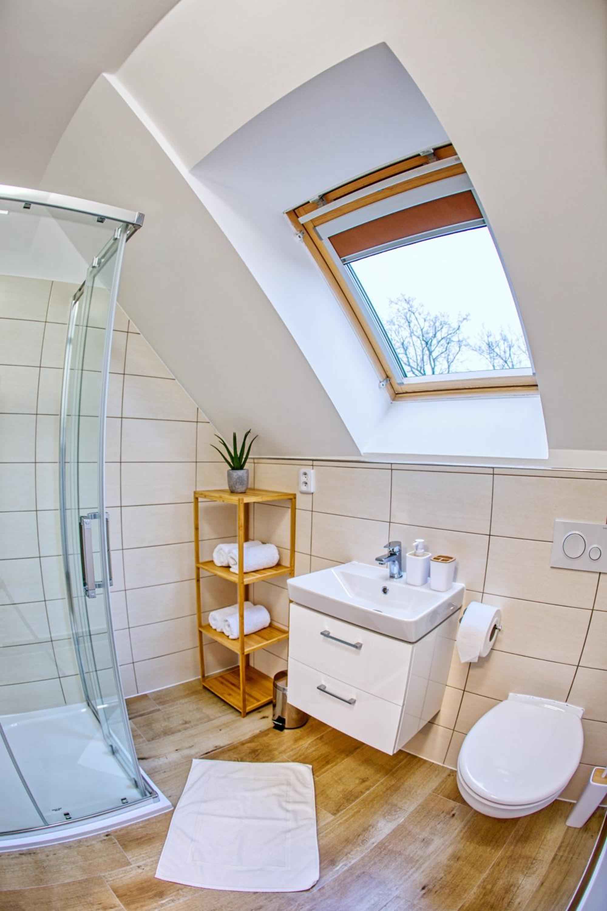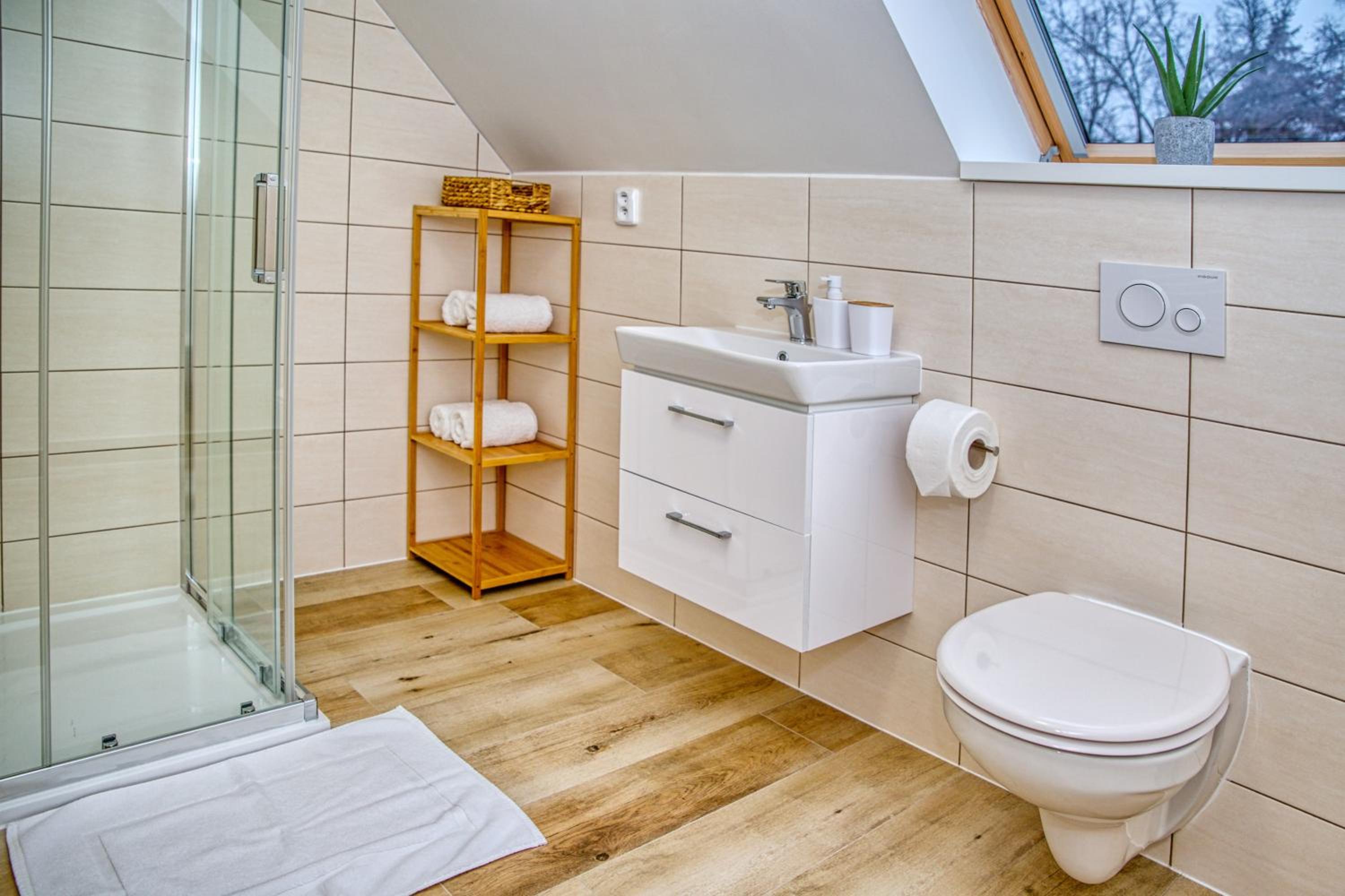 Ve sprchovém koutě chybí polička na mýdlo/gel, ale to je drobnost.