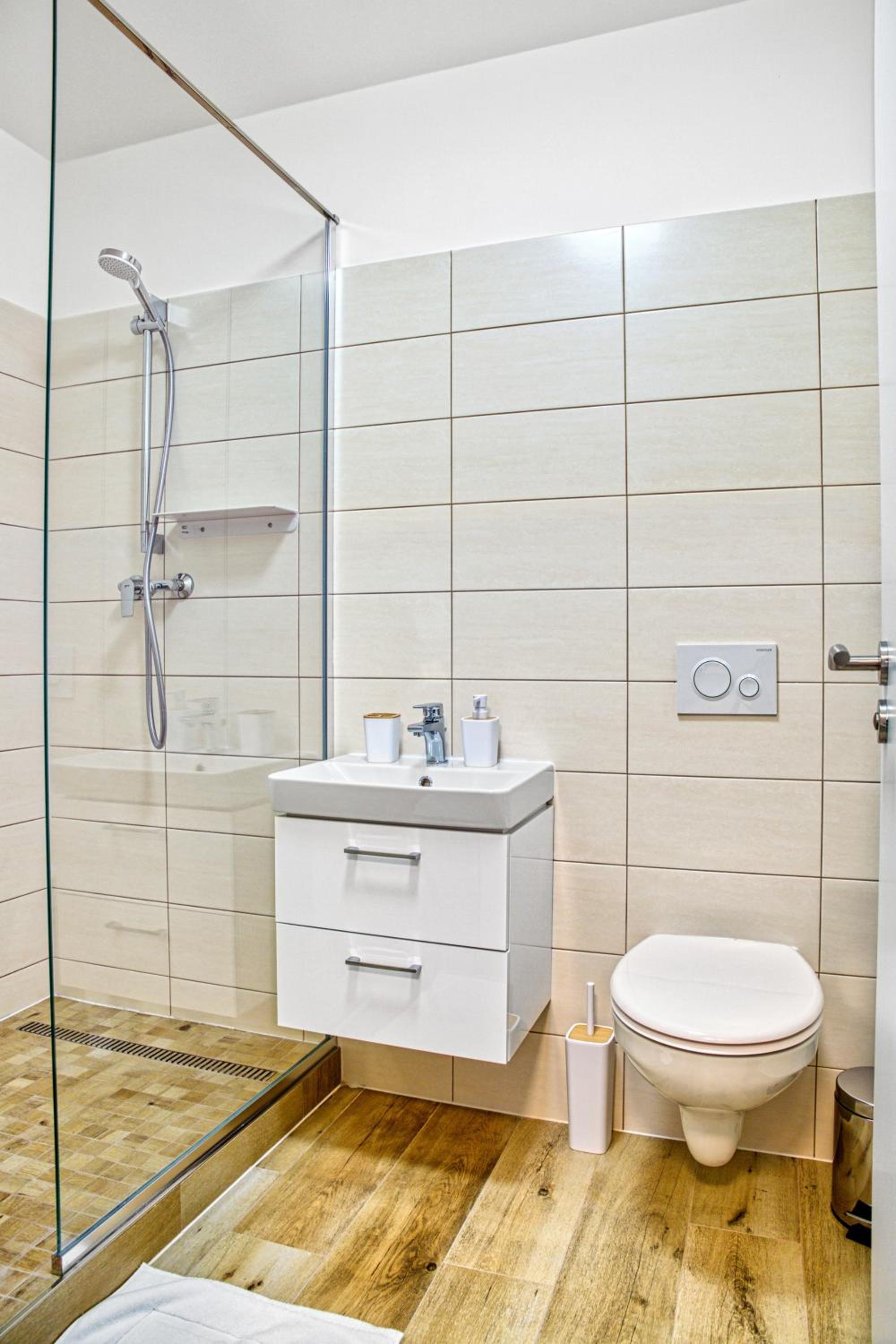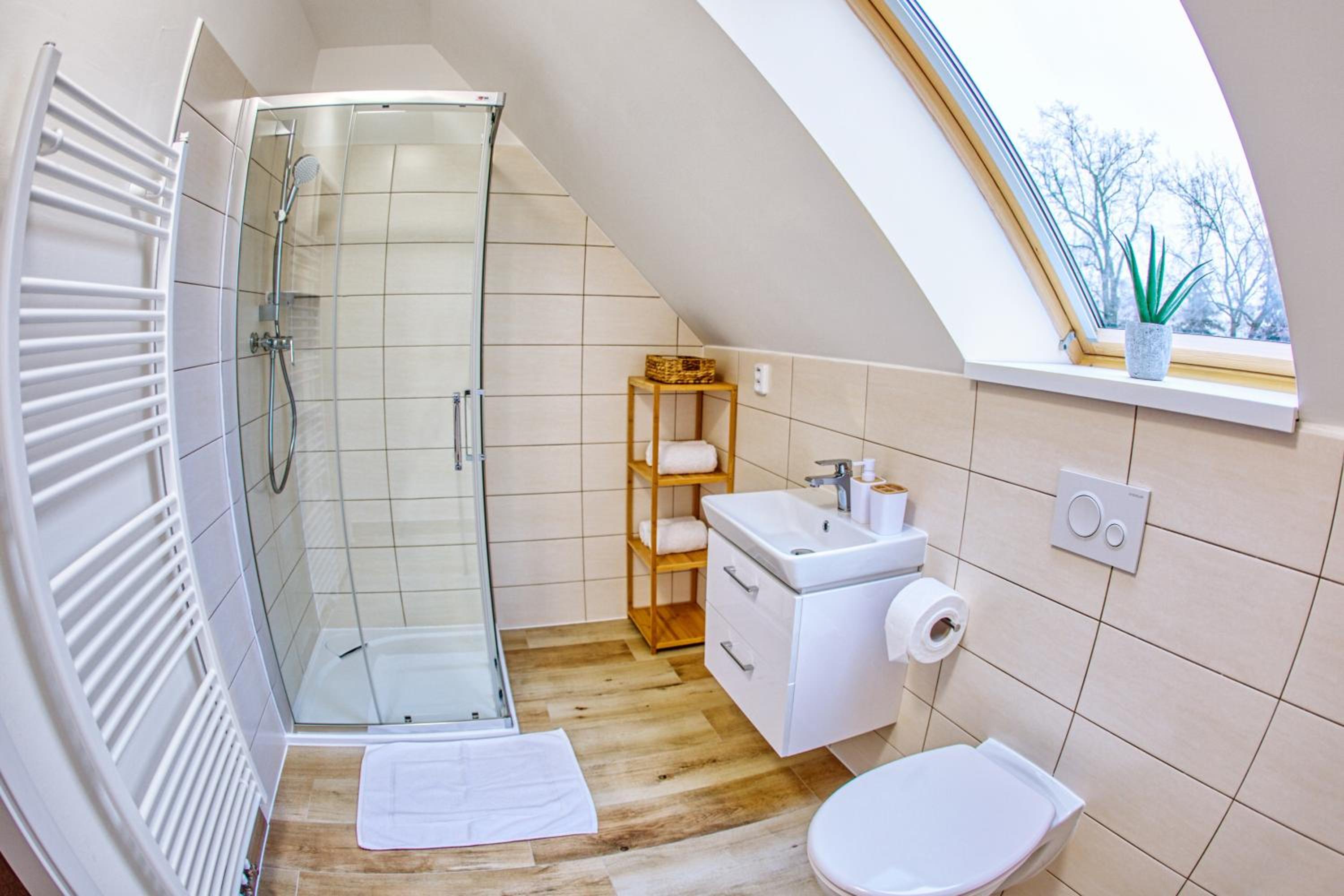 Maly sprchovy kout, ktery mel navic potiz s odtokem. Chybejici heslo na wifi.