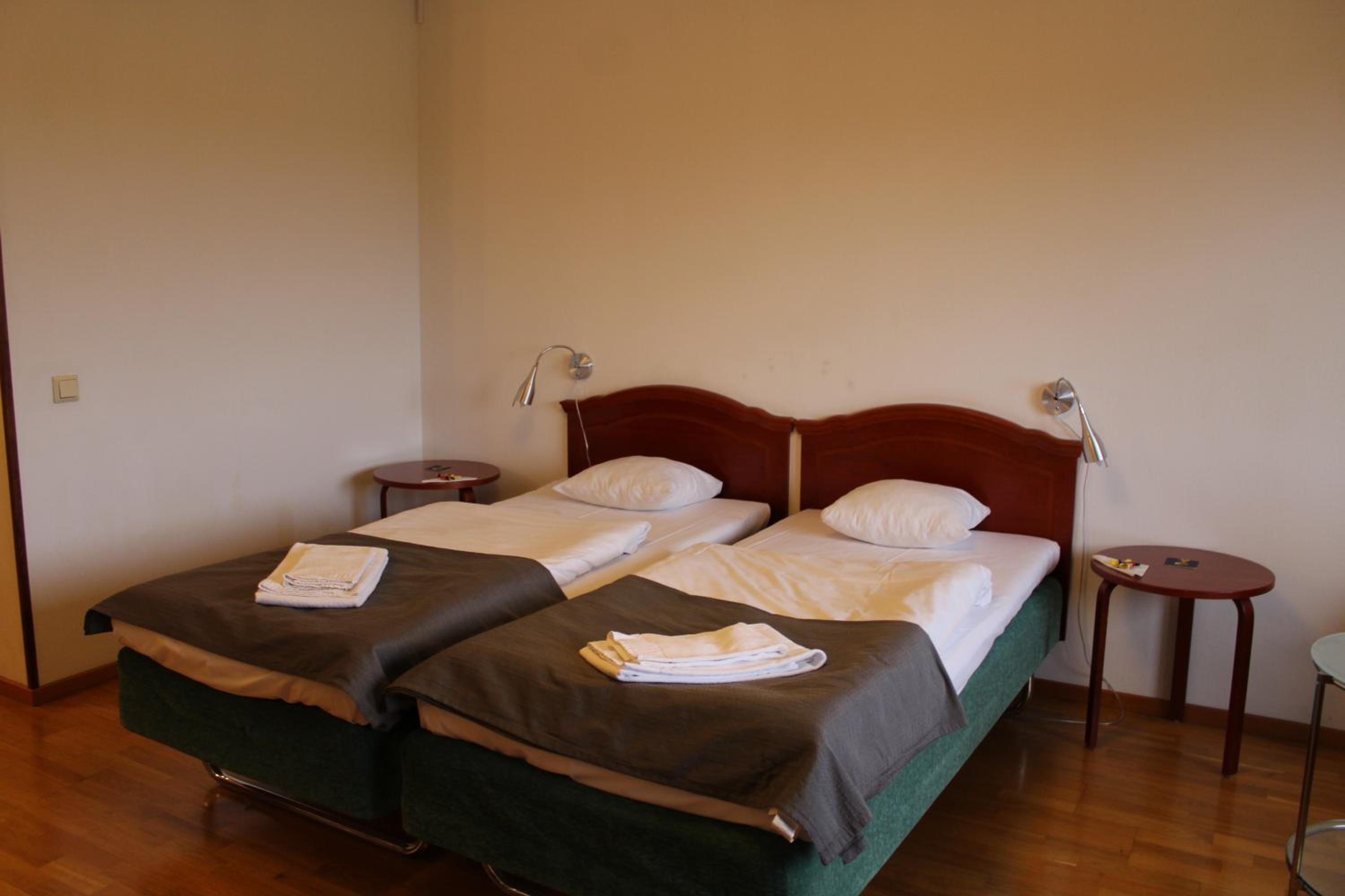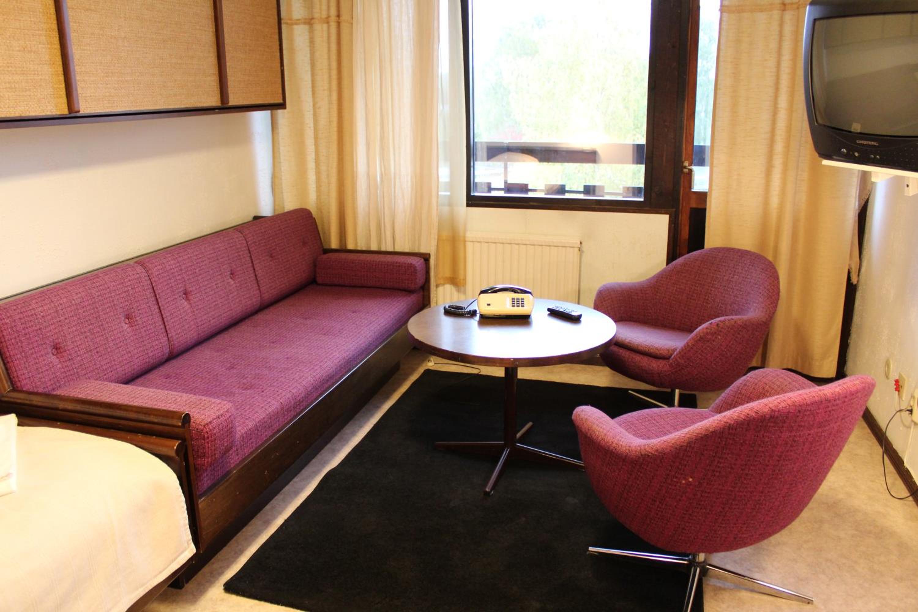 Förmodligen ett 60-tals hotell med 60-70 rum som hade sina fornstora dagar som magnet med danspalats och restaurang. Idag rätt öde, restaurangen stängd, begränsade öppentider i receptionen men centralt, bekvämt och med en servicevilja. Jag kom sent och ägaren drog igång ugnen och värmde en fryspizza till mig.