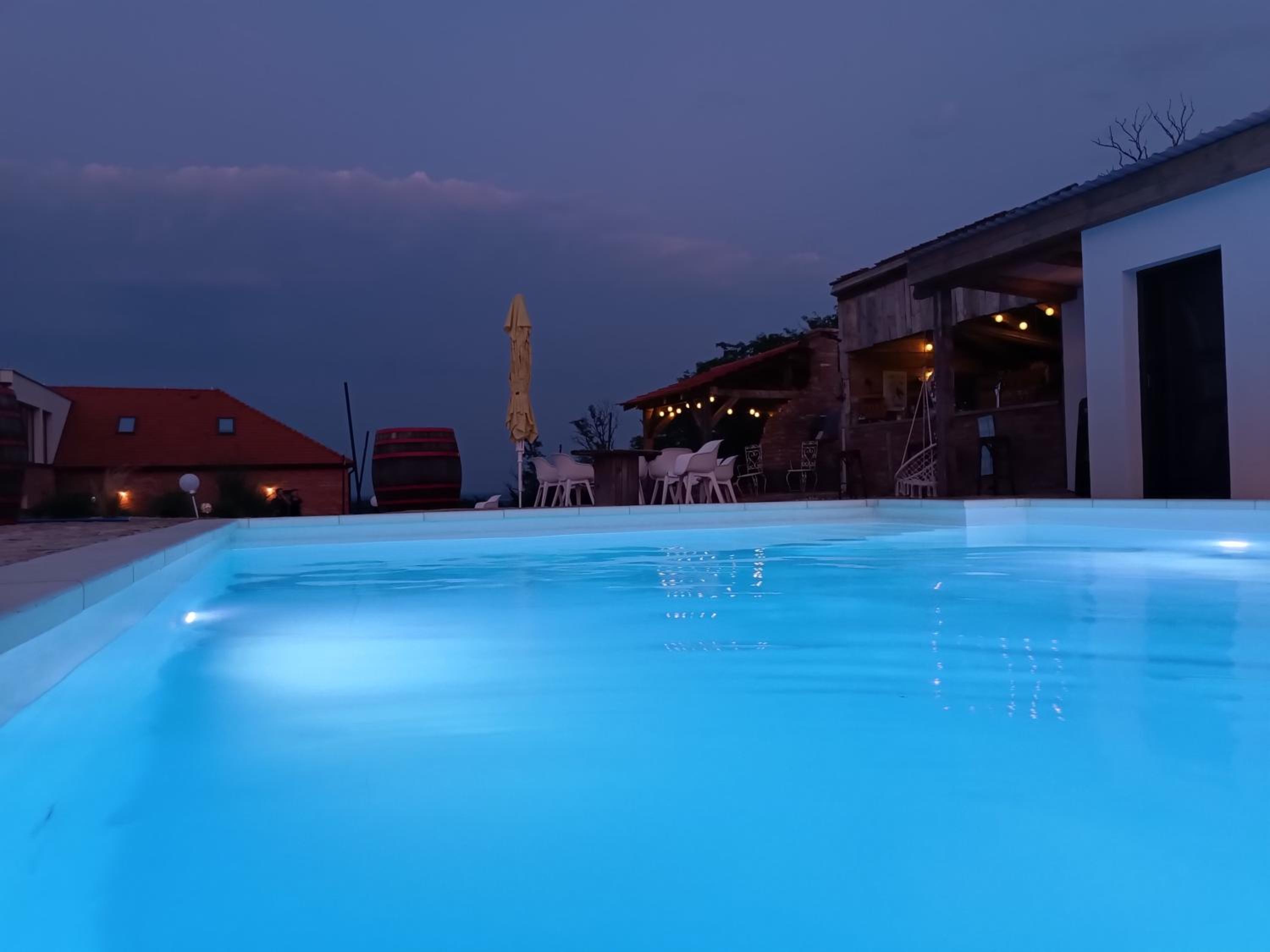 The outdoor pool by night and the jacuzzi