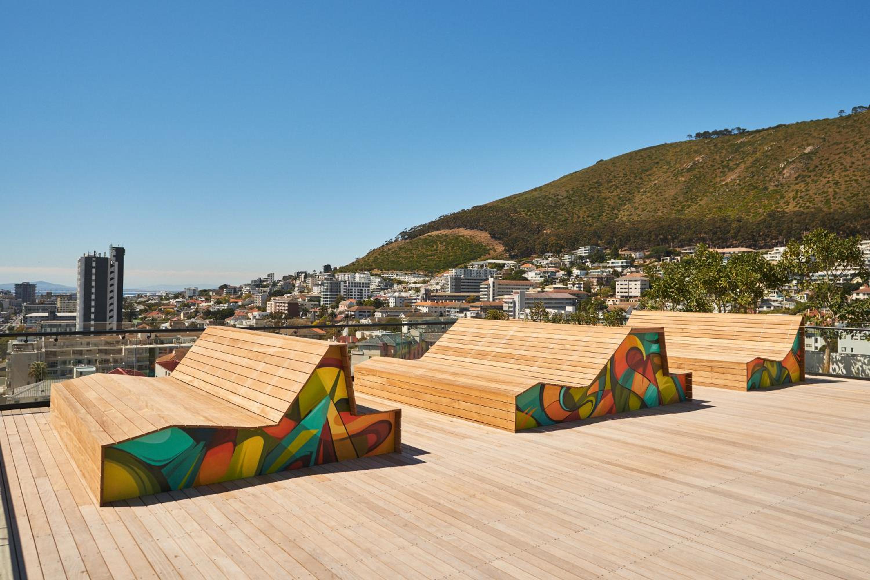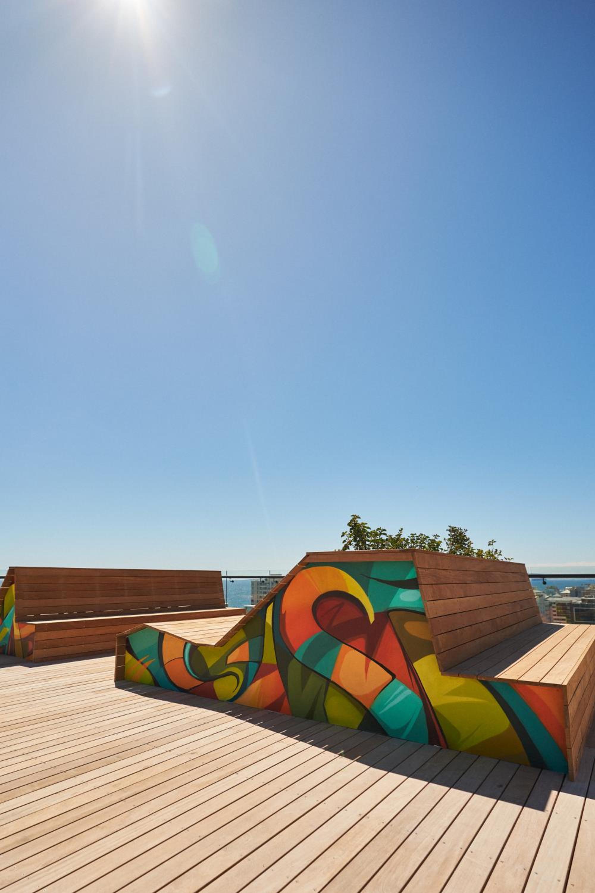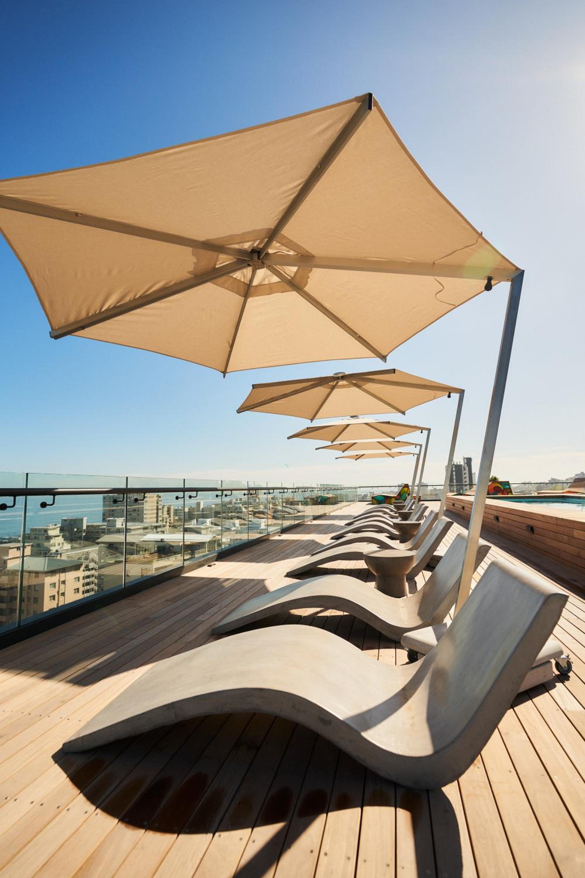 Хорошее месторасположение. На крыше бассейн и зона с лежаками с прекрасным видом на океан и горы.