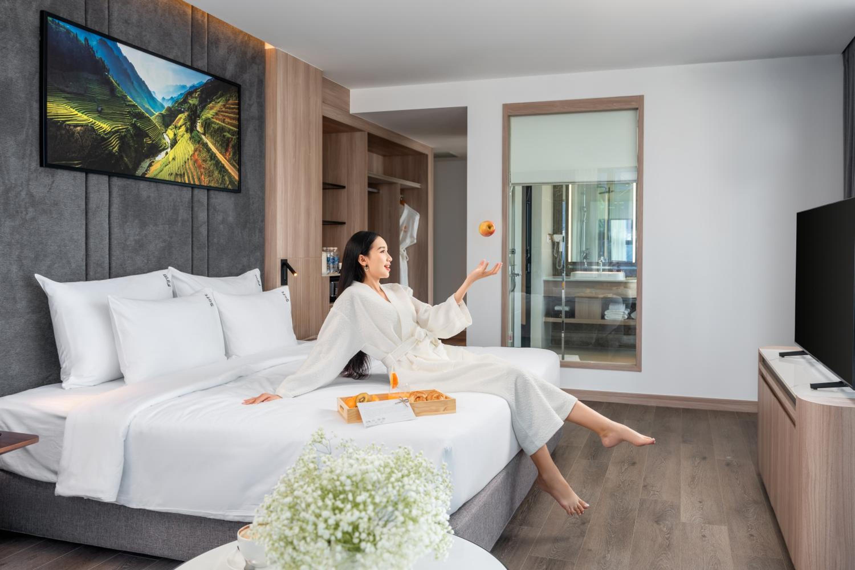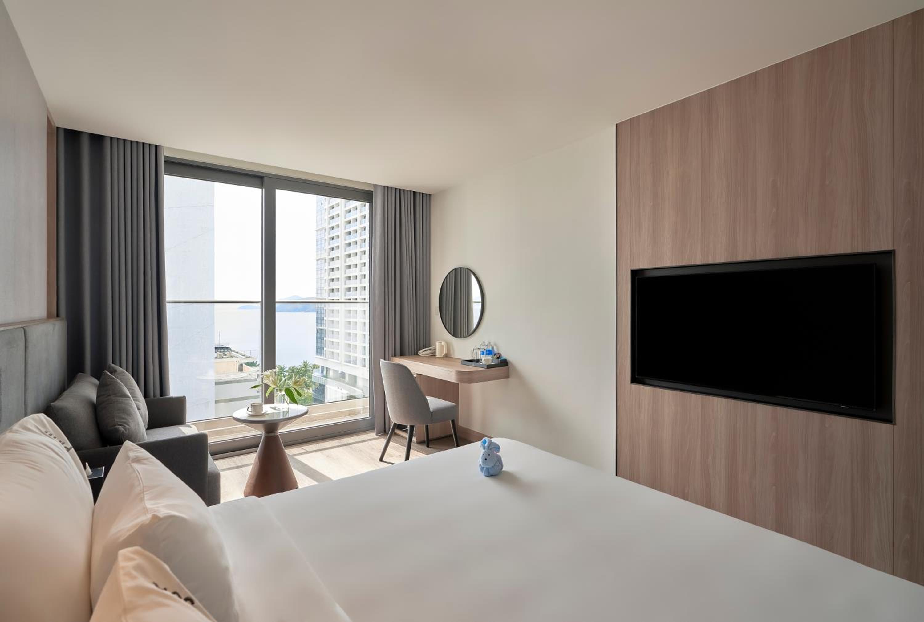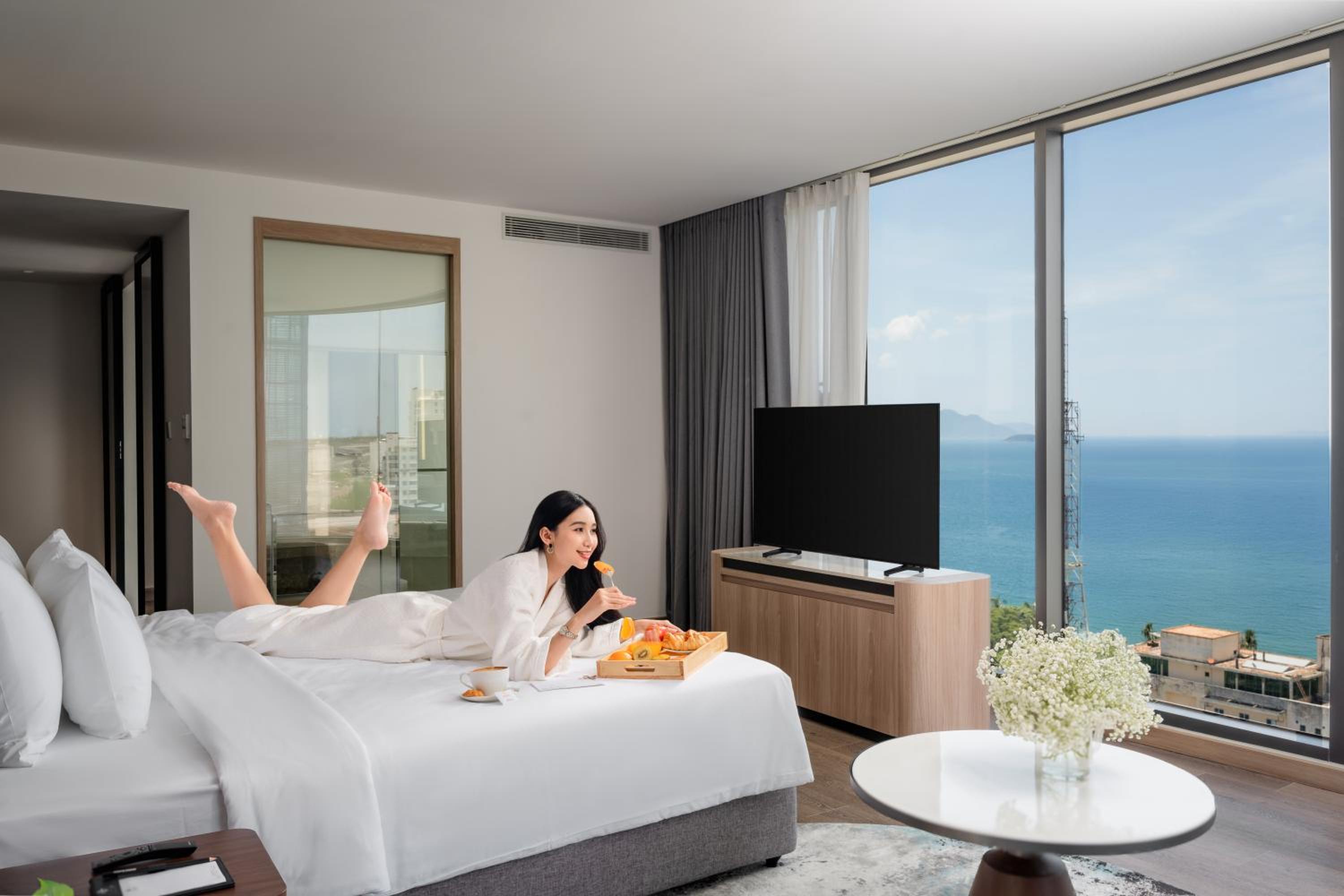 Мы жили в комнате - люкс с видом на море, красивое панорамное окно. Отличная двухспальная кровать, даже больше, очень комфортная, прекрасное постельное белье. Завтраки разнообразные, можно всегда найти то что тебе нравиться - супы, яичница, кофе, чай, свежие соки выпечка, желе, йогурт, свежие овощи и фрукты, готовые блюда из мяса, курицы и овощей. На ресепшене всегда можно решить любой вопрос. Уборка каждый день (может кроме выходных), только нет определенного времени уборки - приходили убирать то в 10-00, то в 14-00. Гостиница новая, не давно открывшаяся, мы были в 2026 году, чистая, все новое. На 21 этаже бассейн и бар работают до 21-30. На ресепшене работает кафе, в нем очень вкусный кофе с солью.