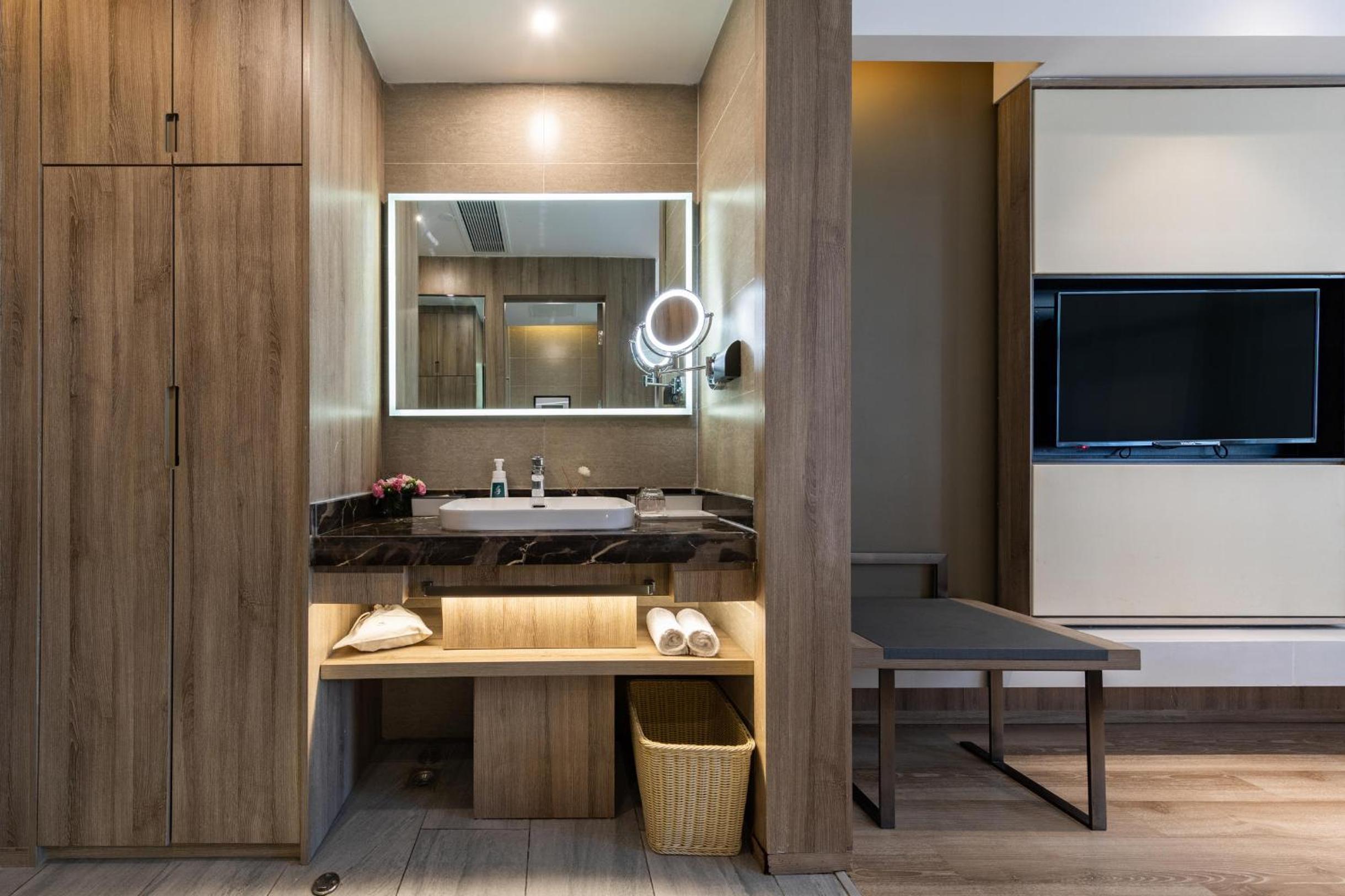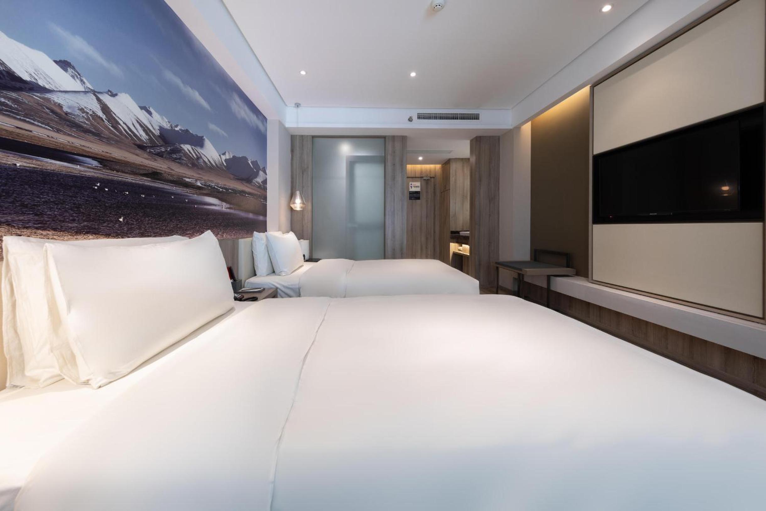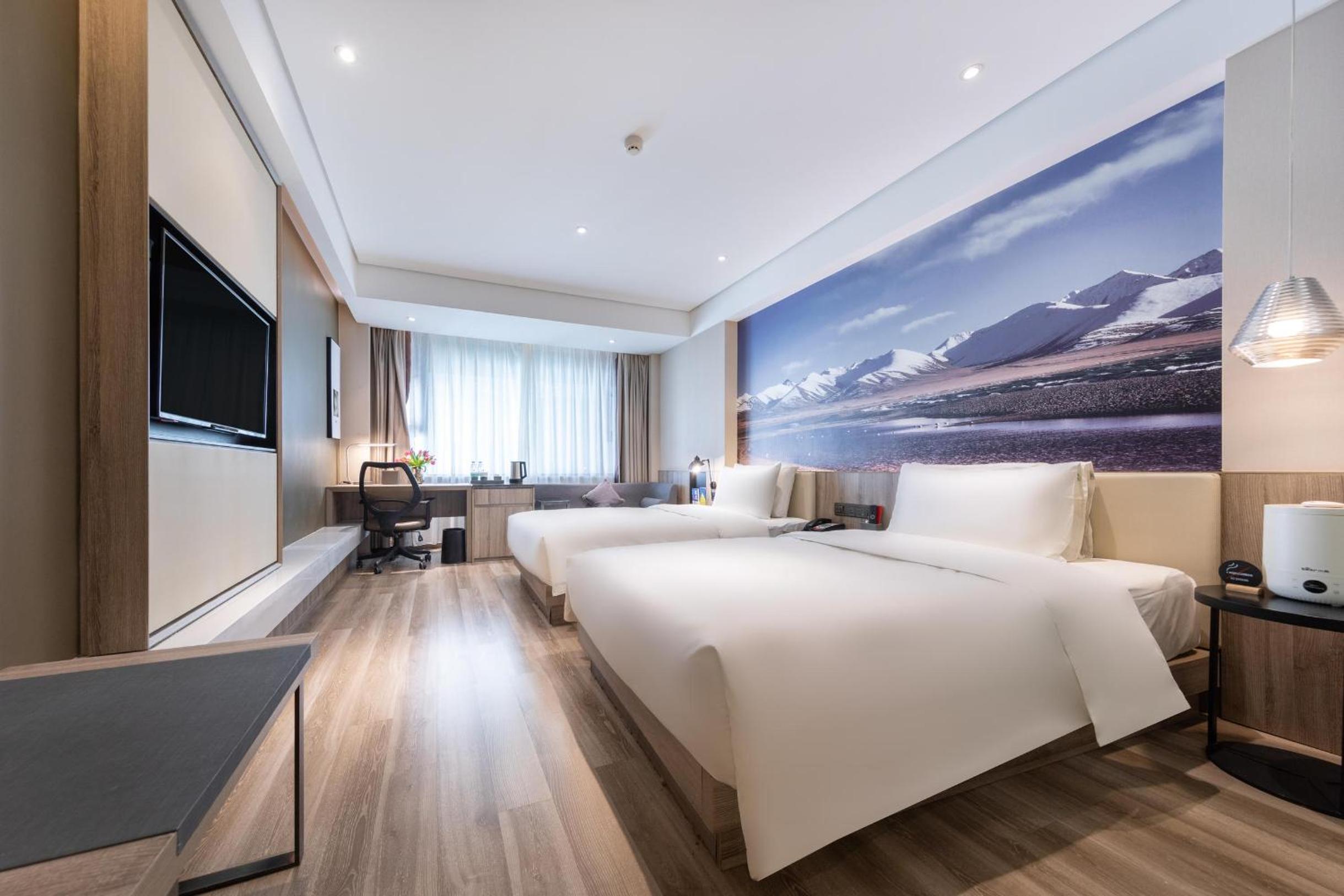 At Atour Hotel Potala Palace Lhasa, indulge in air-conditioned rooms with modern amenities including a flat-screen TV, a cozy seating area, and a sleek private bathroom.