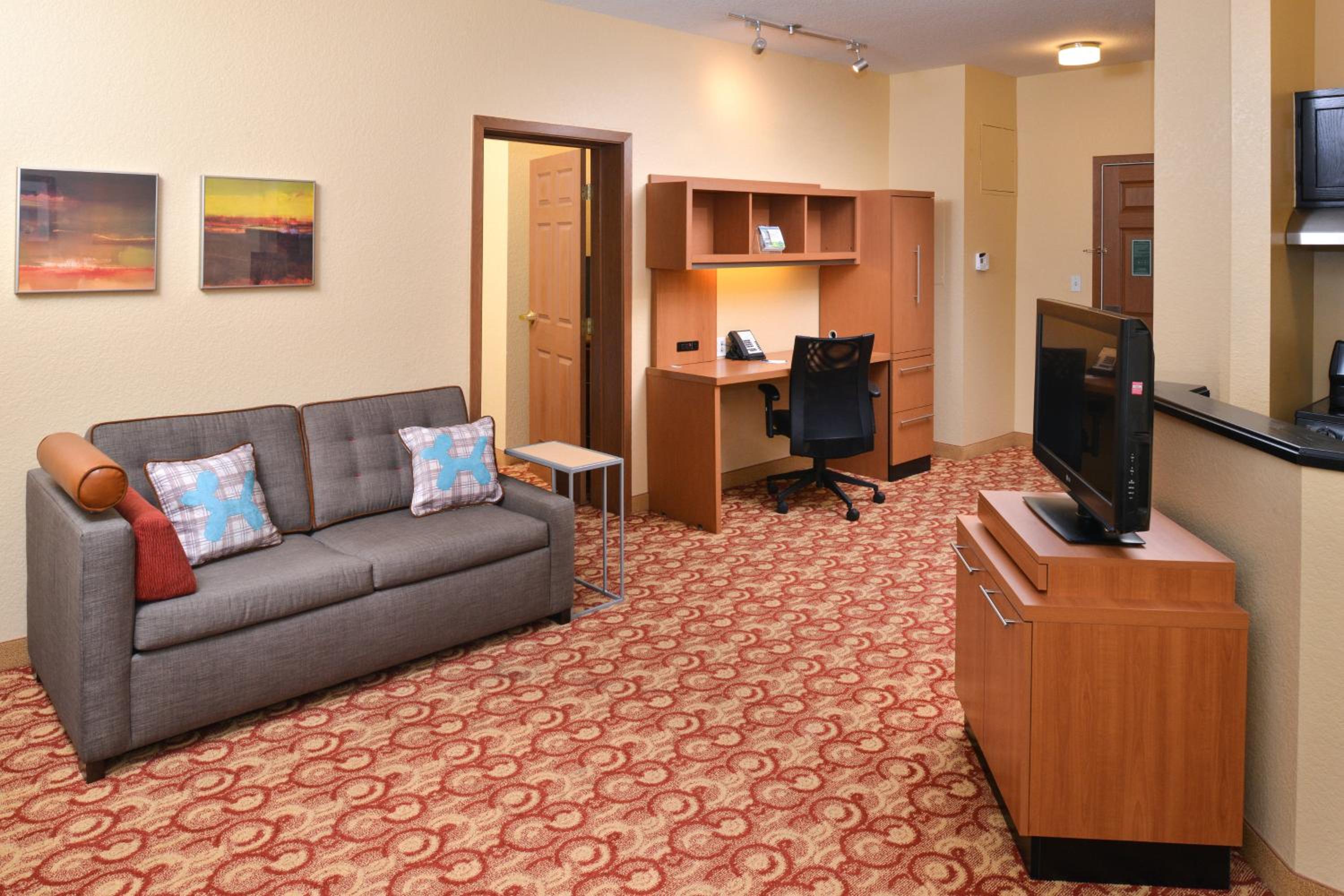 The suites at TownePlace provide a cozy ambience with fully-equipped kitchens, living rooms, and modern amenities like free internet and cable TV.
