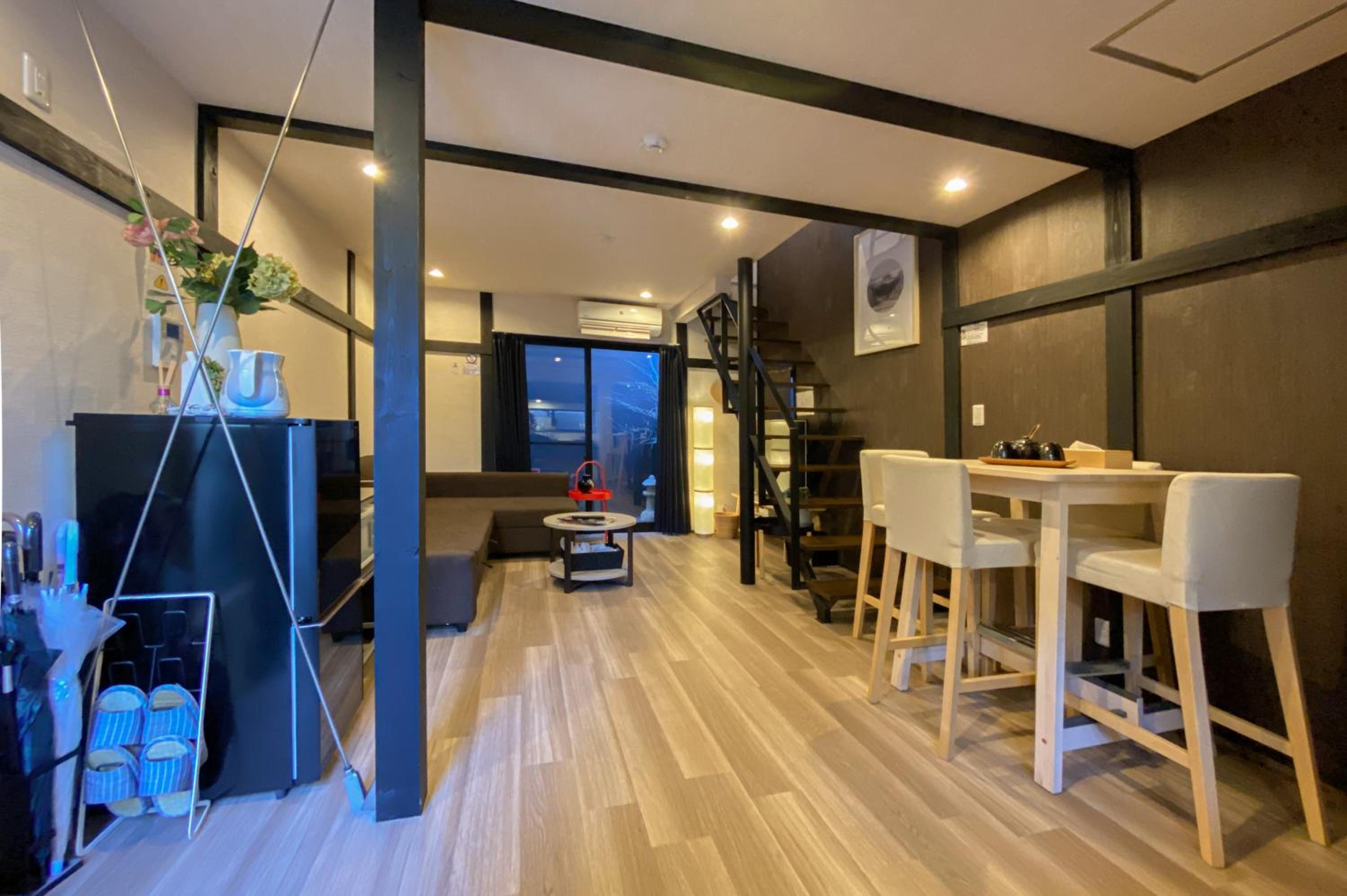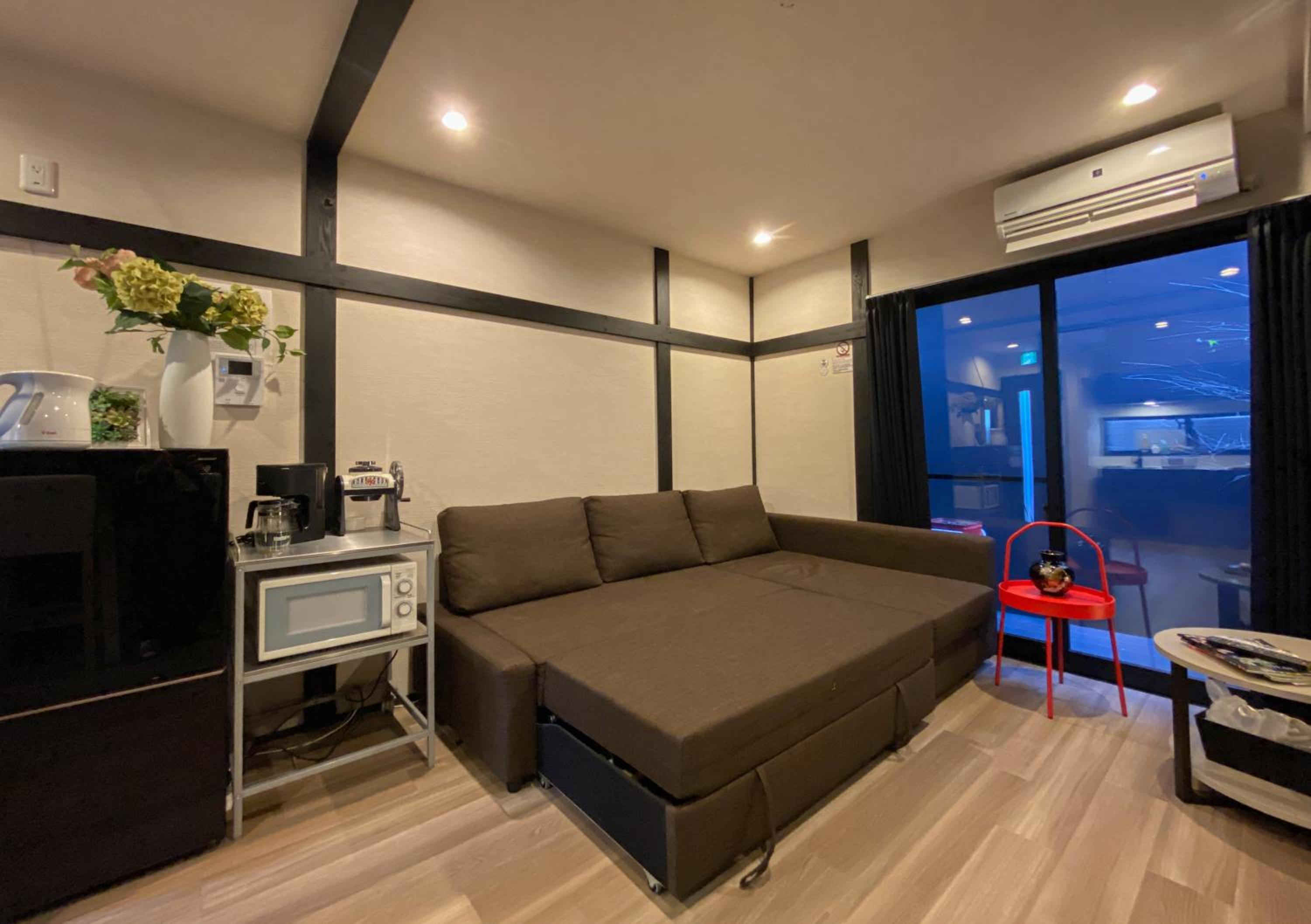 Unwind and relax in the peaceful garden area, a perfect retreat after a day of exploring the nearby Kaichu Inari Shrine, Kanda Josui Park, and Choko-ji Temple.