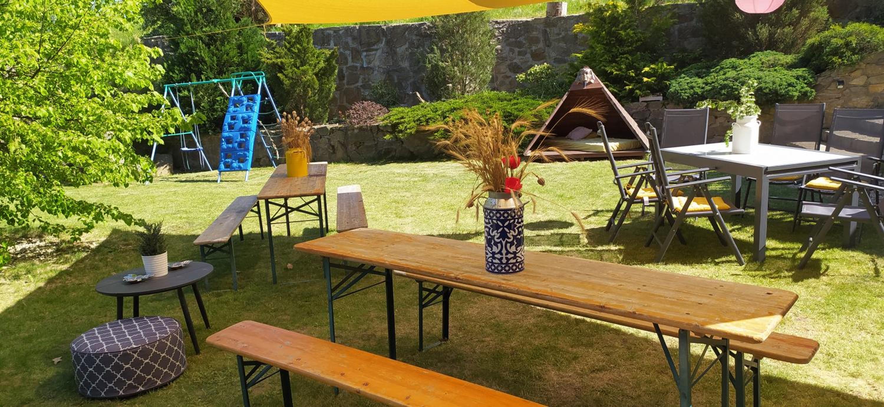 Enjoy the lush garden views and relax in the tranquil setting of Spaní na včelách. The shared lounge and outdoor play equipment offer a perfect retreat for guests of all ages.