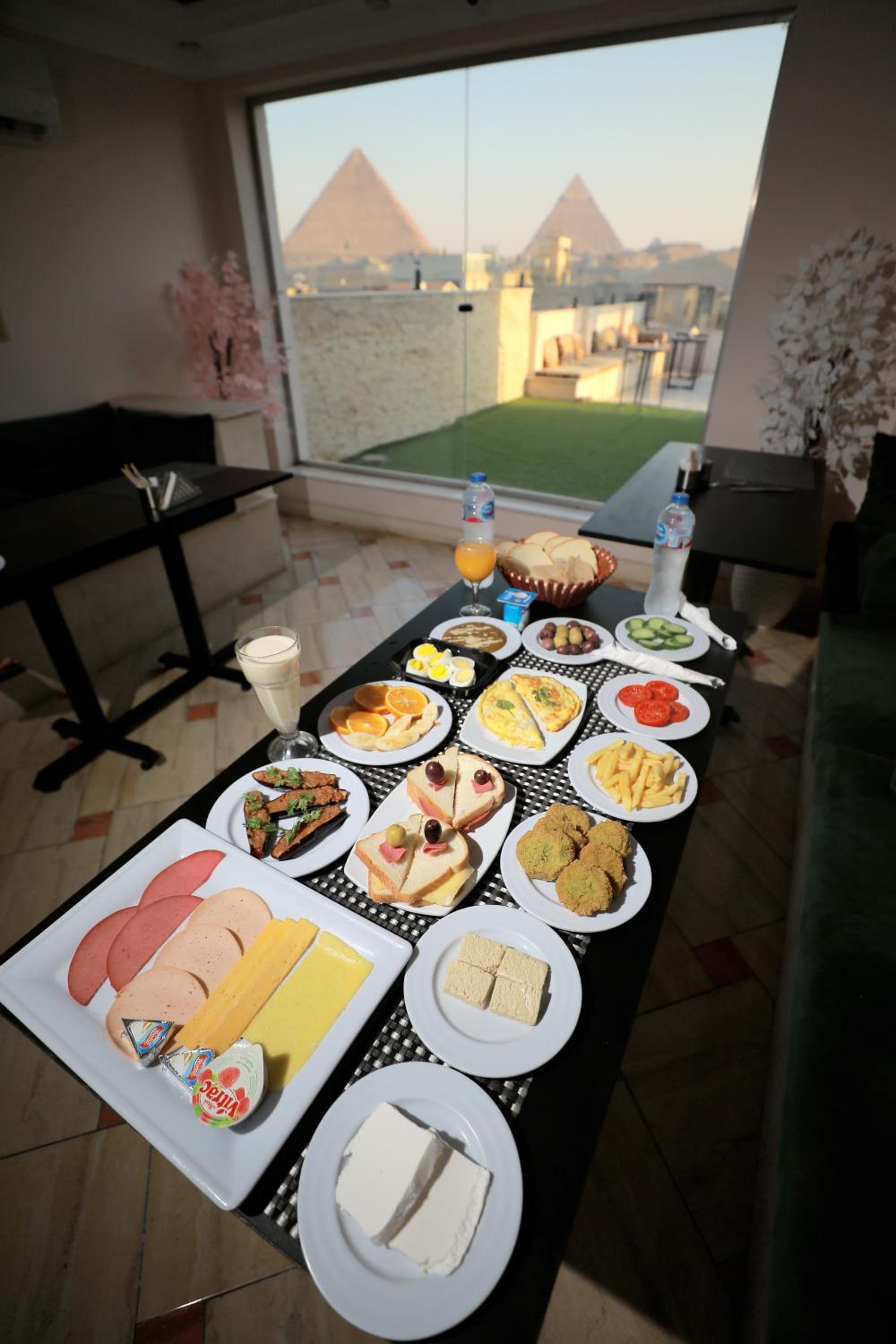 Établissement bien situé avec vue sur les pyramides. Grosse pensée à sameh, il a été adorable et nous a servi de chauffeur et de guide pour la jounée pour 20€. Très gentil et drôle. Nous le recommandons si vous n’osez pas explorer la ville à l’aveugle.