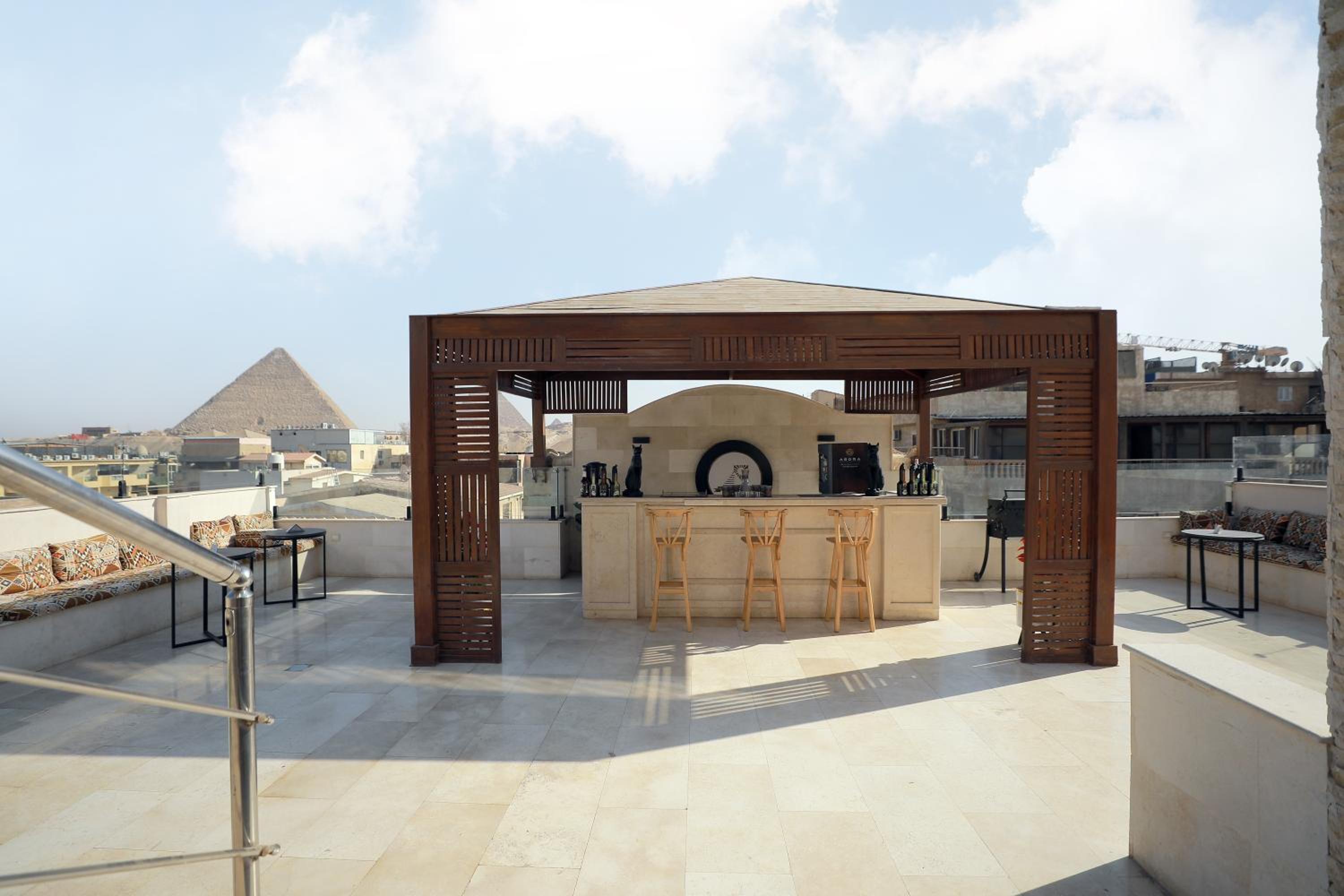 Très jolie terrasse donnant vue sur les pyramides.