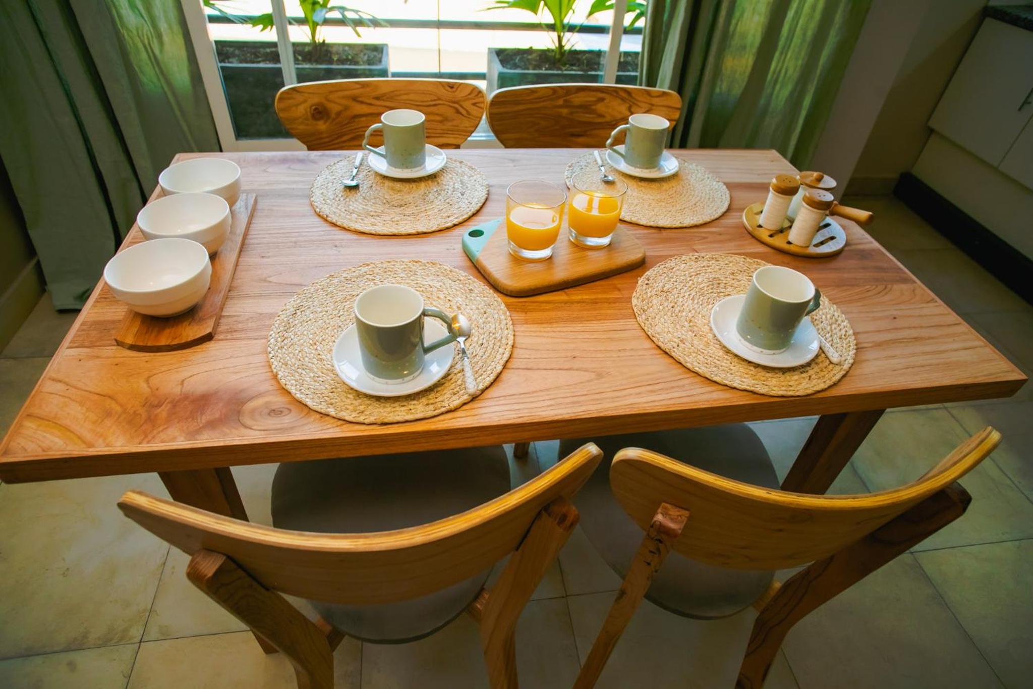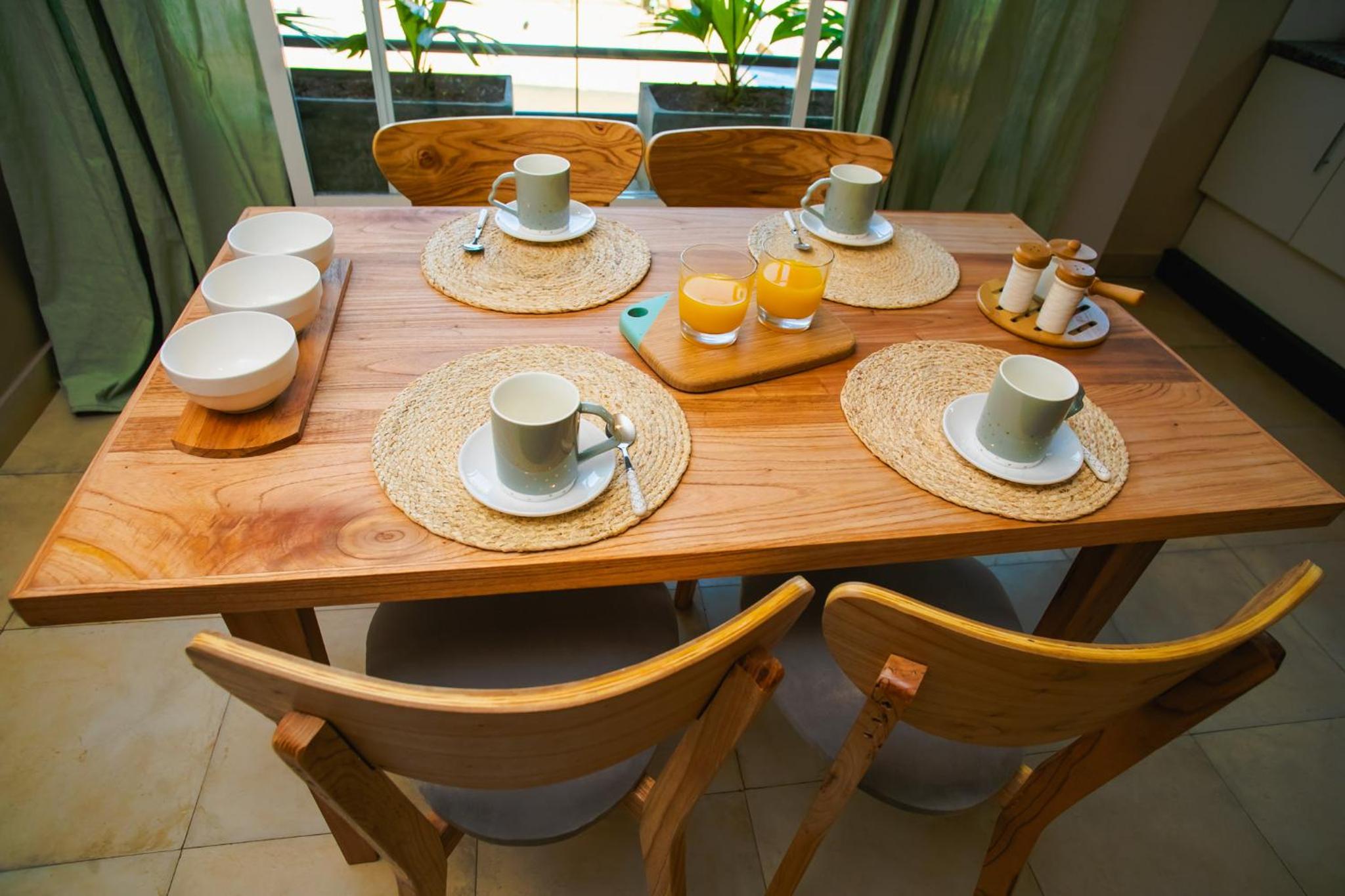 The apartment was large and clean, The breakfast was essentially a 'continental breakfast that the host left on the kitchen table and the refrigerator--juice, pastry, etc. Fixings for coffee and tea were available. The bed was comfortable. The staff came in after two days to refresh the breakfast offering. The location of the apartment was perfect, It is only a few minutes' walk from the busy parts of town, but is far enough away to be quiet at night. The building is stylish and secure behind a locked gate. Bottled water was available in the hallway. The pool area was attractive.