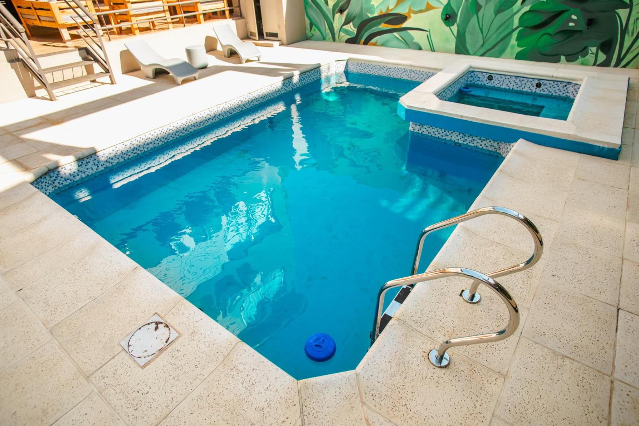 Unwind in the hot tub or lounge by the outdoor swimming pool with views of the inner courtyard, providing a serene setting to rejuvenate.