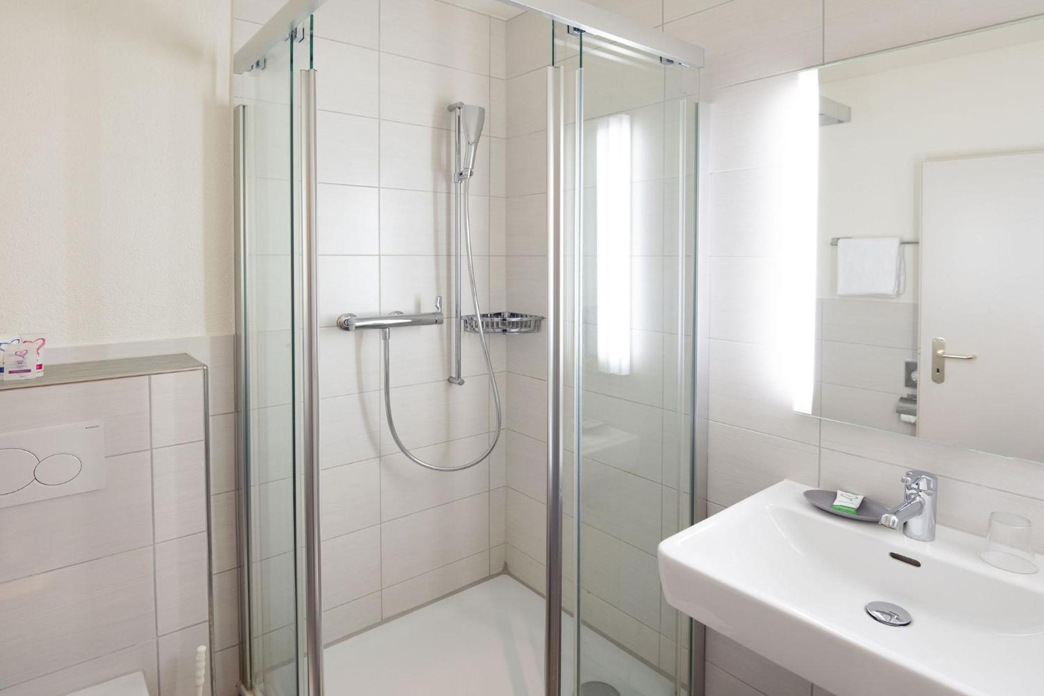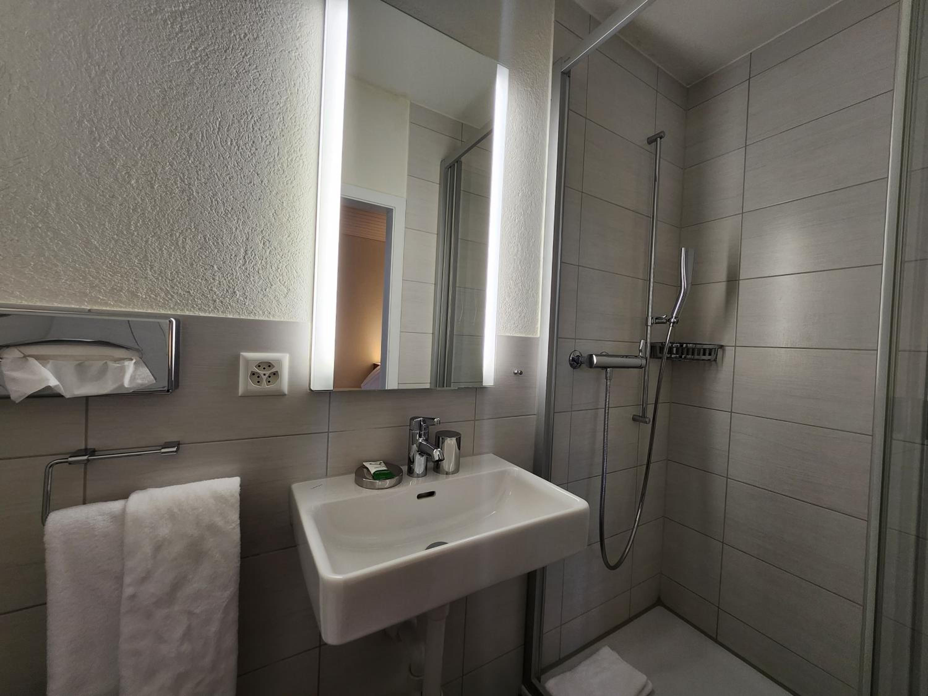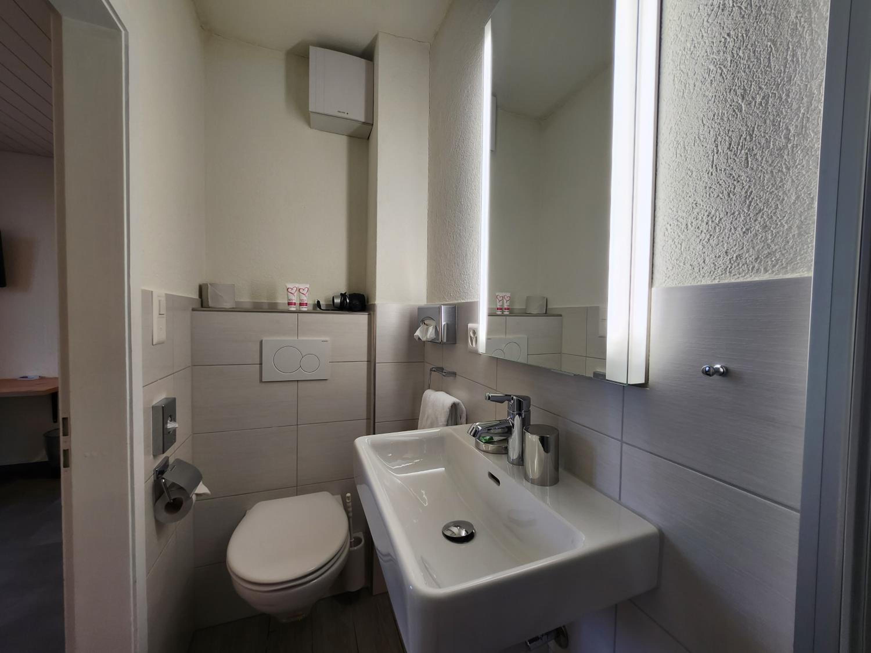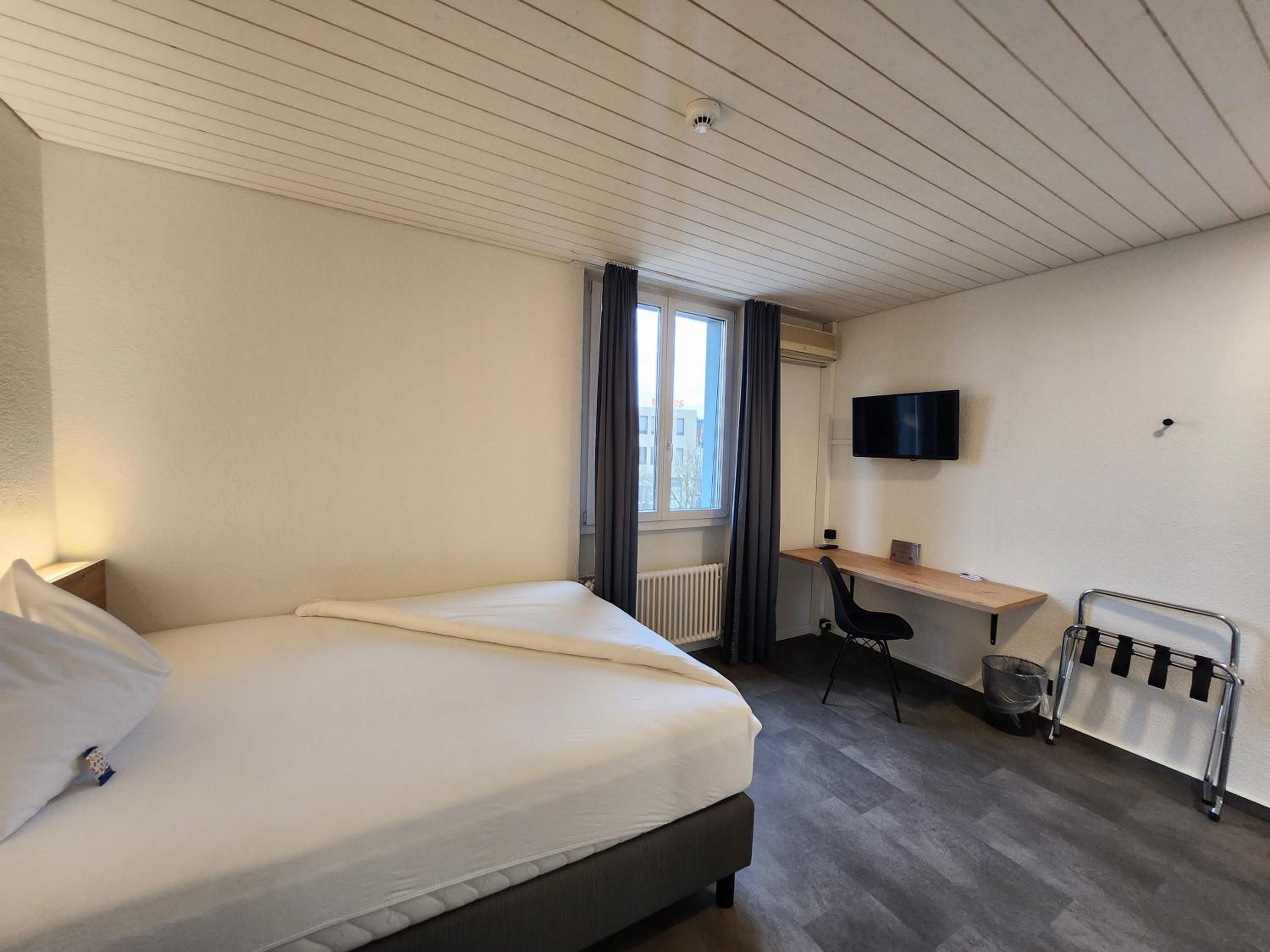 The location and parking was super convenient. We arrived late but could have the keys without any problem. The rooms were spacious. Even though the restaurant was already closed, they gave us two glasses of wine. Everything was perfectly clean, the staff was kind, the bed was huge and the breakfast good.
