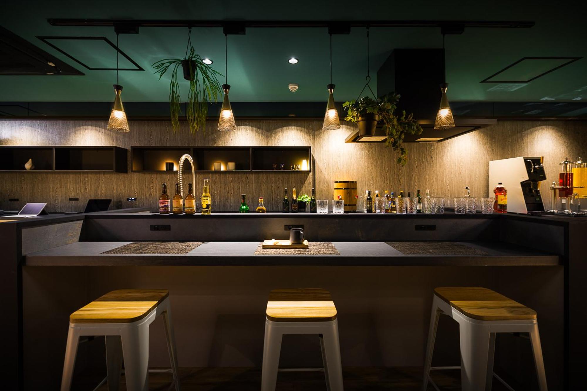 Bar a místnost pro hosty hotelu (zdarma káva, čaj, pivo, vino, sušenky, popcorn, ráno pudink...).
