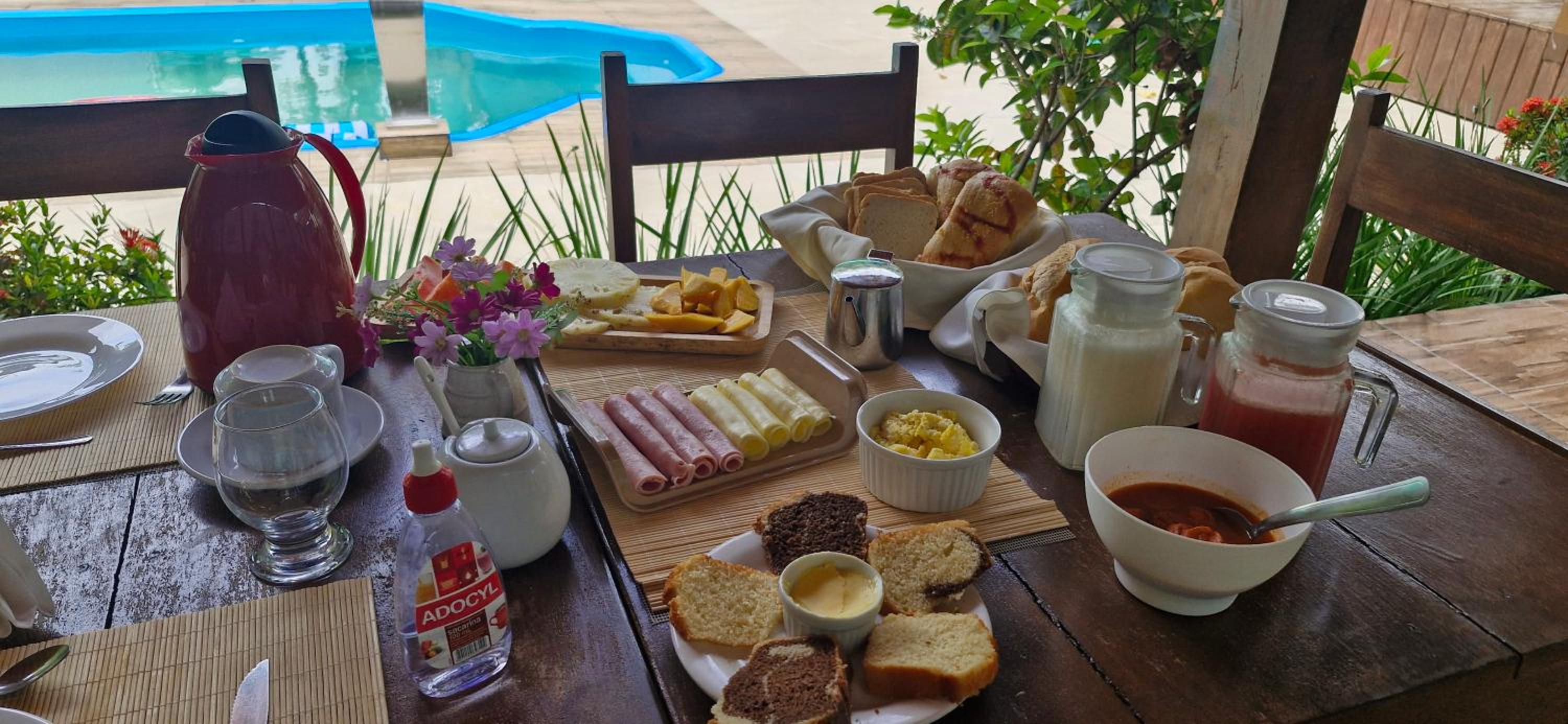 Café da manhã é servido na mesa, farto e com bastante diversidade.