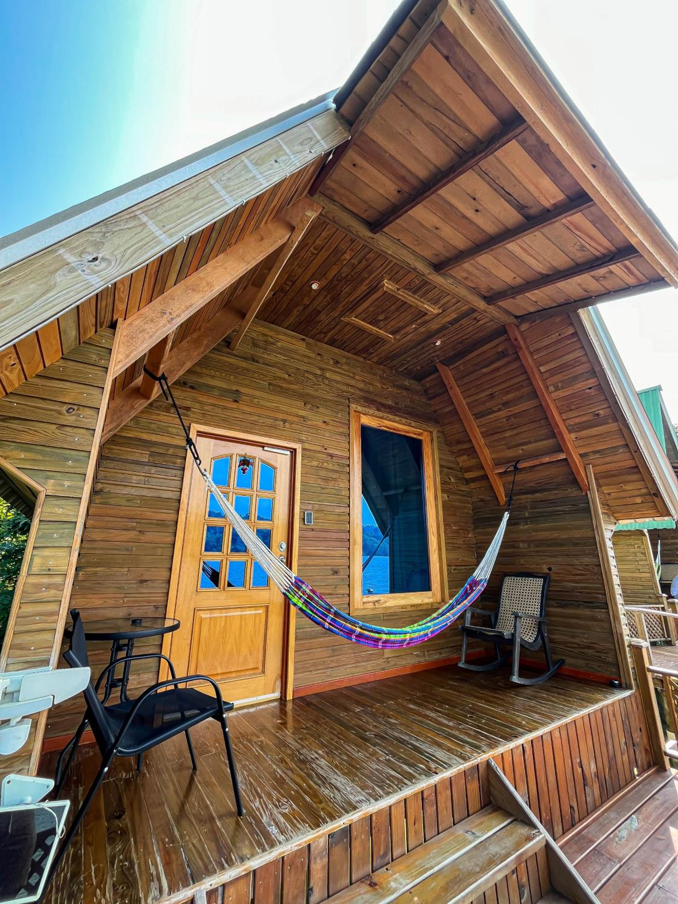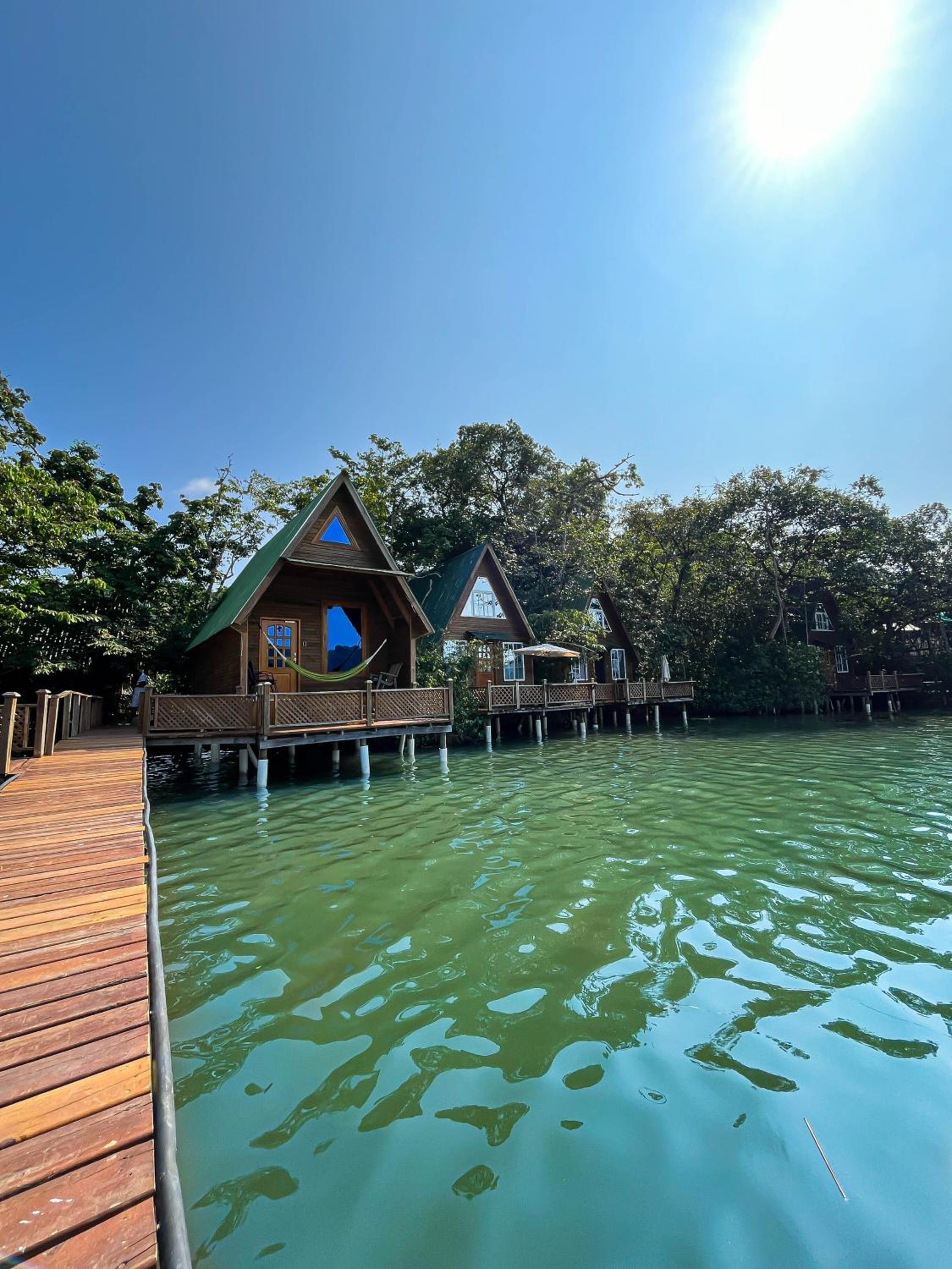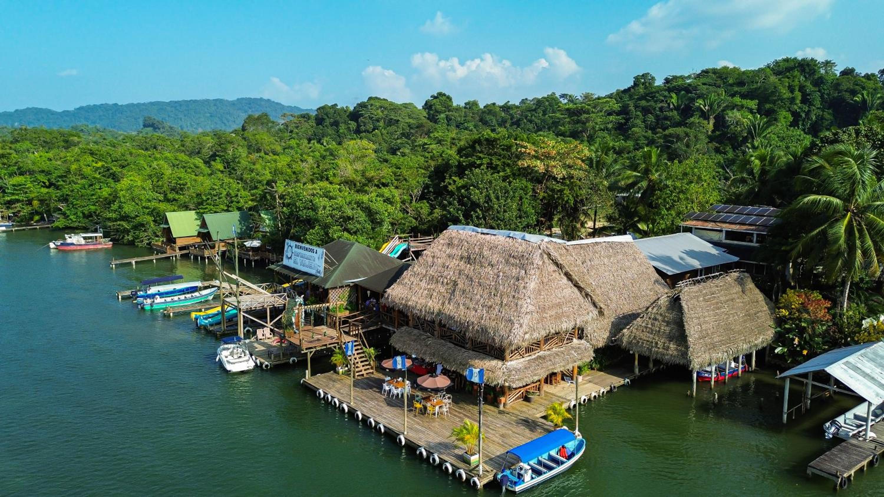 De huisjes aan t water. Mooi uitzicht over de Rio Dulce