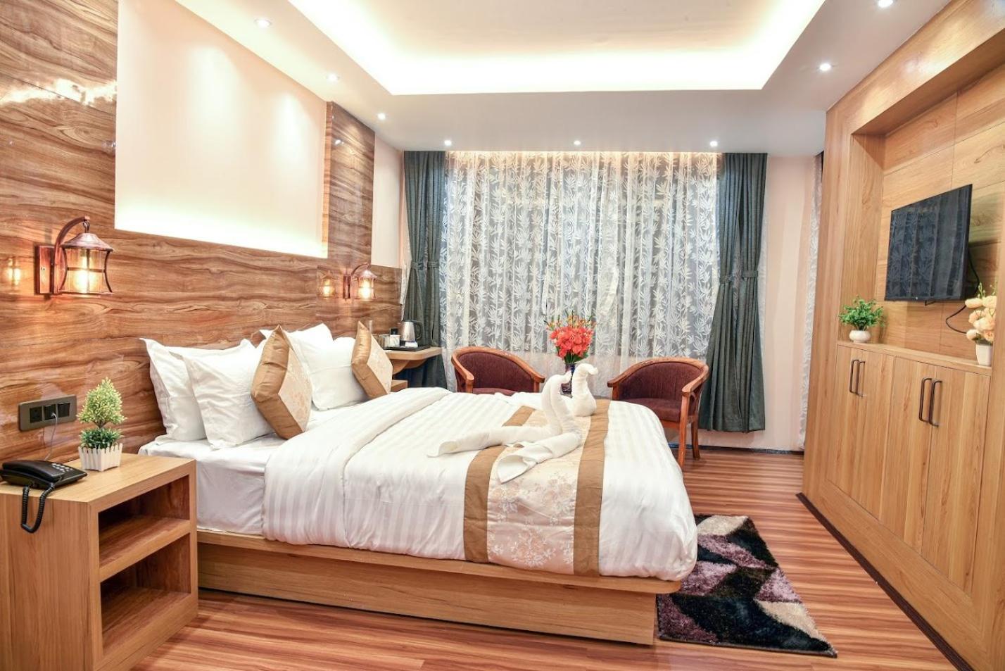 The Lavish Golden Palace offers elegant rooms with stunning mountain views, air conditioning, and modern amenities for a comfortable stay.