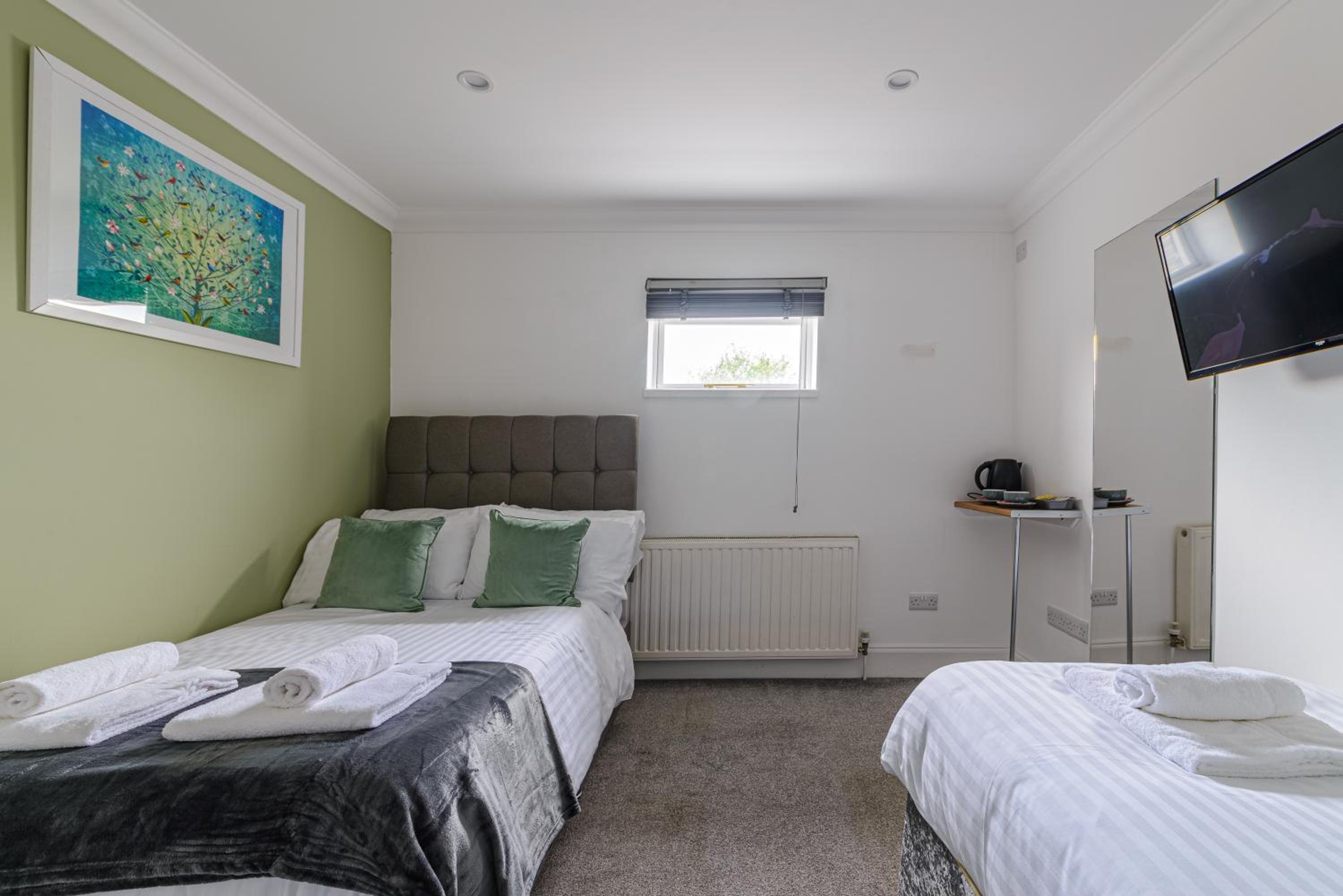 We considered the accommodation unacceptable and booked into another establishment. The carpet was dirty and stained. The furniture was a small double bed, bedside cabinet and a single bed. There was a tv and kettle (no sink). The private shower room was small and down the corridor, but no keys to lock it and so not that private! Access to the accommodation is via an external metal fire escape stairs. Staff were friendly but not expecting our arrival; they phoned their manager to confirm.