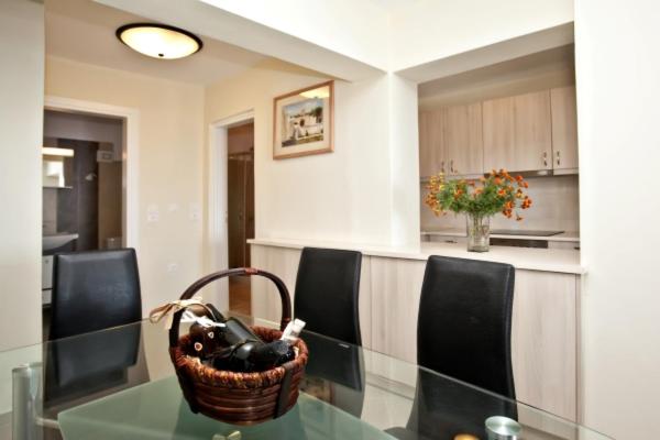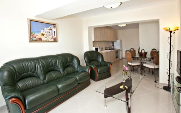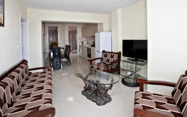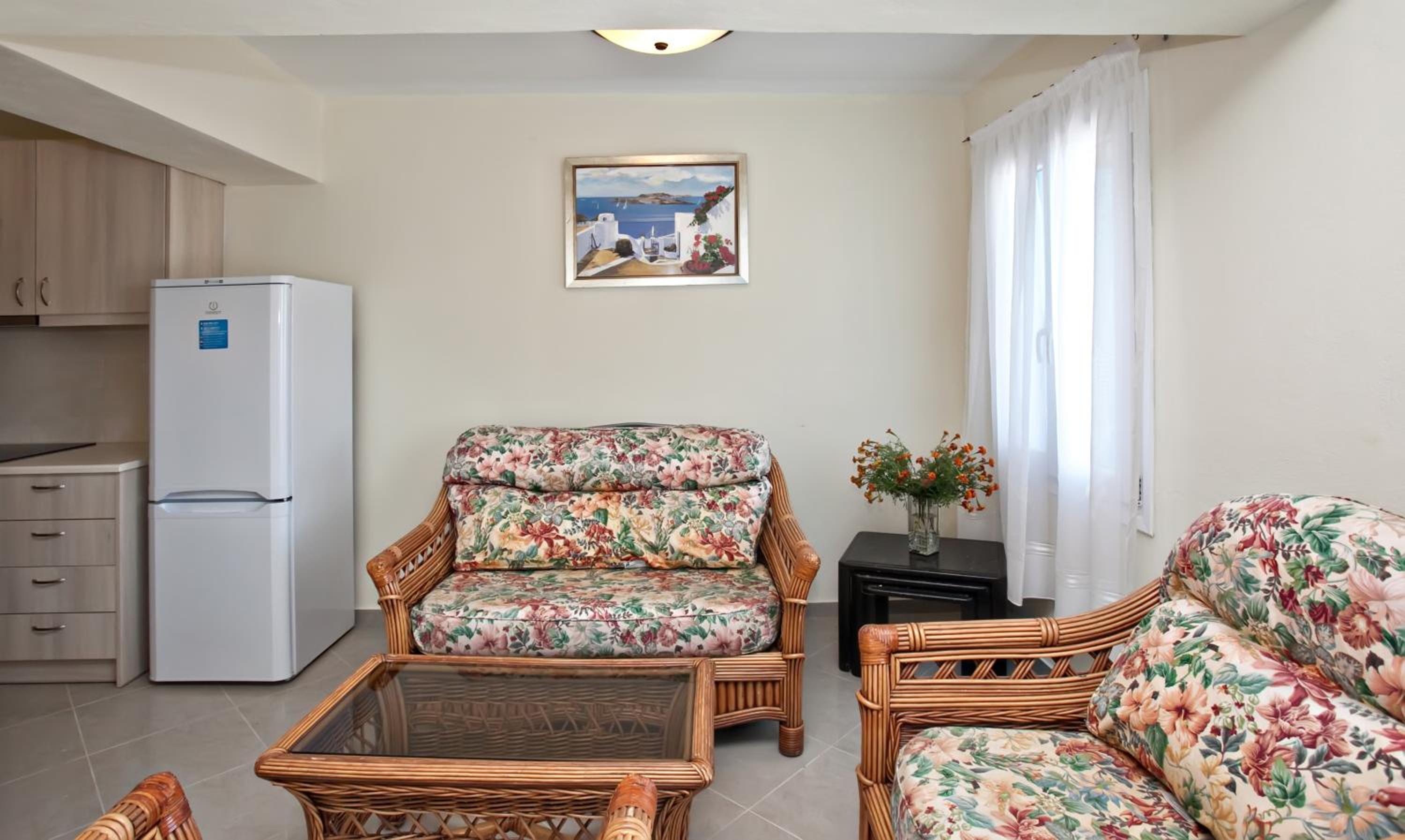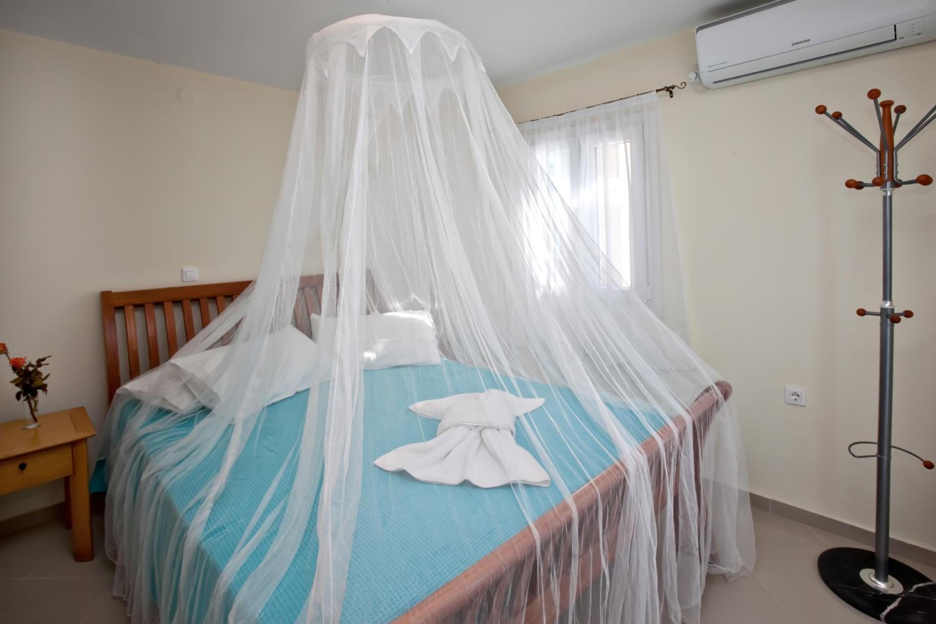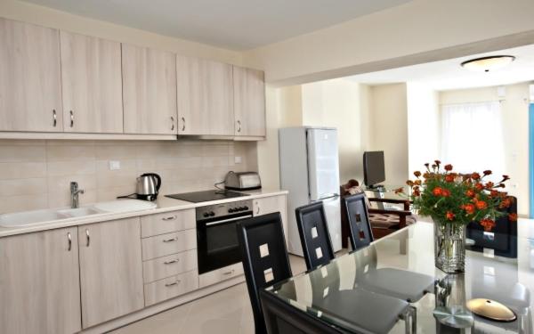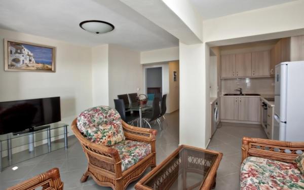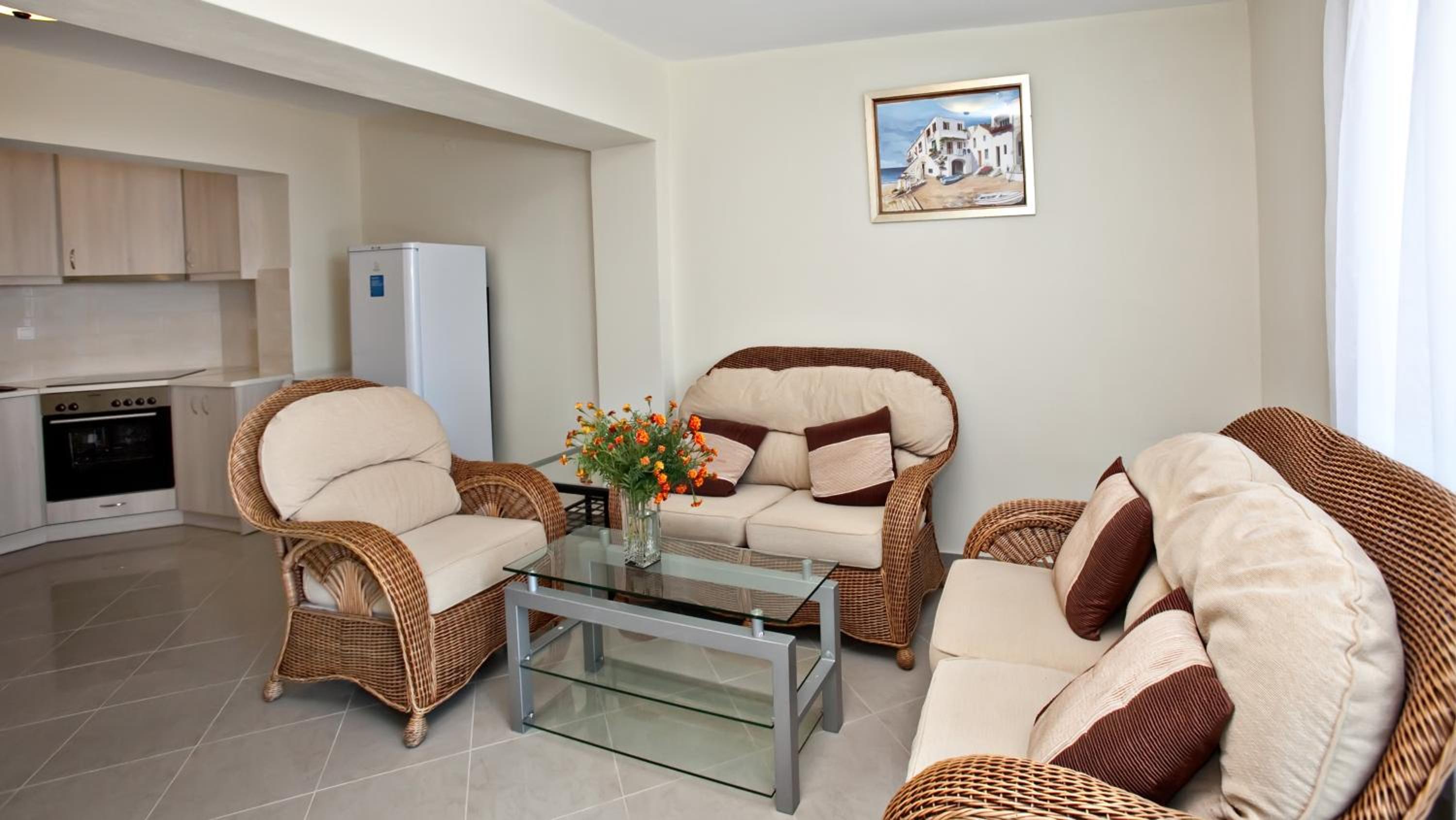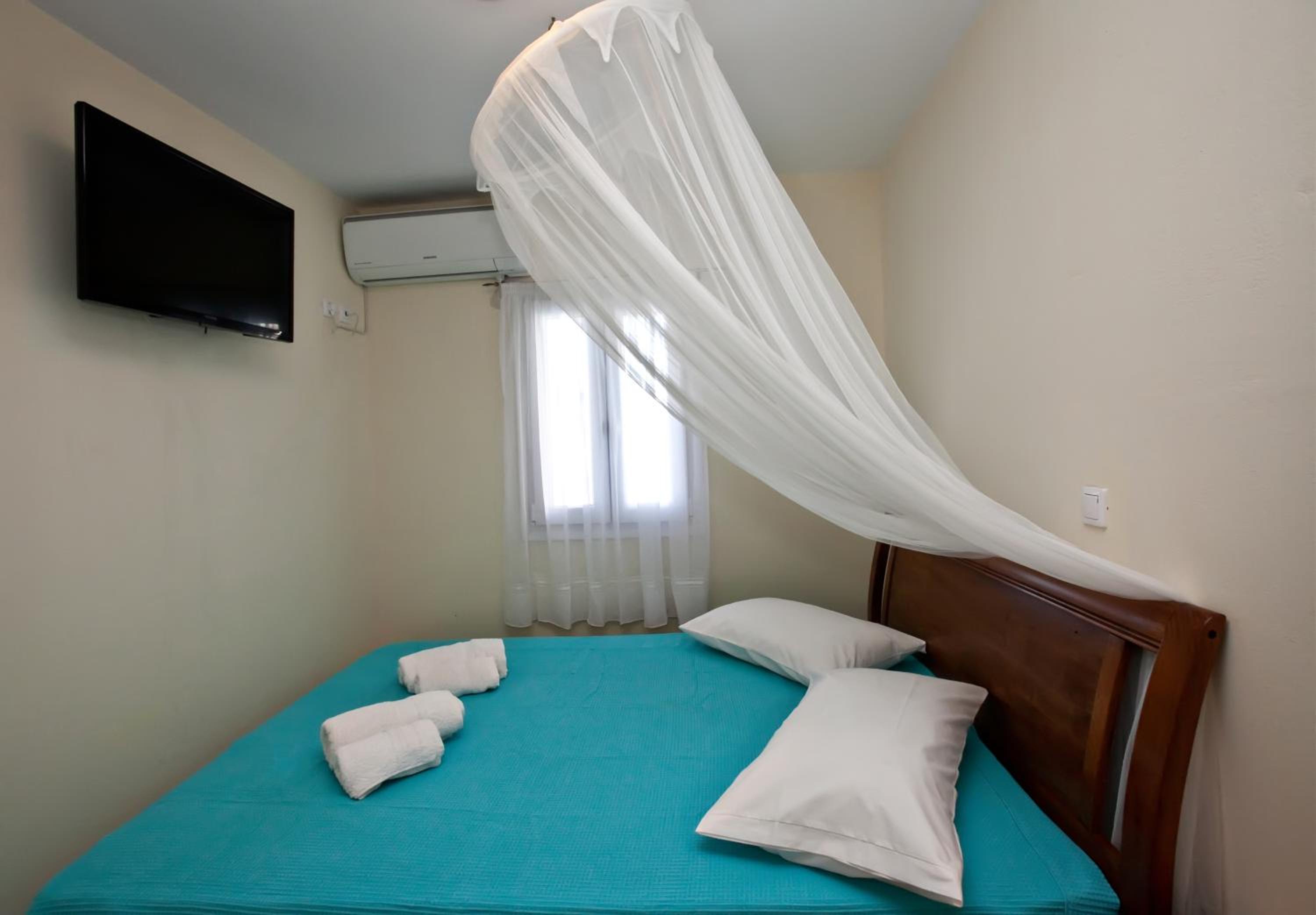 Our air-conditioned units are equipped with a fully equipped kitchen, flat-screen TV, and private balcony for a comfortable stay.