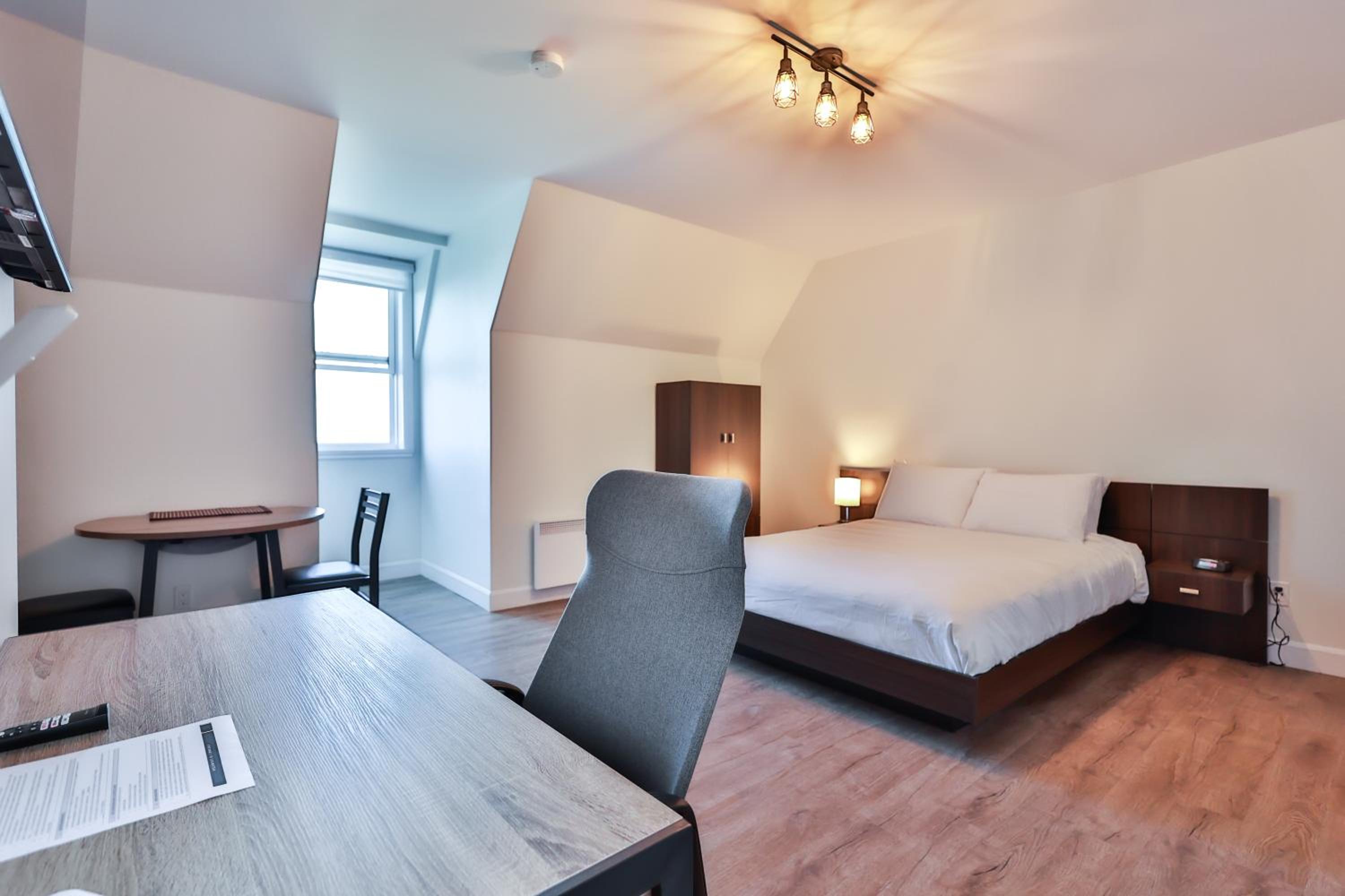 Chaises pour s’asseoir. Petite table intérieur . Lampe à côté du 2ie lit. Support pour ouvrir et déposer sa valise