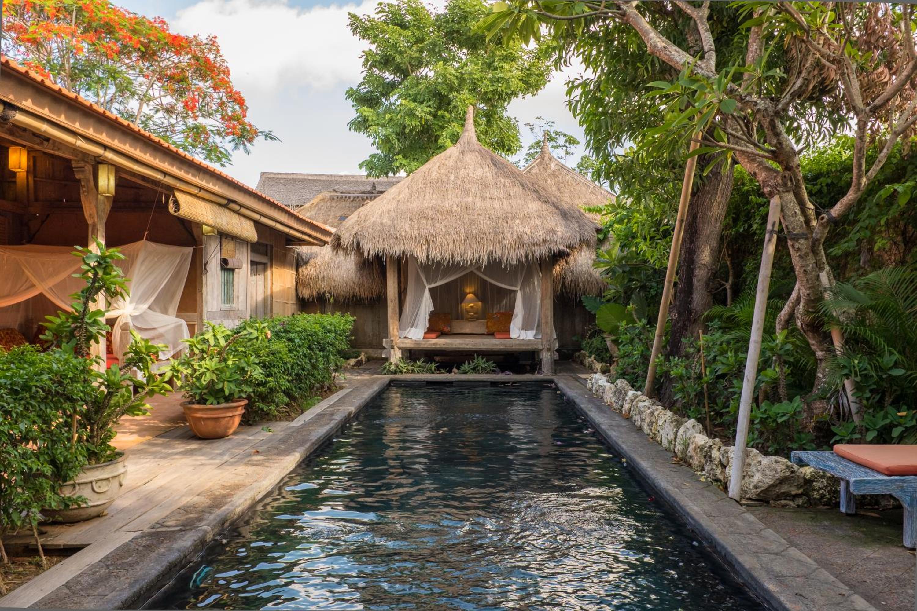 Escape to a tranquil oasis with an outdoor swimming pool, garden, and terrace offering breathtaking views at The Temple Lodge in Bingin Beach.