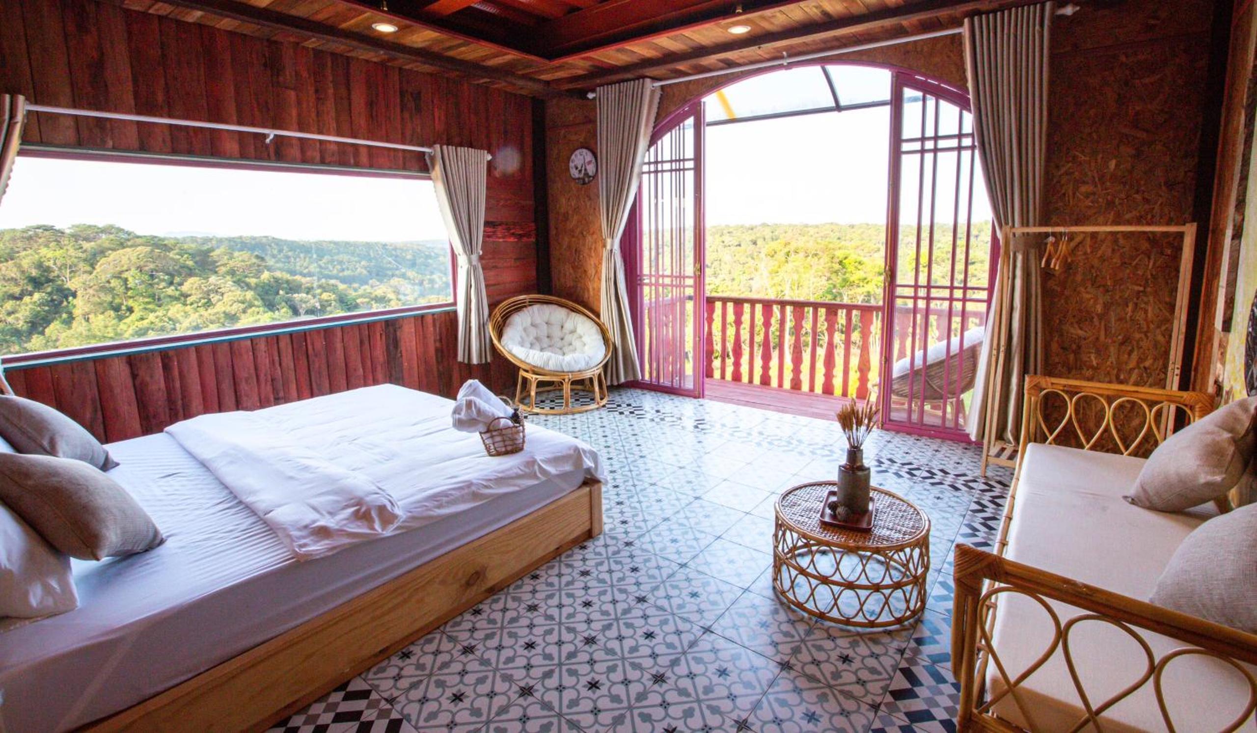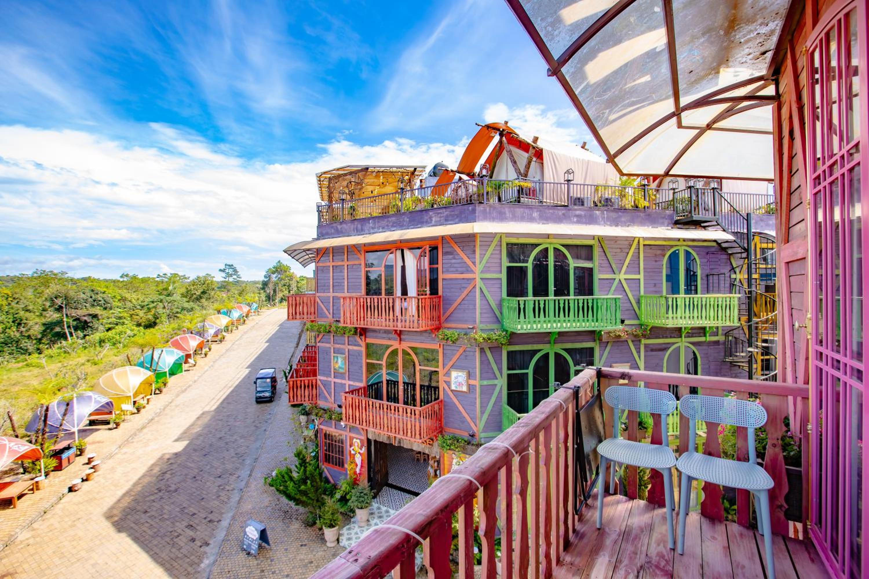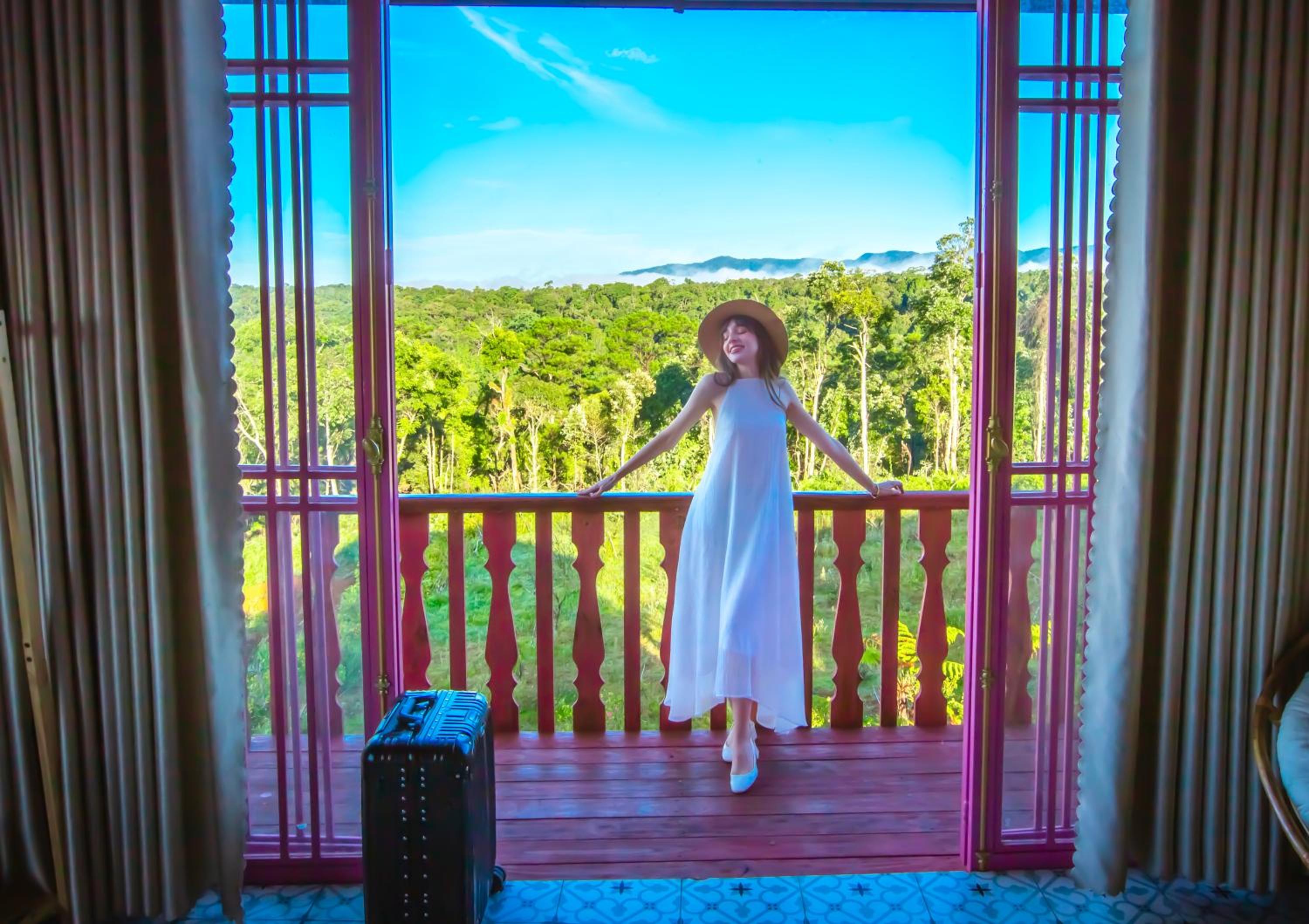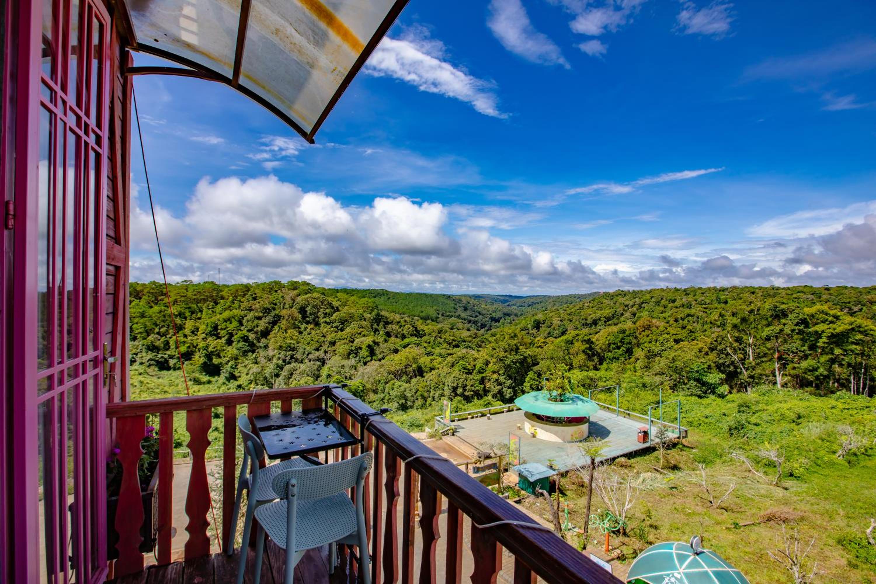 Enjoy breathtaking mountain and city views from your private balcony at Auguri Homestay Mang Den.