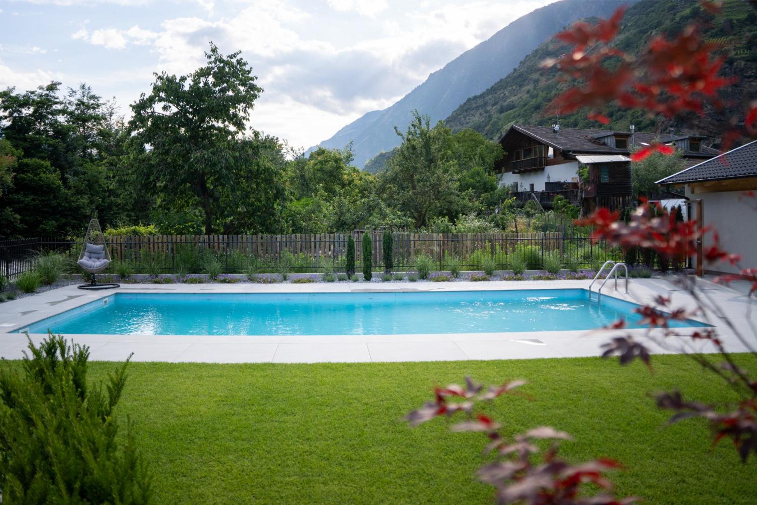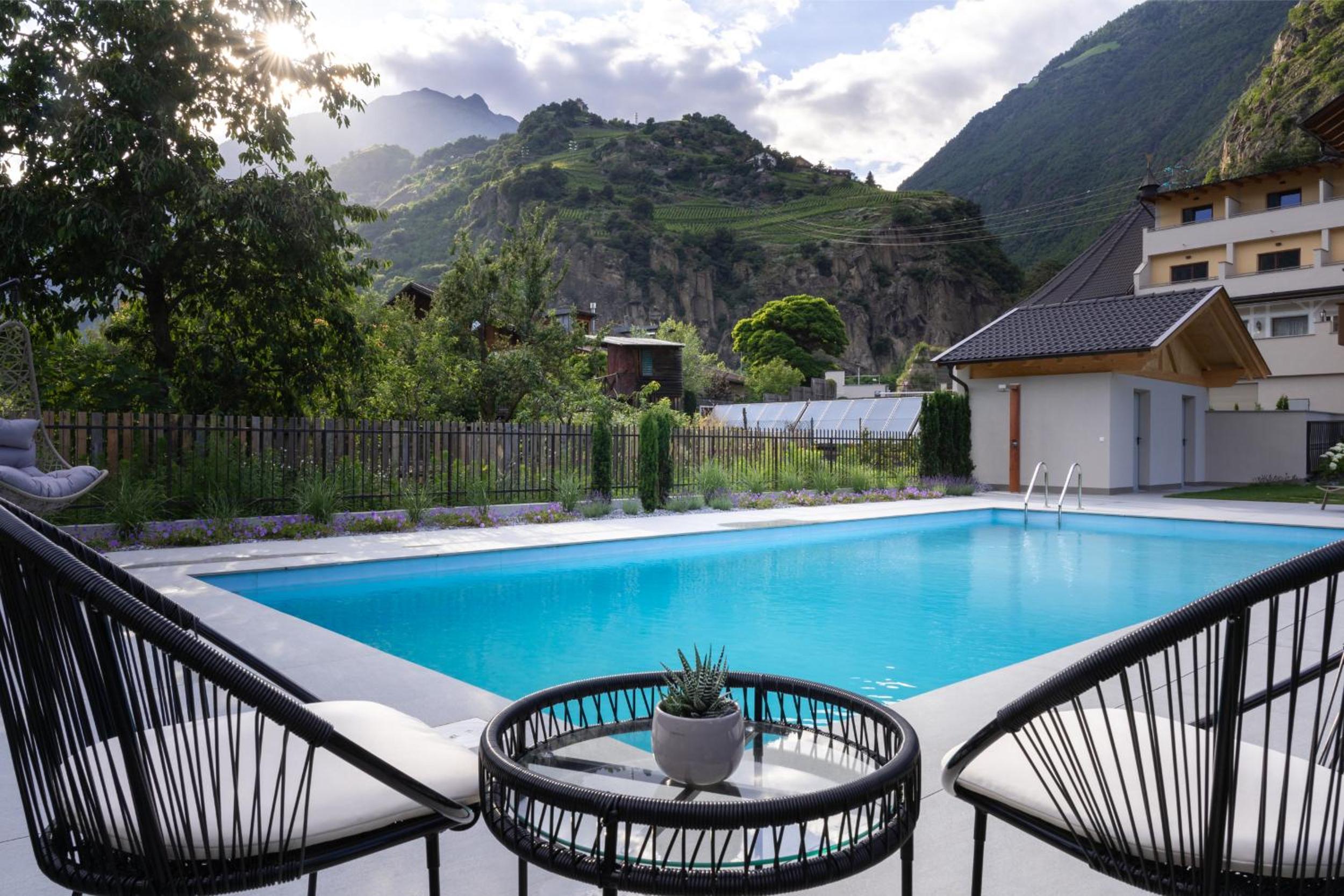 Relax in the lush garden, take a dip in the seasonal outdoor pool, or enjoy mountain views from a private balcony.