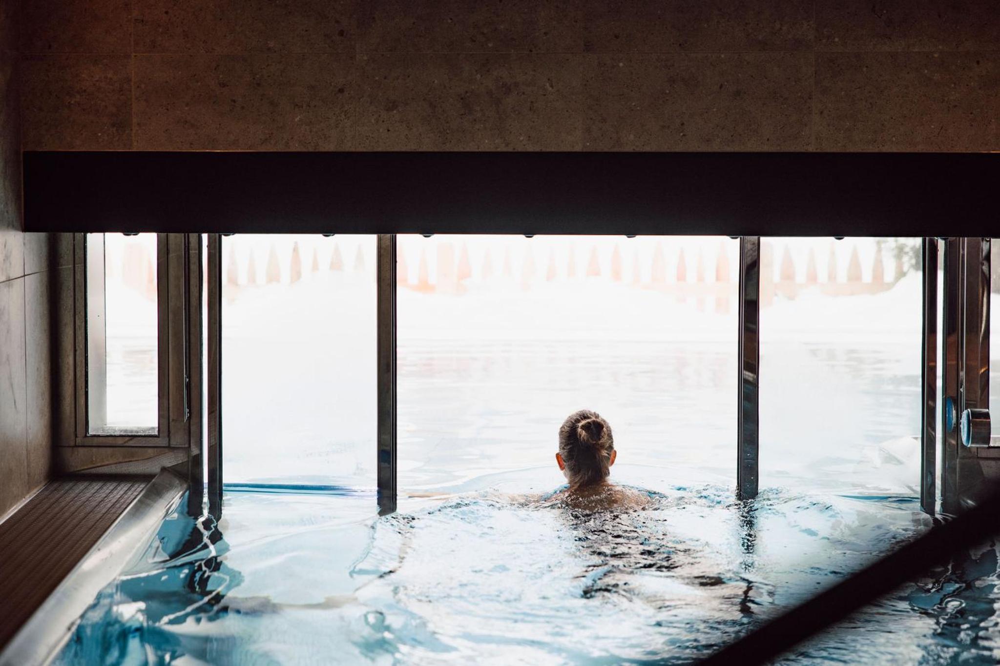 Der Spabereich im unteren Geschoß ich sehr großzügig mit mehreren Saunen, Ruheraum und einem großen beheizten Pool im Außenbereich.