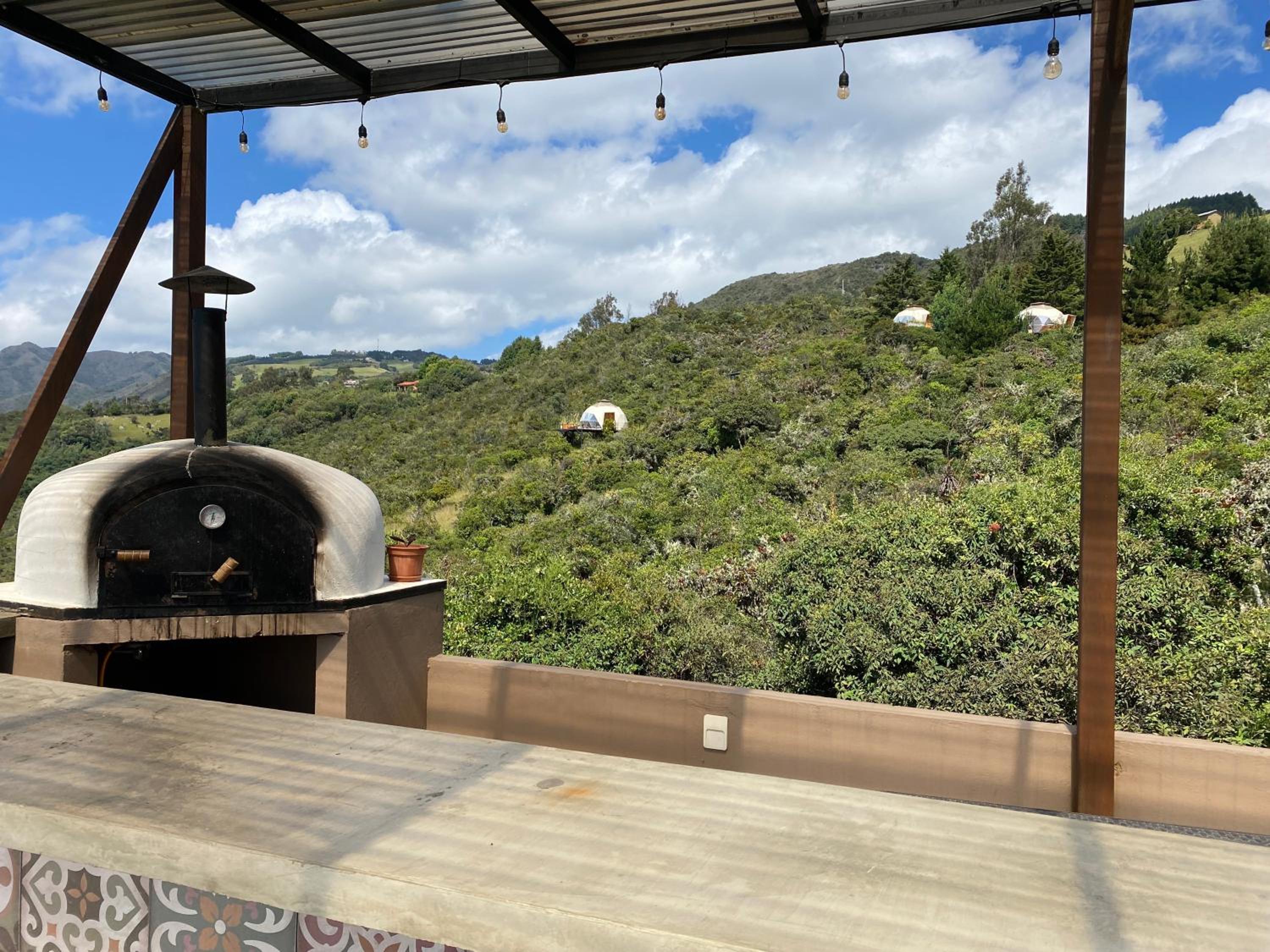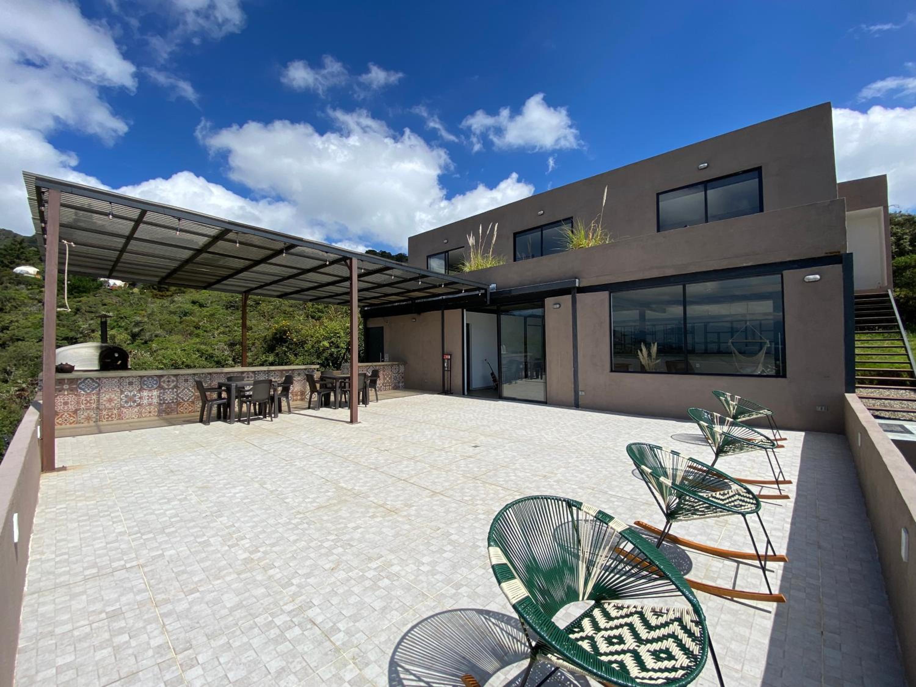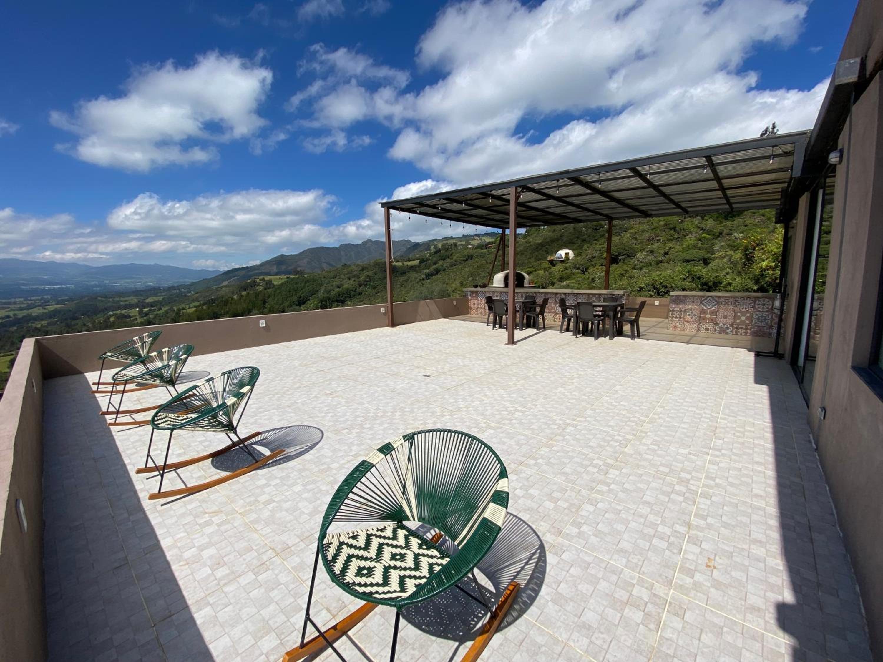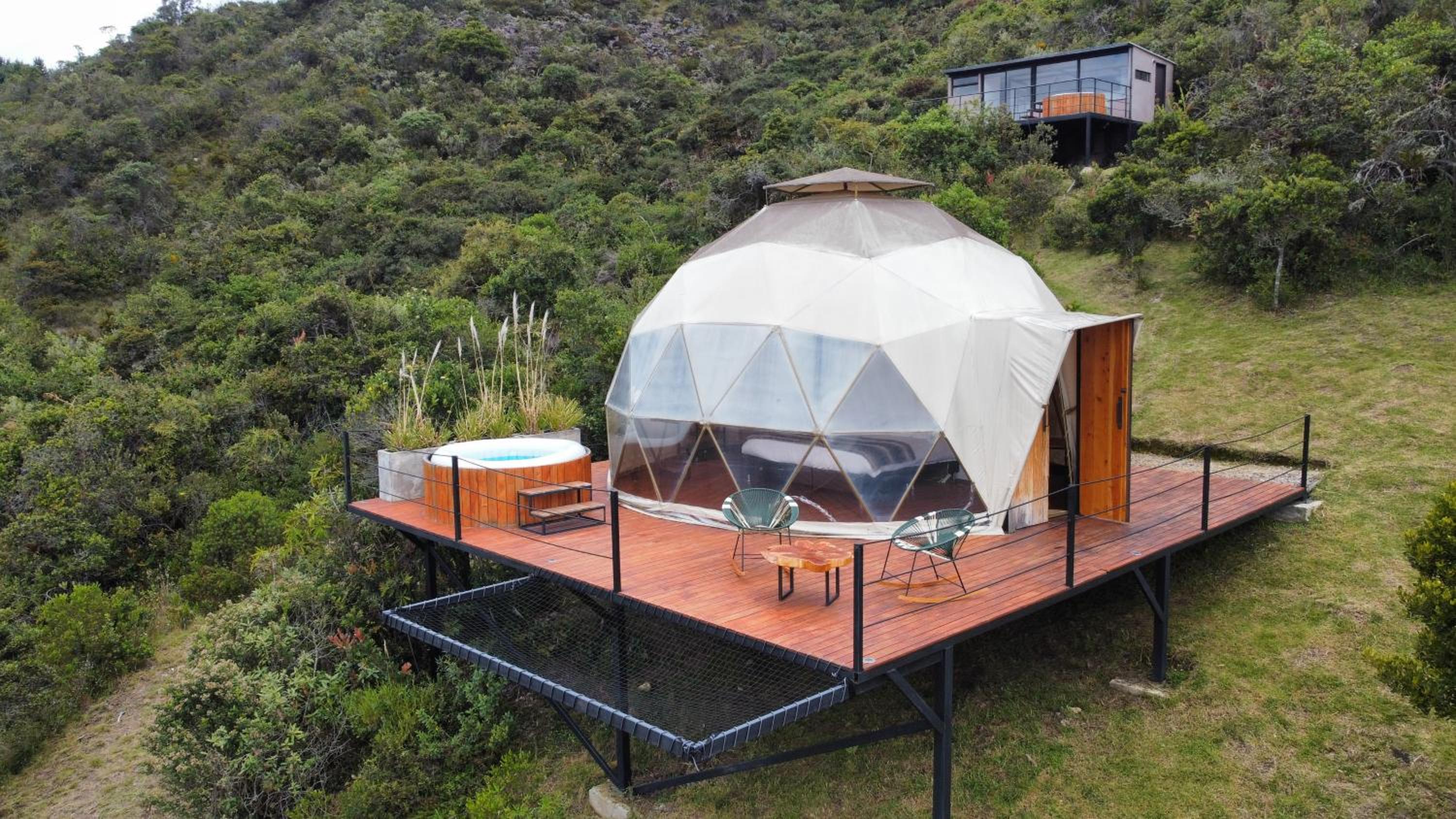 Escape to Casa Oro Glamping Hostel in Guatavita for a one-of-a-kind stay surrounded by nature. Enjoy the stunning mountain and lake views from your room's balcony, and relax in the peaceful garden setting.