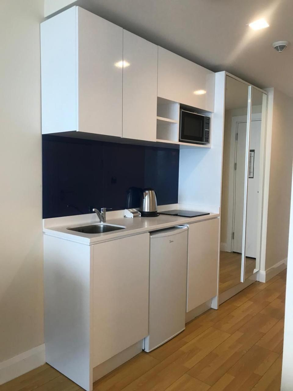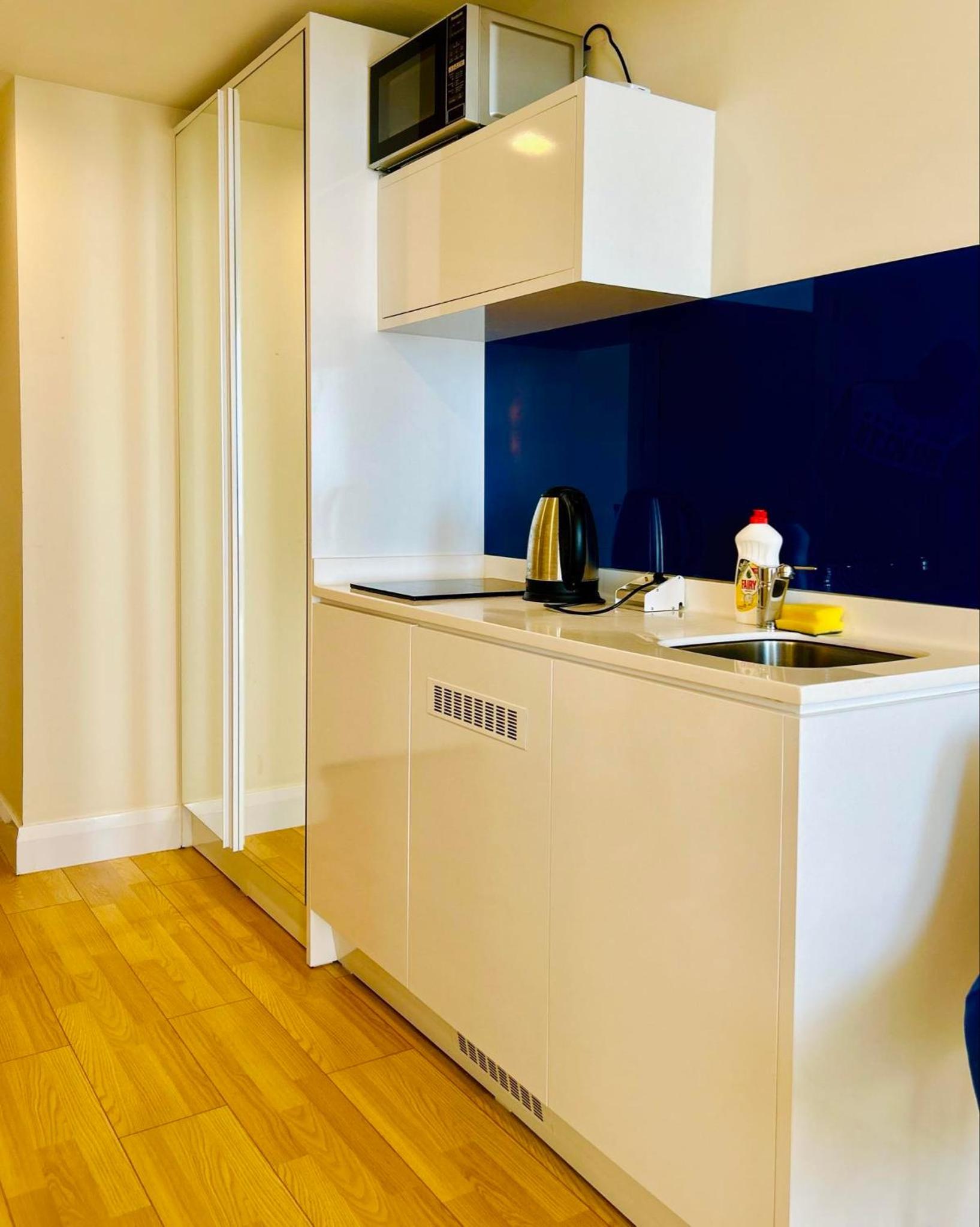 Na miejscu są jakieś przybory kuchenne, płyta indukcyjna i mikrofalówka ale biorąc pod uwagę wszechobecność lepszych i gorszych knajpek (do najbliższej trzeba zjechać windą i przejść na drugą stronę ulicy) nie mieliśmy okazji skorzystać.