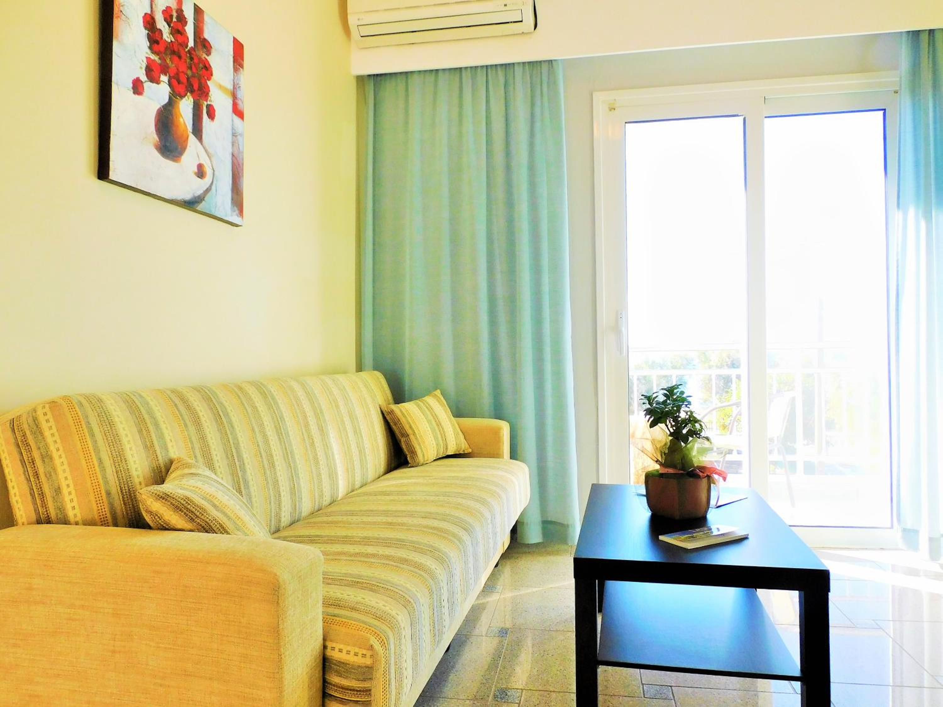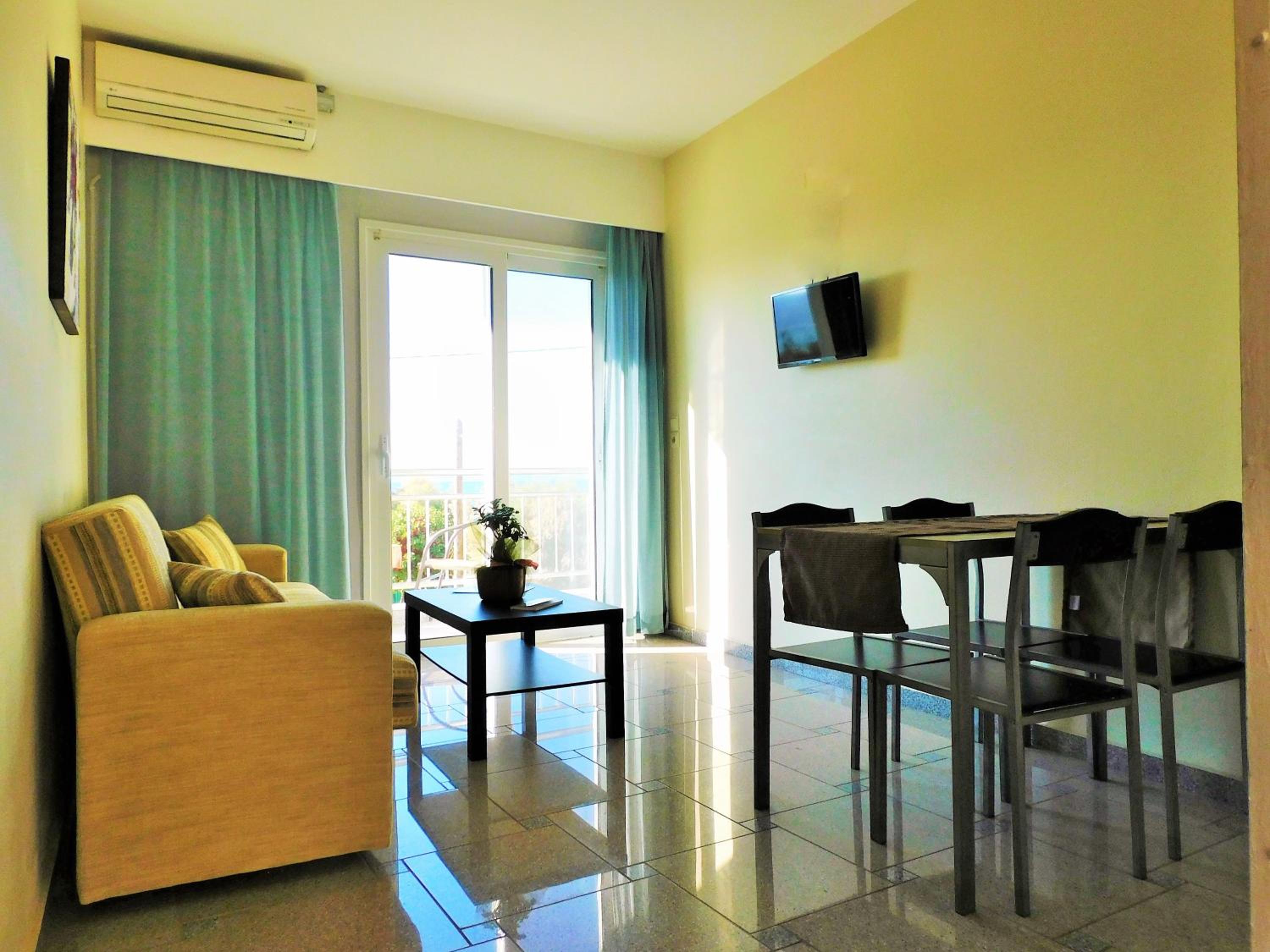 Spacious 1 bedroom apartment facing the beach and within a short walk of the village. Truly ground floor with a slope from the pavement to reception. As a solo traveler who uses a rollator.(wheeled walker) this was very important. A comfortable bed with good quality pillows and bed linen. The towels and linen were changed on the 2nd of my 3 day stay. The apartment was well cared for and spotlessly clean.