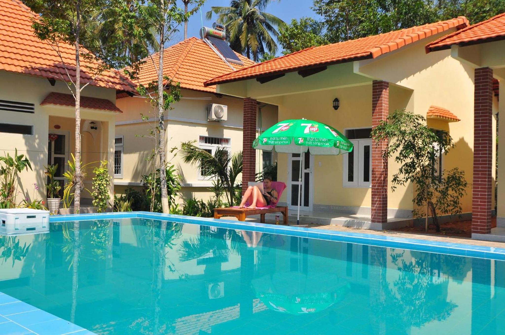 Luxuriate in the serene ambiance of Đức Anh Bungalow featuring an outdoor pool, lush garden, and inviting terrace.