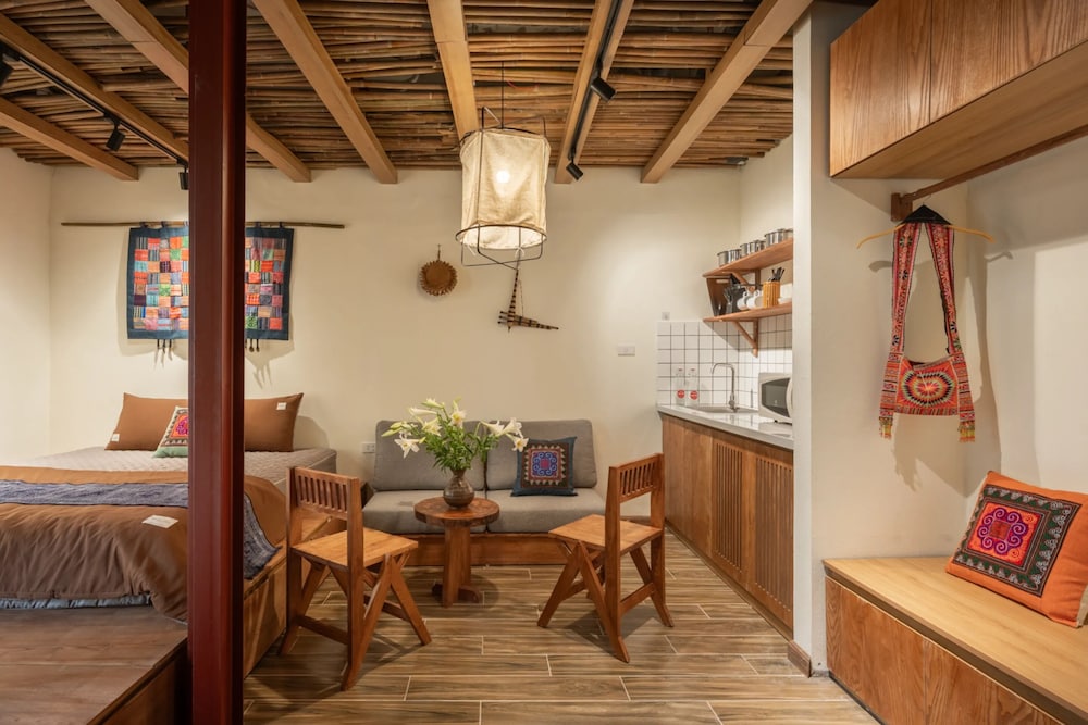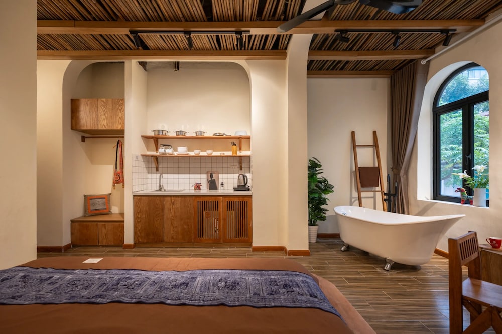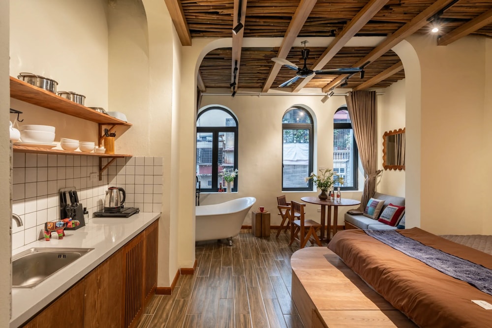 Relax in one of the 15 guestrooms, each uniquely decorated and featuring kitchenettes. Experience ultimate comfort on a memory foam bed with down comforters and Egyptian cotton sheets. Enjoy entertainment on 43-inch LCD televisions and stay connected with complimentary wireless internet access.
