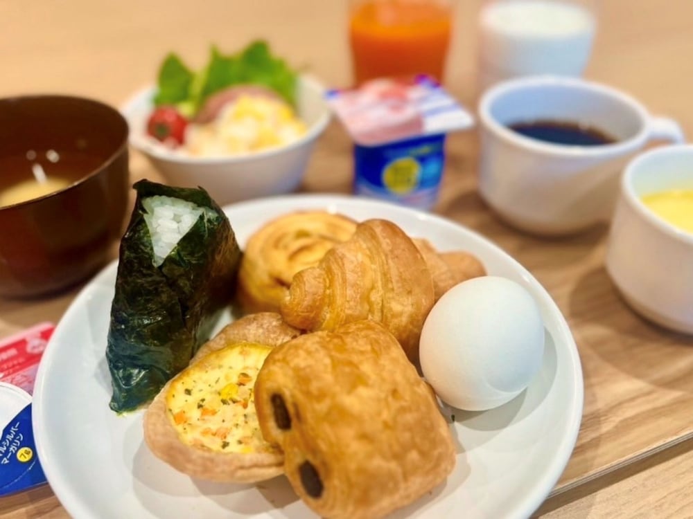 ビュッフェは簡単な小さめのパンや食パン(好きに温めたり焼いたりできる)おにぎりも数種類、スープはお味噌汁含めて6種類くらいあったし、飲み物も4種類くらい。コーヒーは後で部屋に持って上がってもOKだったし、サラダやゆで卵も食べ放題でした。