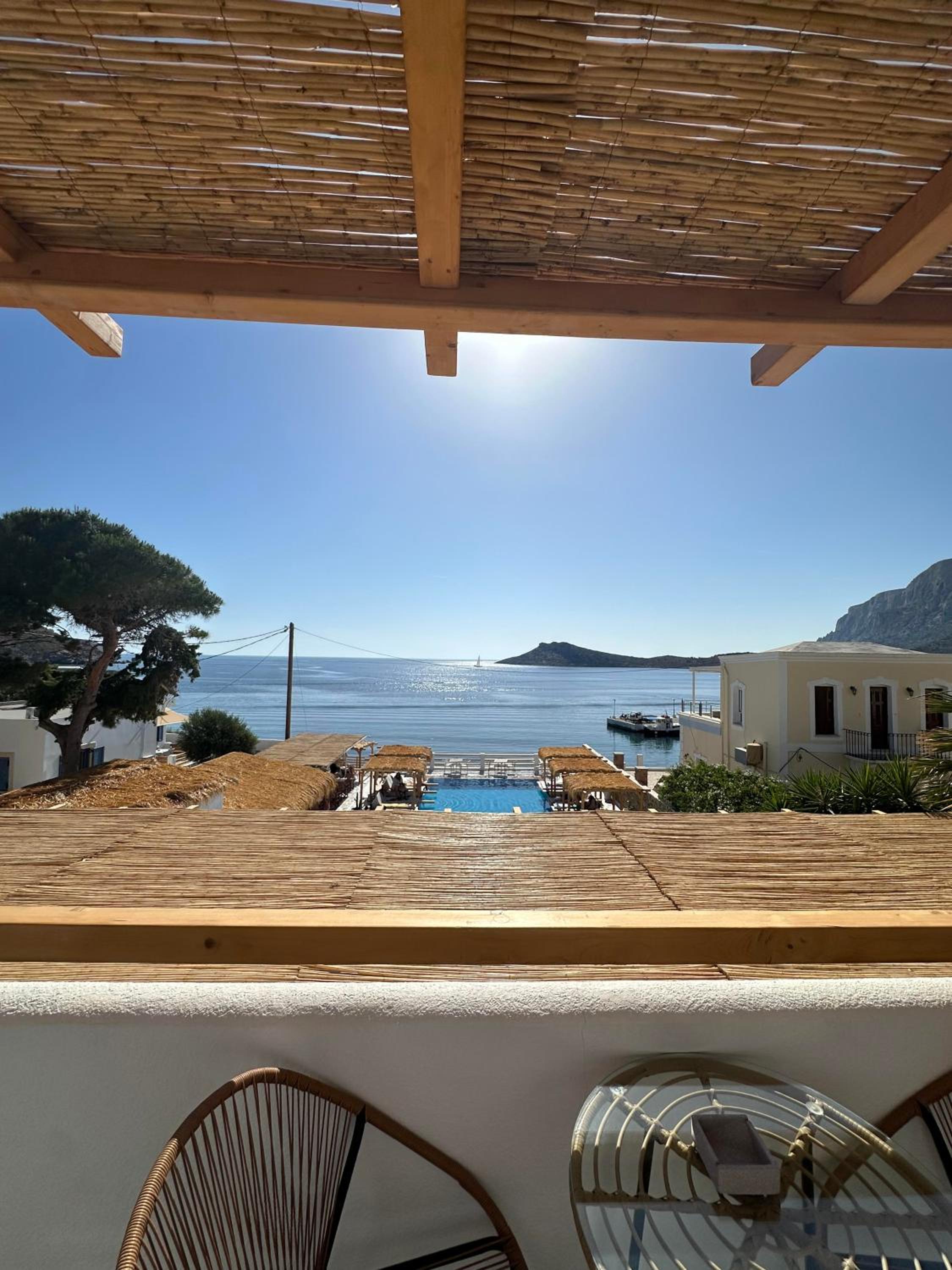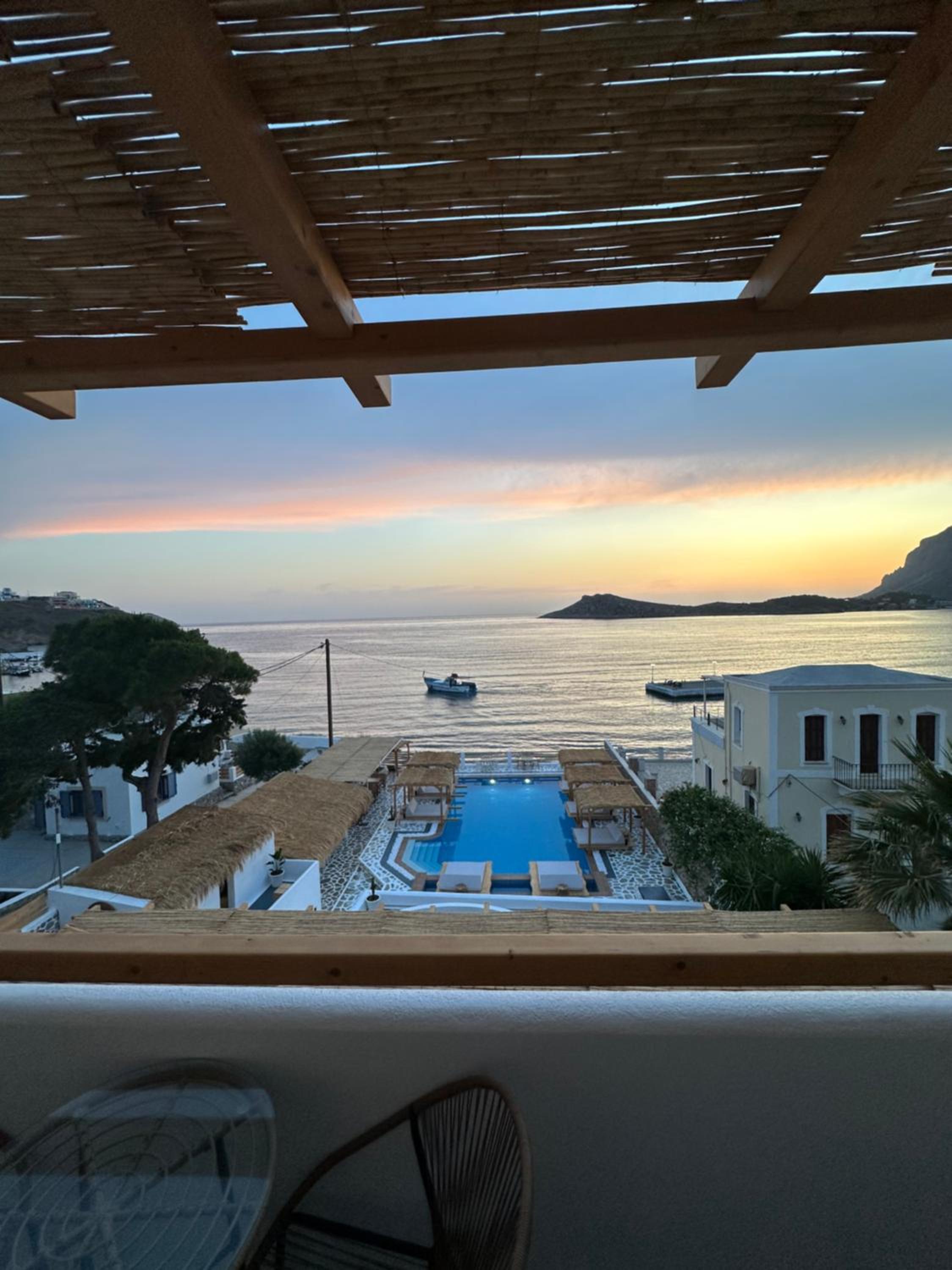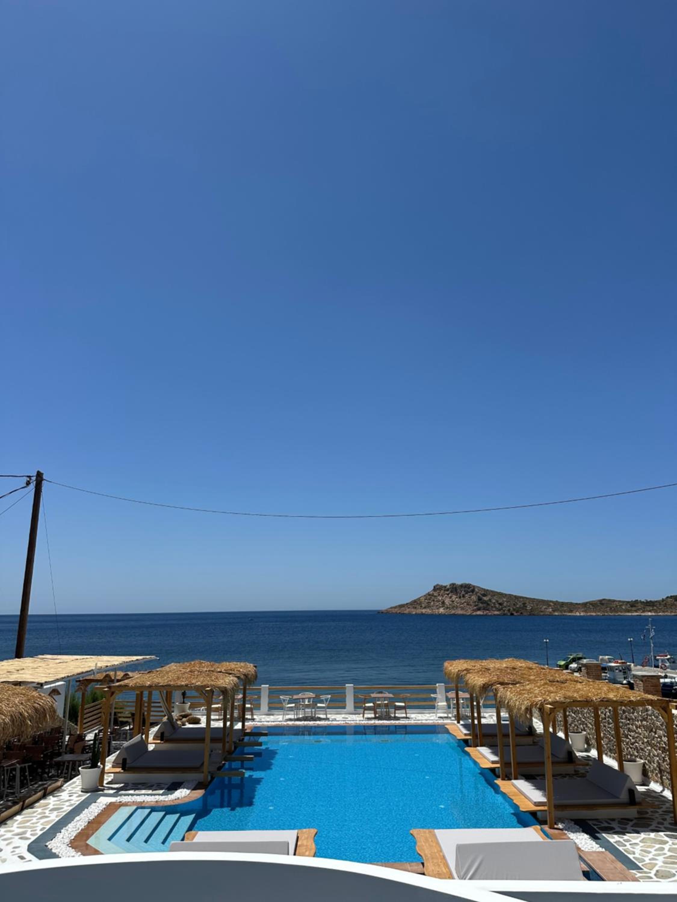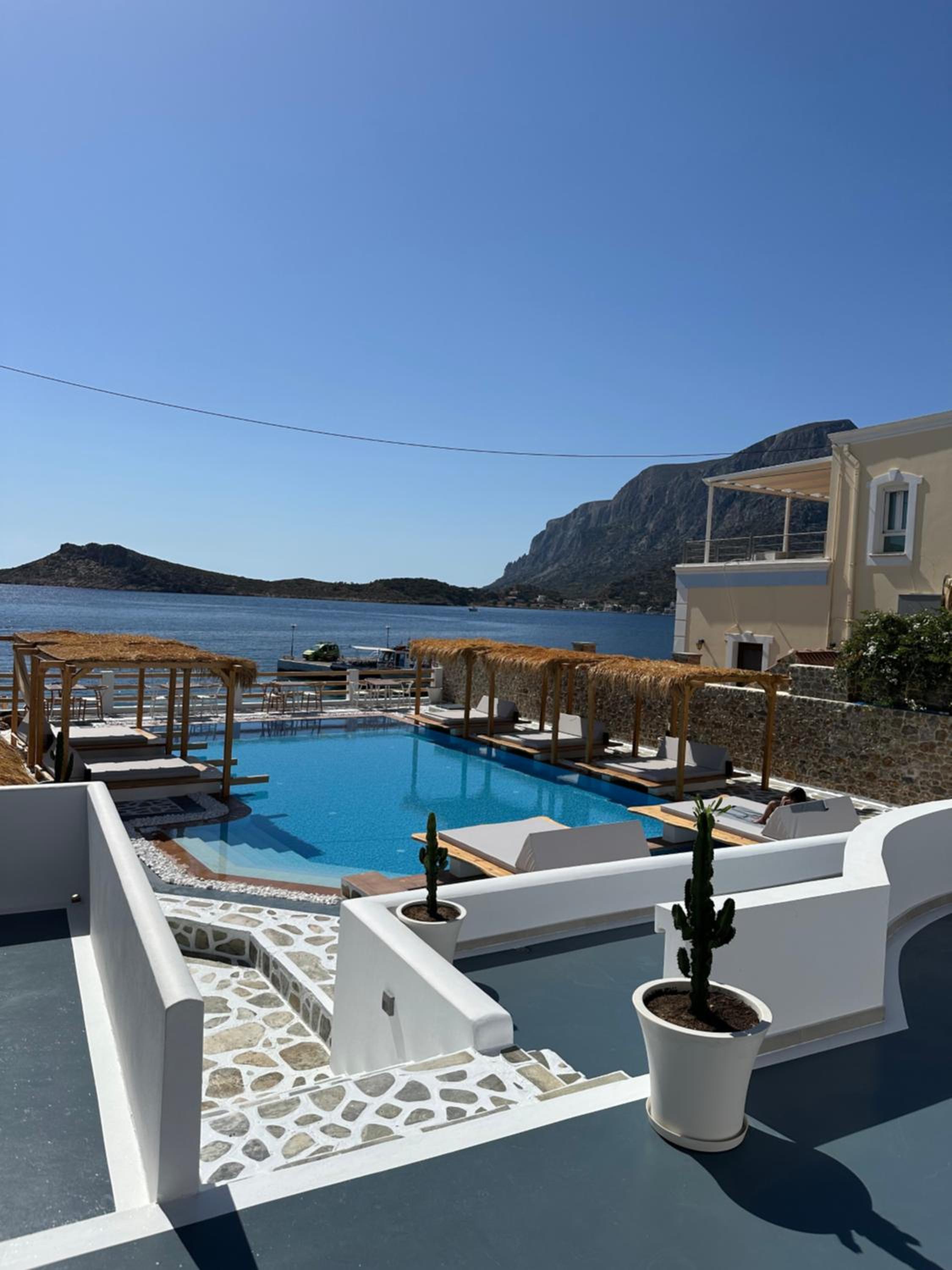 First and foremost, we loved the position. Just IN FRONT of TELENDOS, next to the dock where the boats come and go, with a stunning swimming pool overlooking the sea...on the rear, along the way where the reception is, a little square with a taxi stop, a supermarket and a car rental.