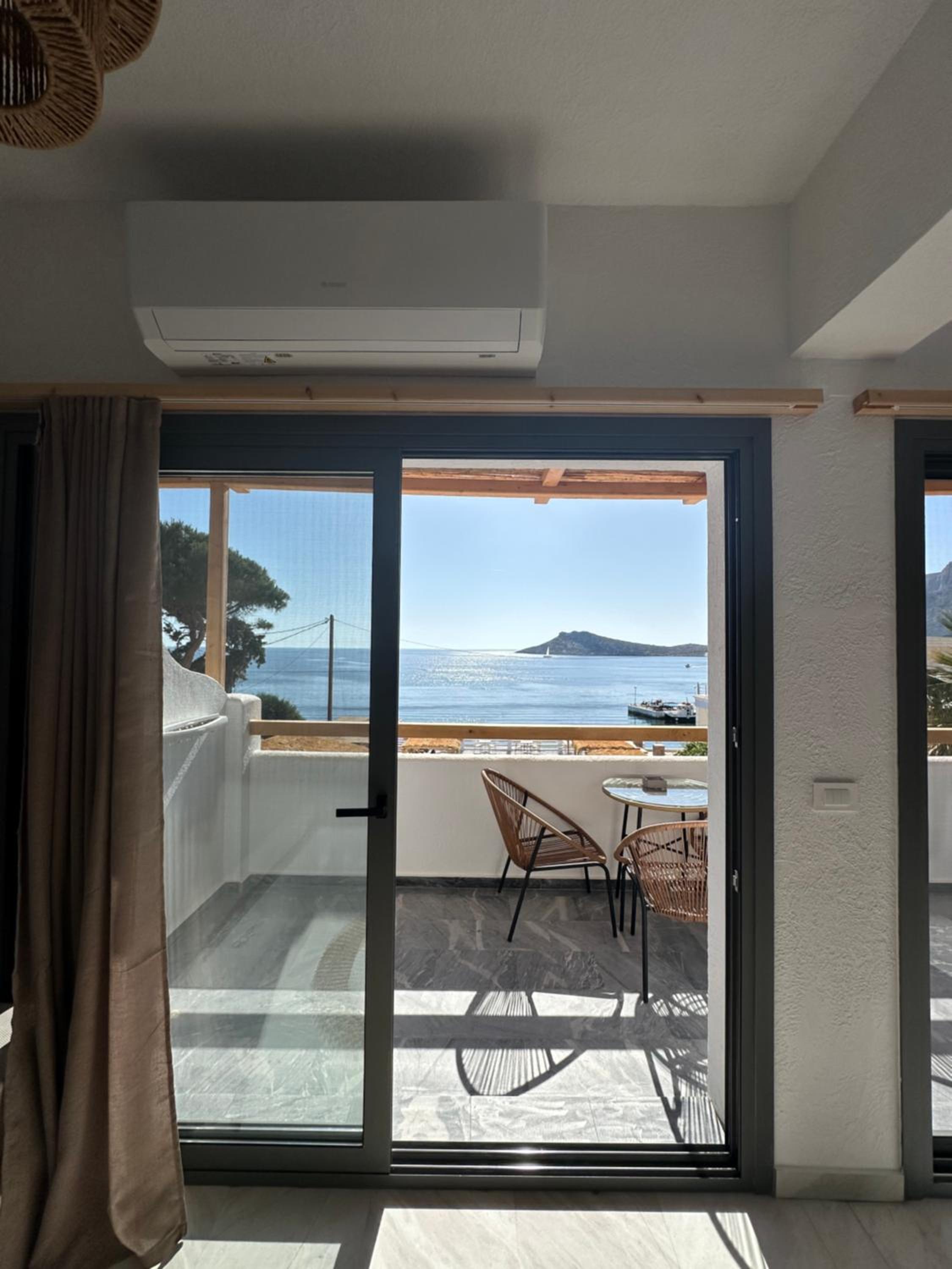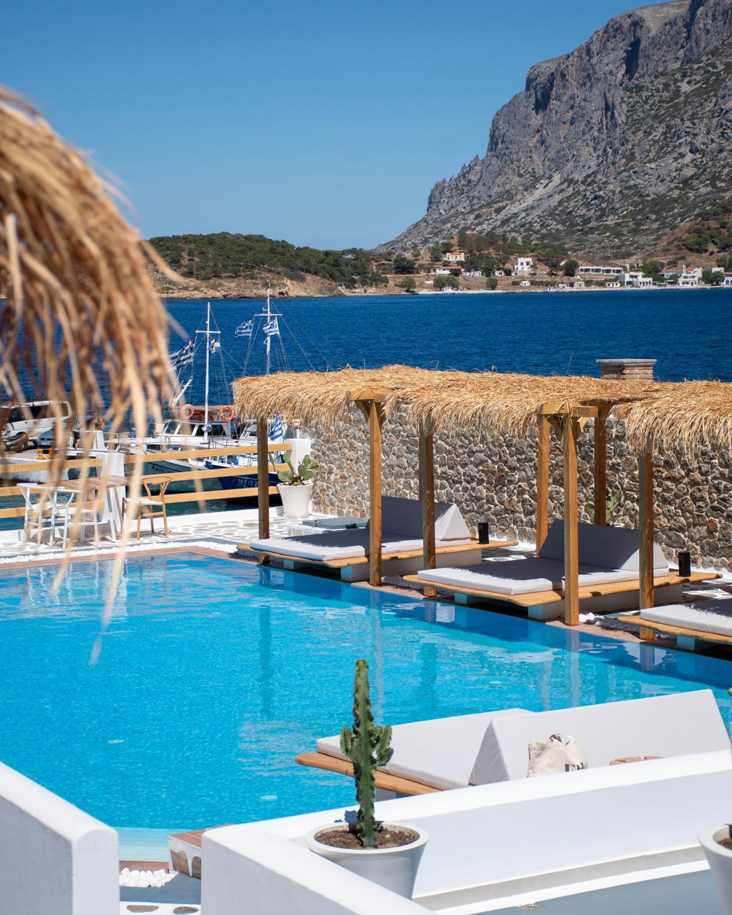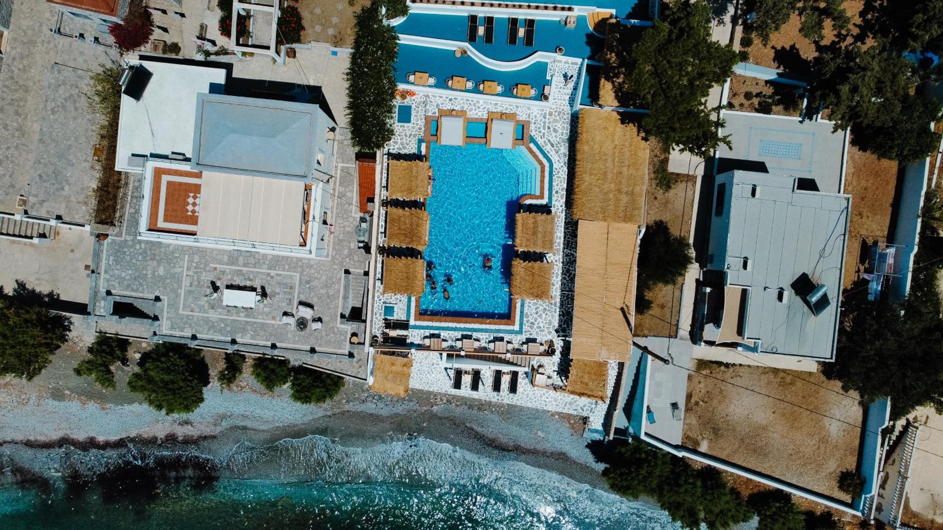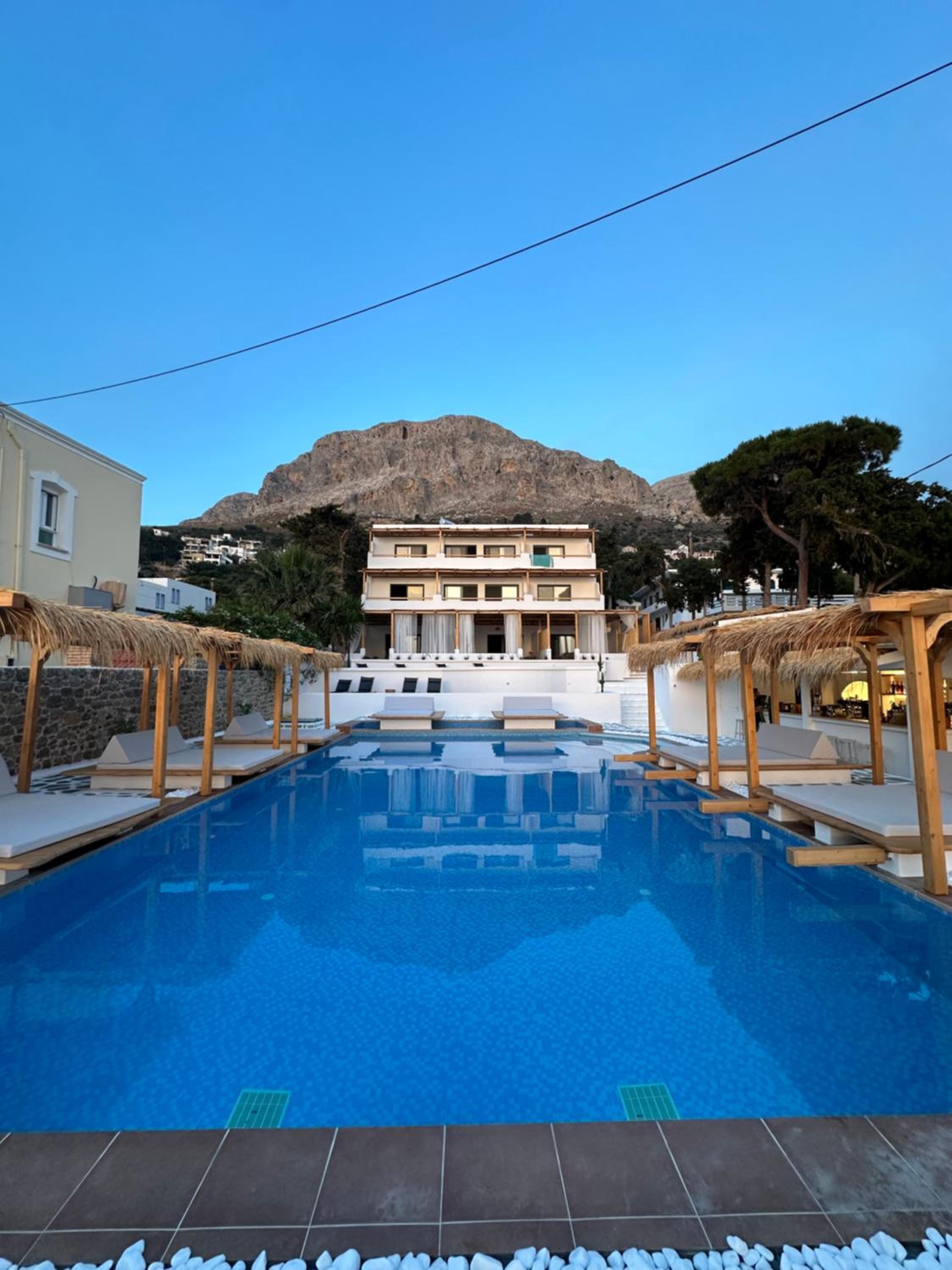 First and foremost, we loved the position. Just IN FRONT of TELENDOS, next to the dock where the boats come and go, with a stunning swimming pool overlooking the sea...on the rear, along the way where the reception is, a little square with a taxi stop, a supermarket and a car rental.
