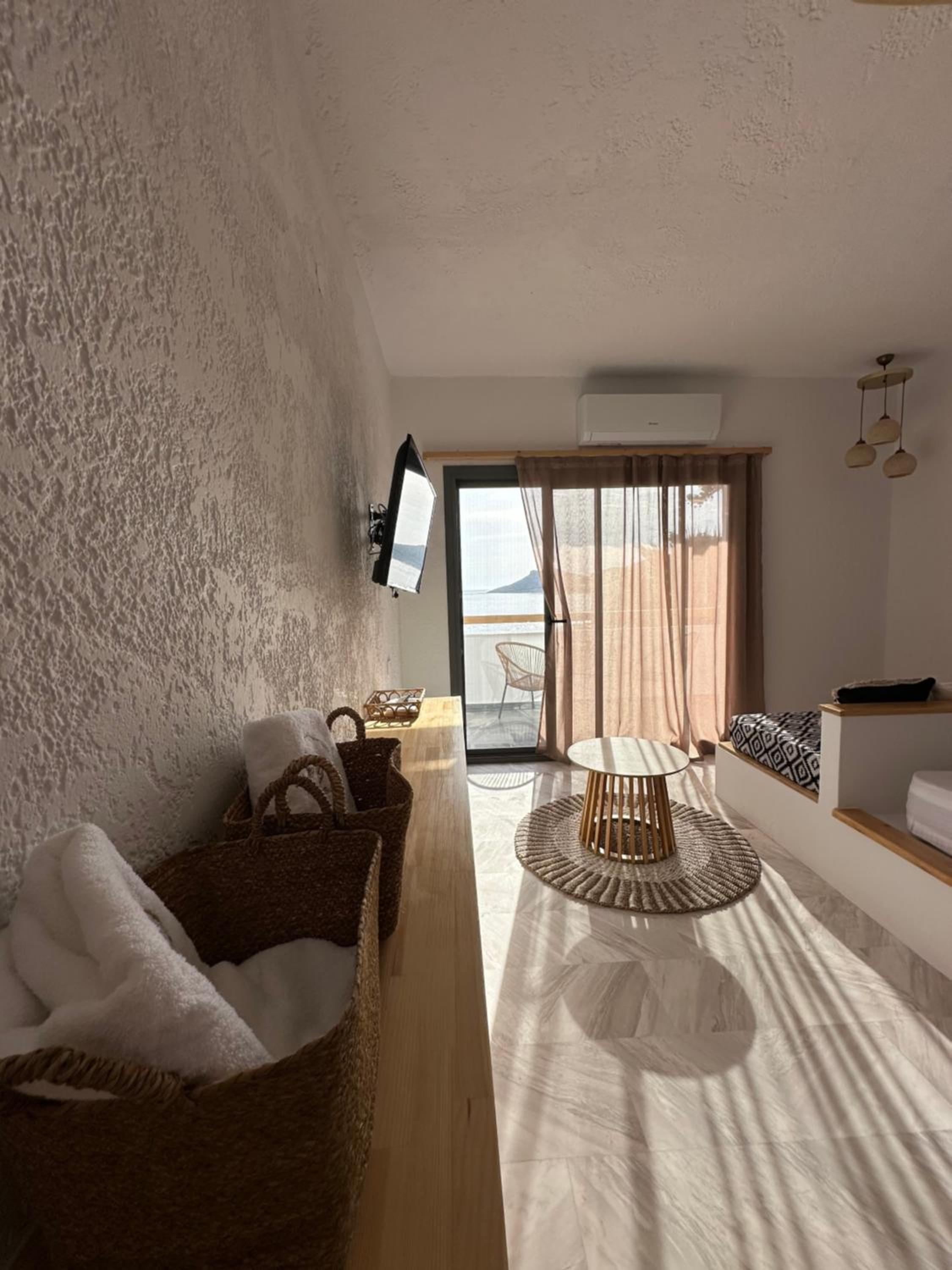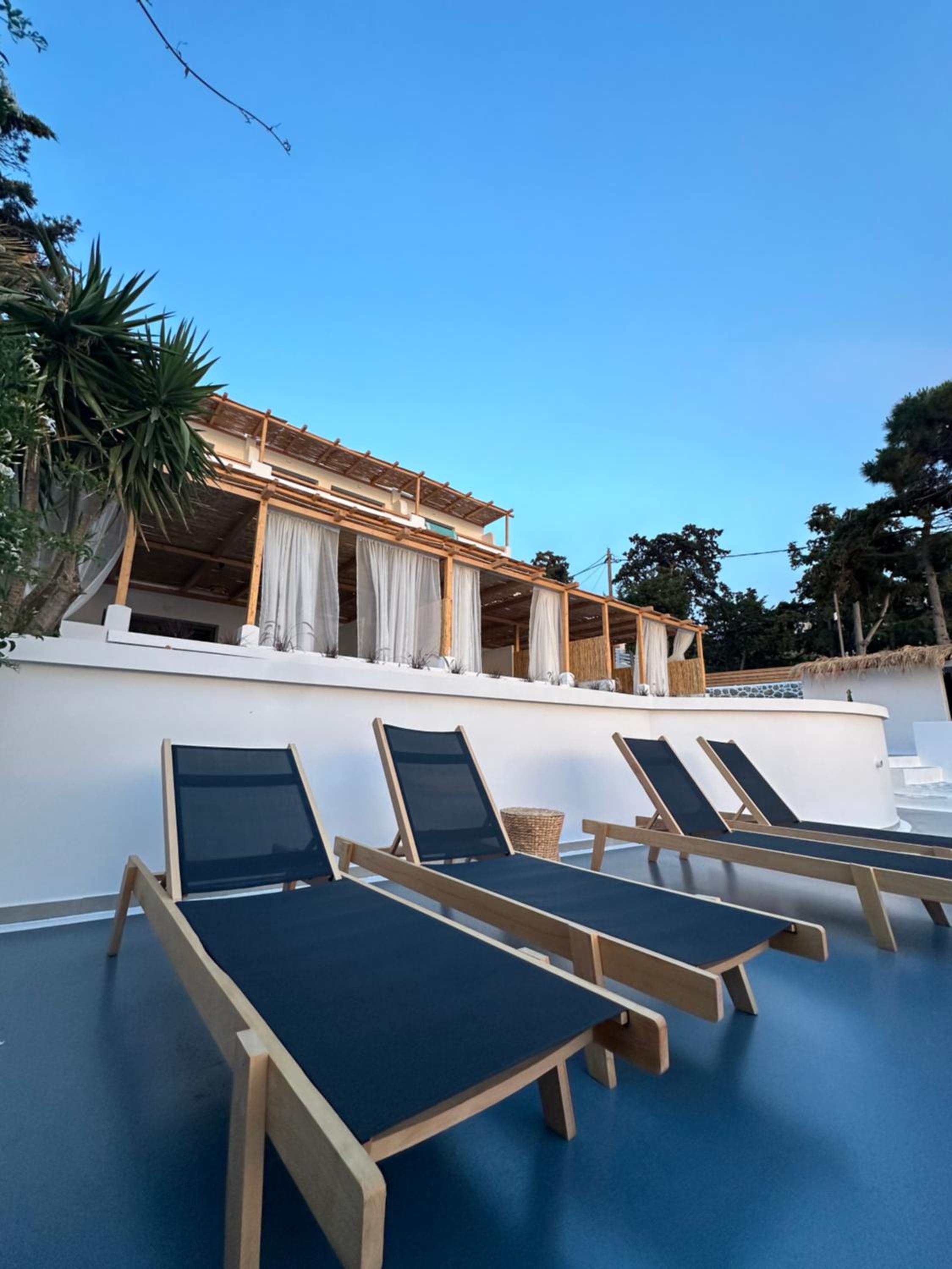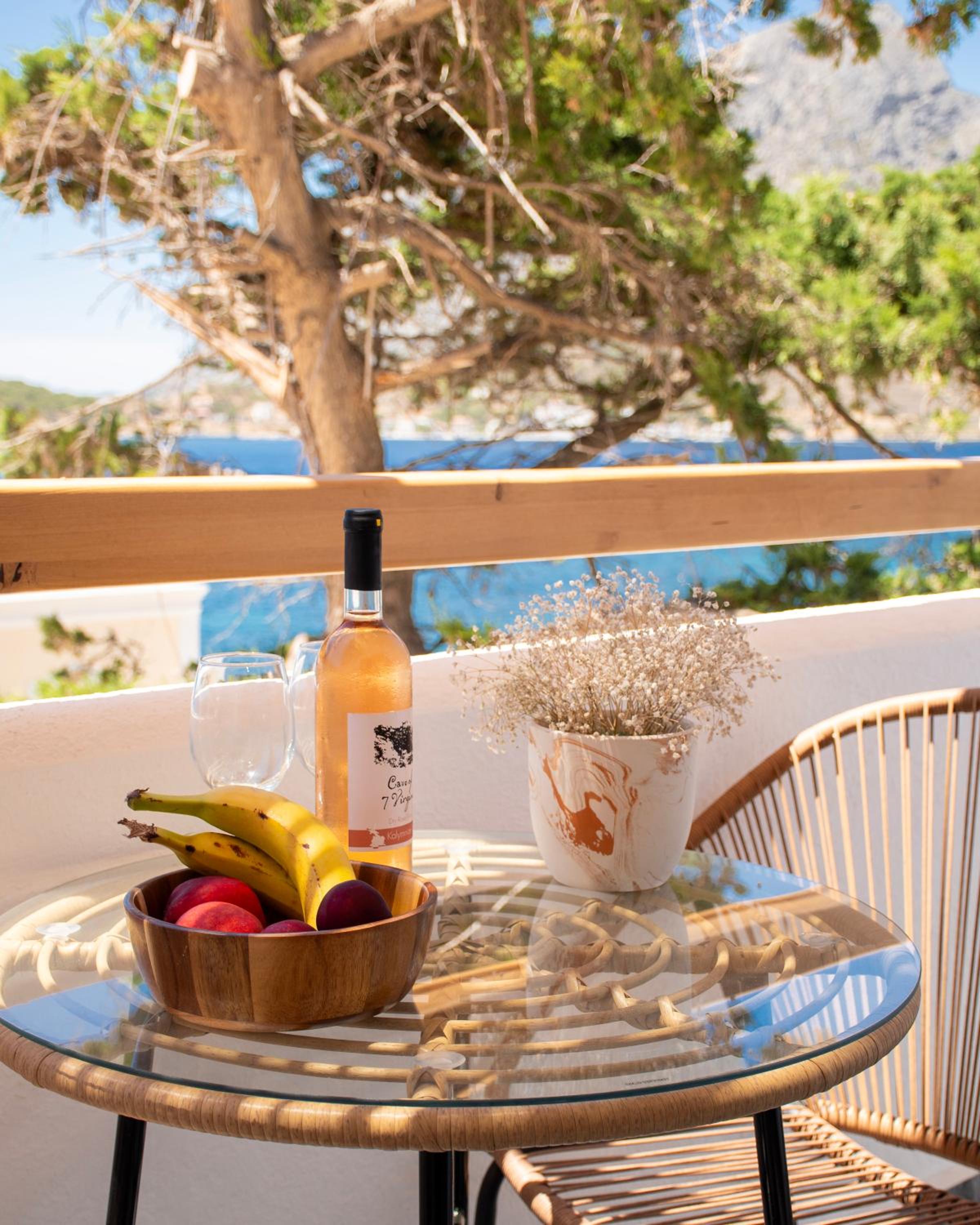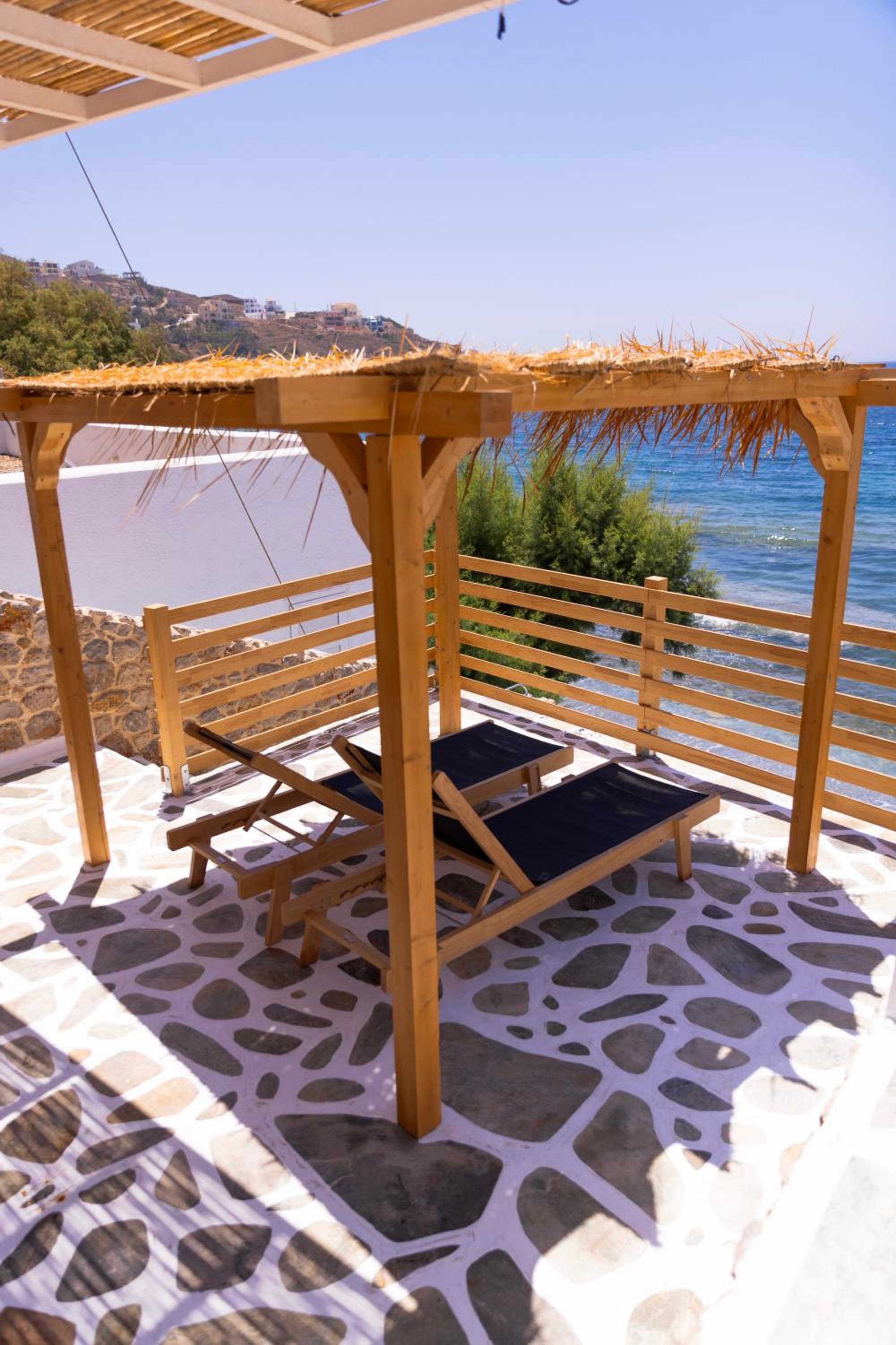 First and foremost, we loved the position. Just IN FRONT of TELENDOS, next to the dock where the boats come and go, with a stunning swimming pool overlooking the sea...on the rear, along the way where the reception is, a little square with a taxi stop, a supermarket and a car rental.