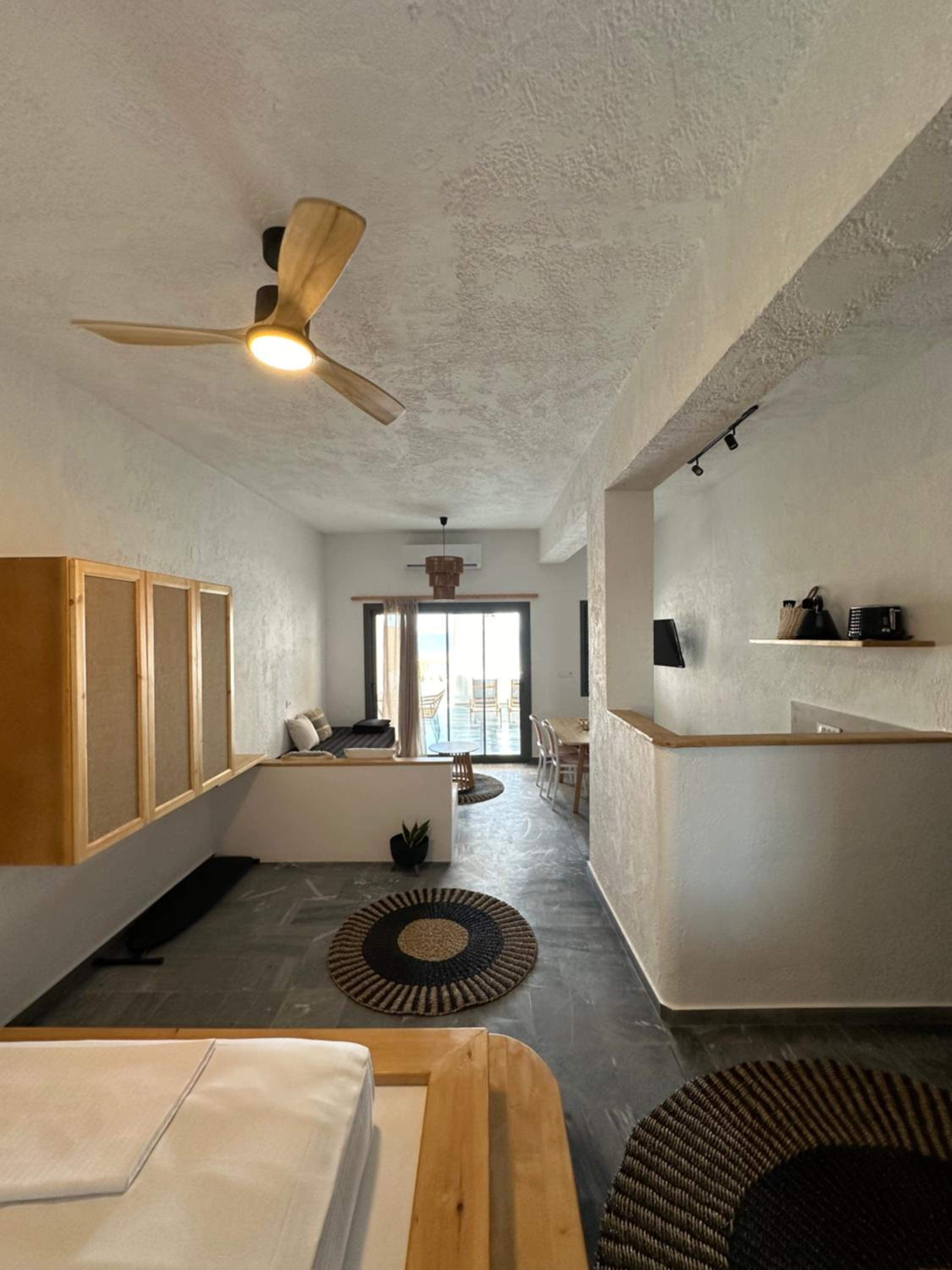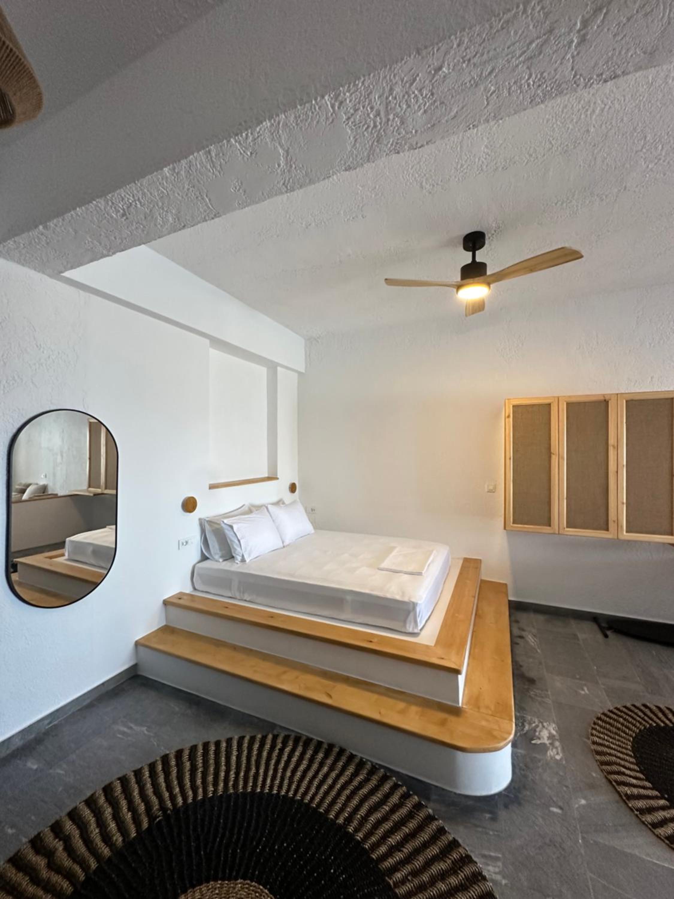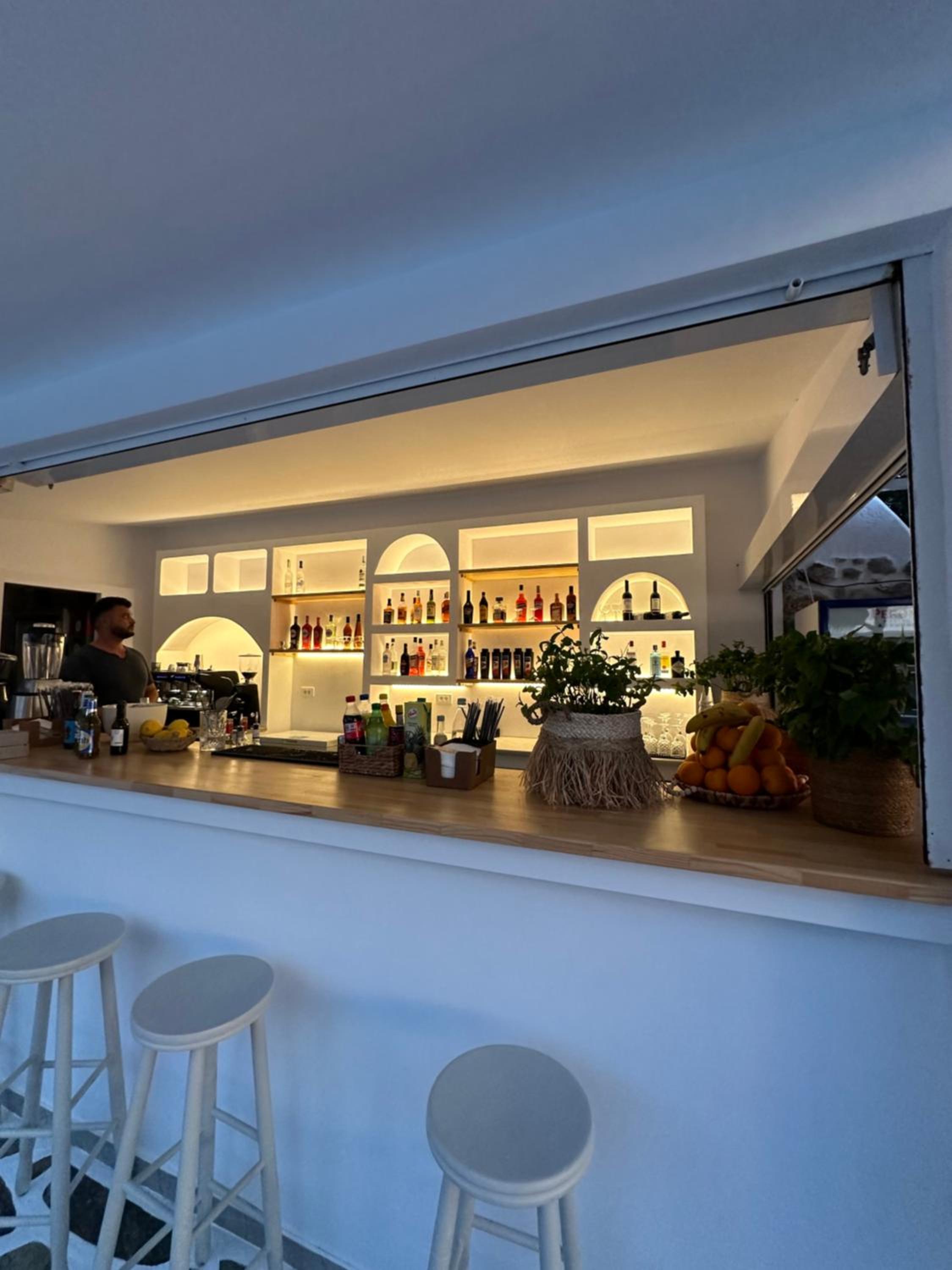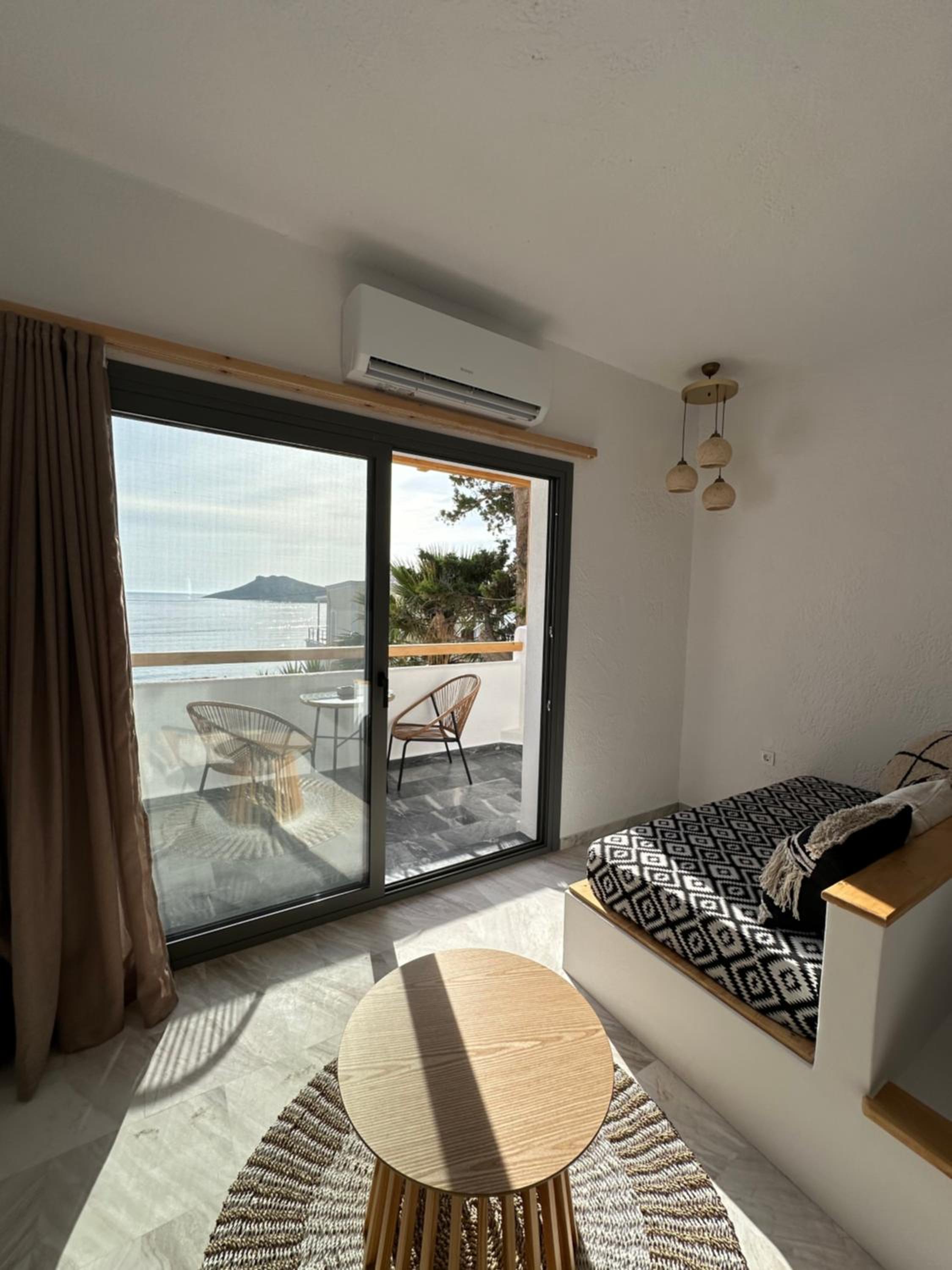 First and foremost, we loved the position. Just IN FRONT of TELENDOS, next to the dock where the boats come and go, with a stunning swimming pool overlooking the sea...on the rear, along the way where the reception is, a little square with a taxi stop, a supermarket and a car rental.