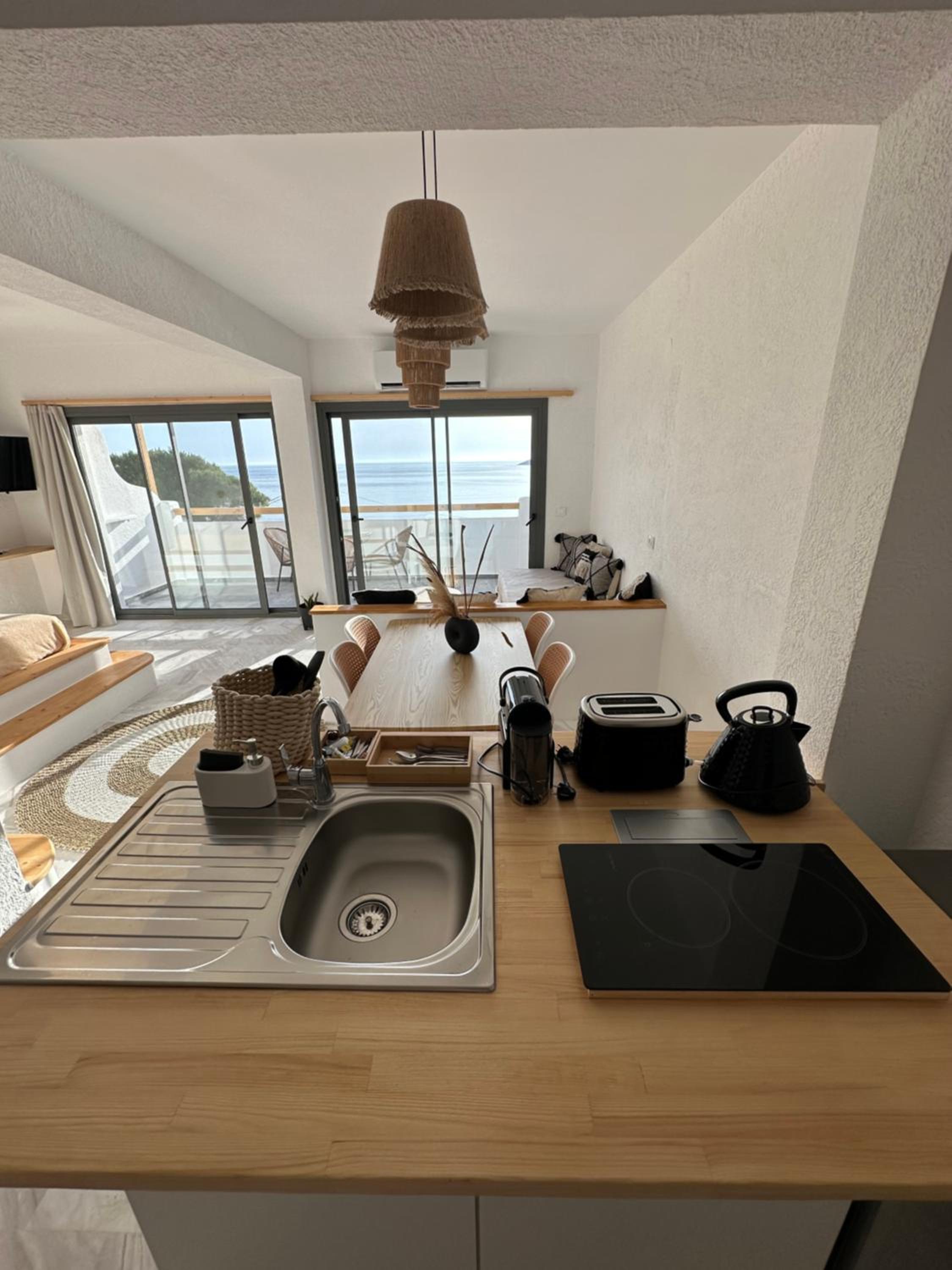 Enjoy breathtaking sea views and direct access to a private beach area for a relaxing seaside getaway.