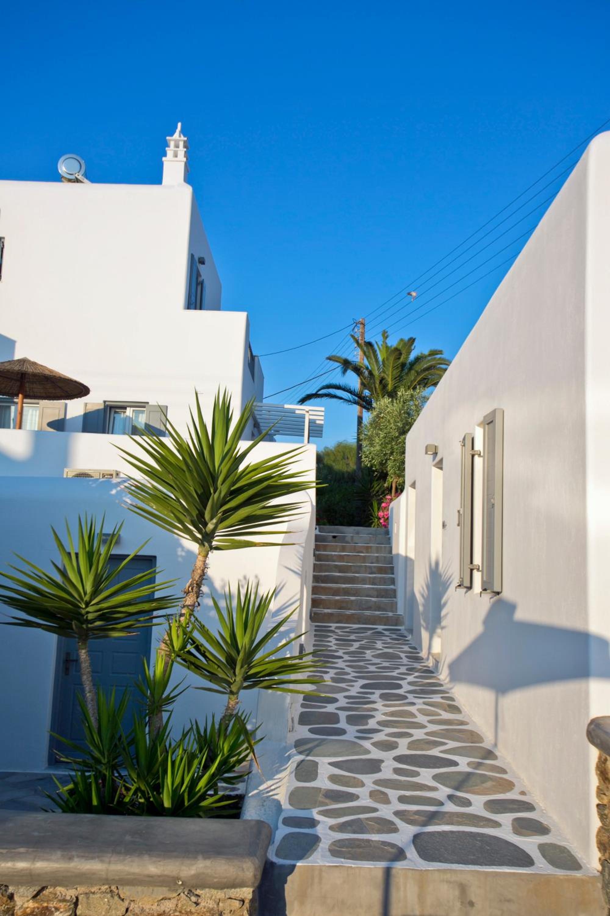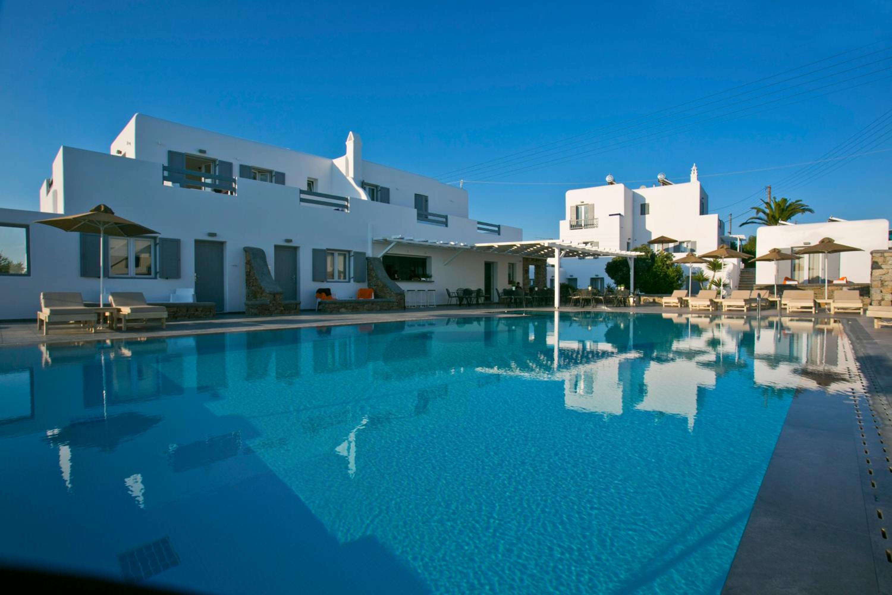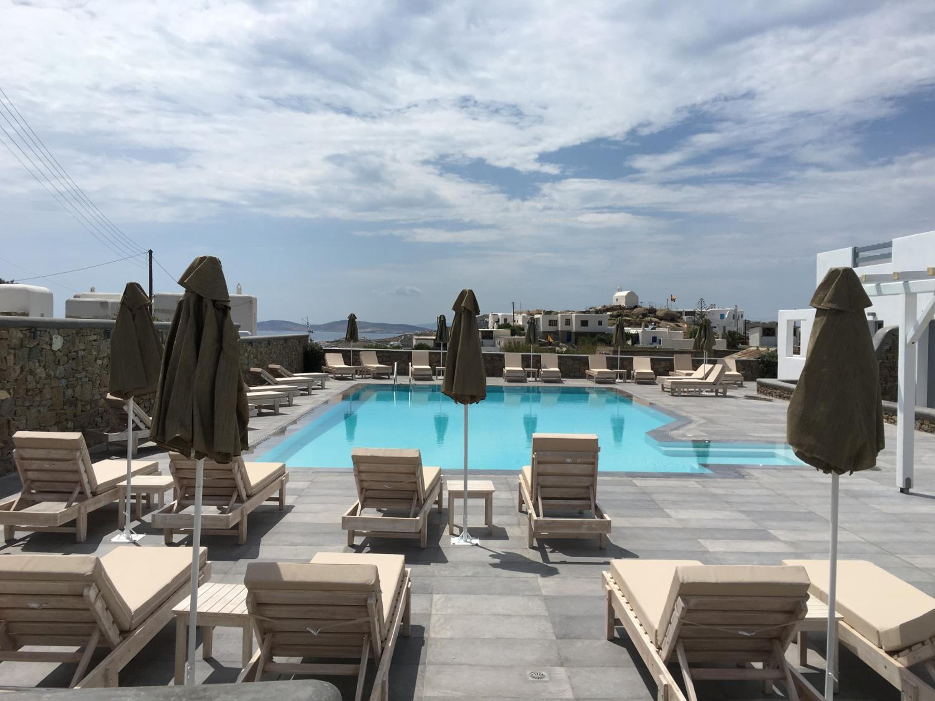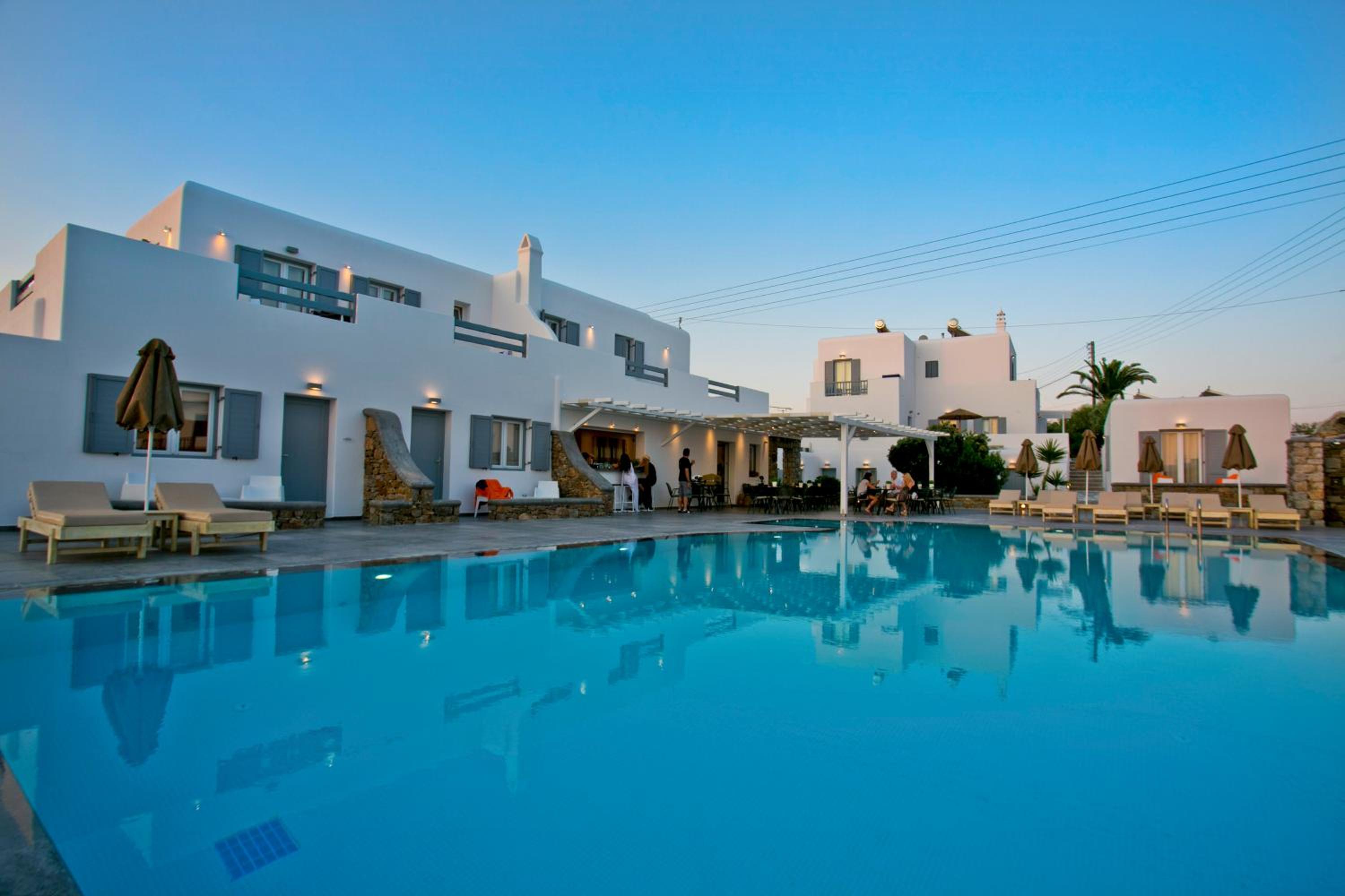 Anzitutto la posizione comodissima per chi noleggio un auto o una macchina. 5 minuti dall’aeroporto di Mykonos. Personale disponibilissimo, camere pulitissime, colazione buonissima ricca dolce e salata, davvero un ottima struttura
