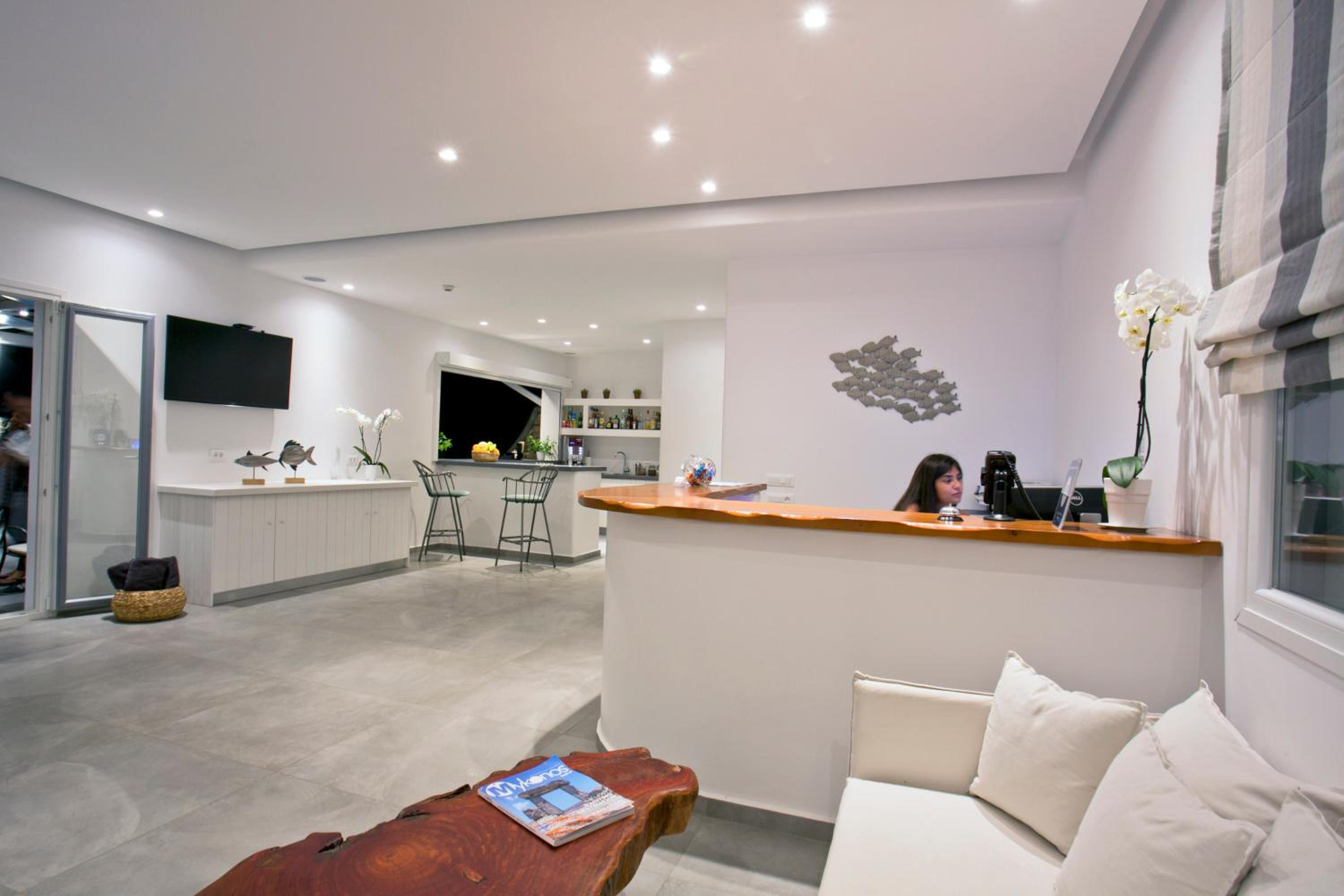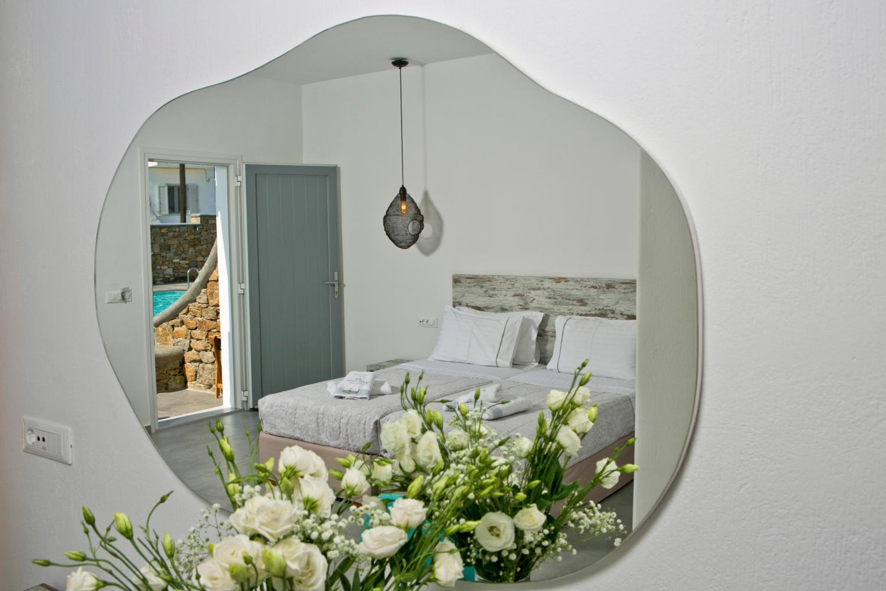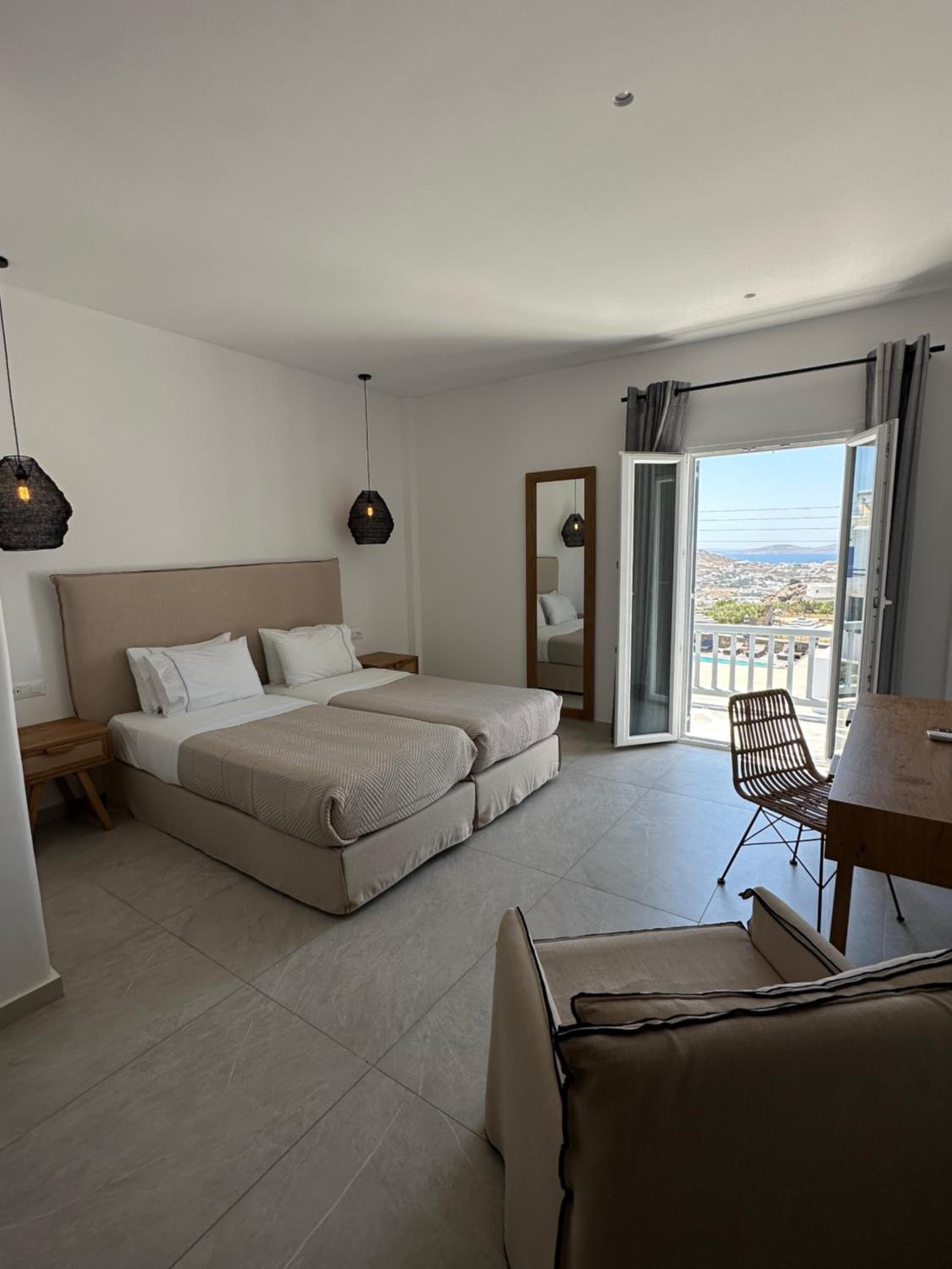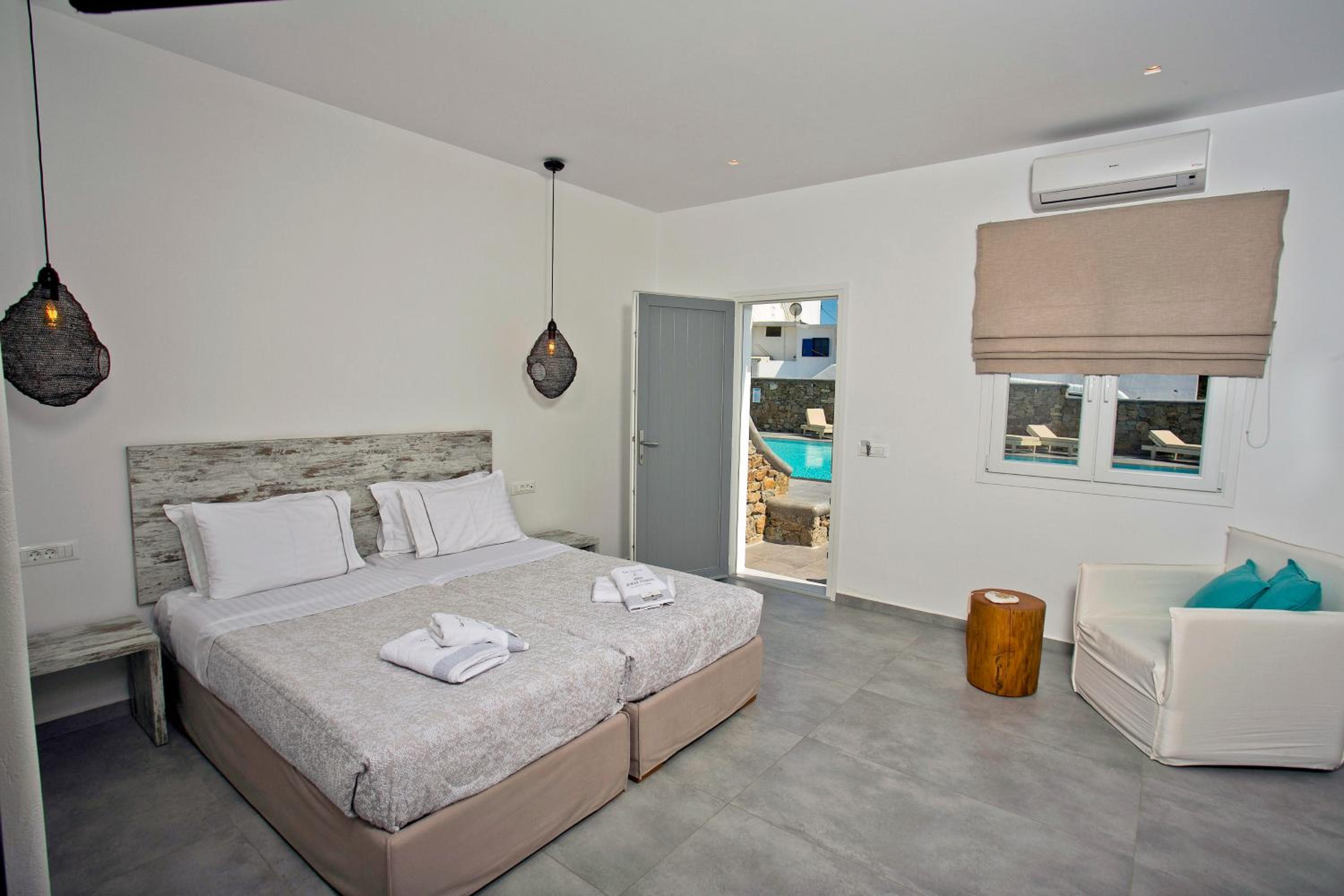 Anzitutto la posizione comodissima per chi noleggio un auto o una macchina. 5 minuti dall’aeroporto di Mykonos. Personale disponibilissimo, camere pulitissime, colazione buonissima ricca dolce e salata, davvero un ottima struttura