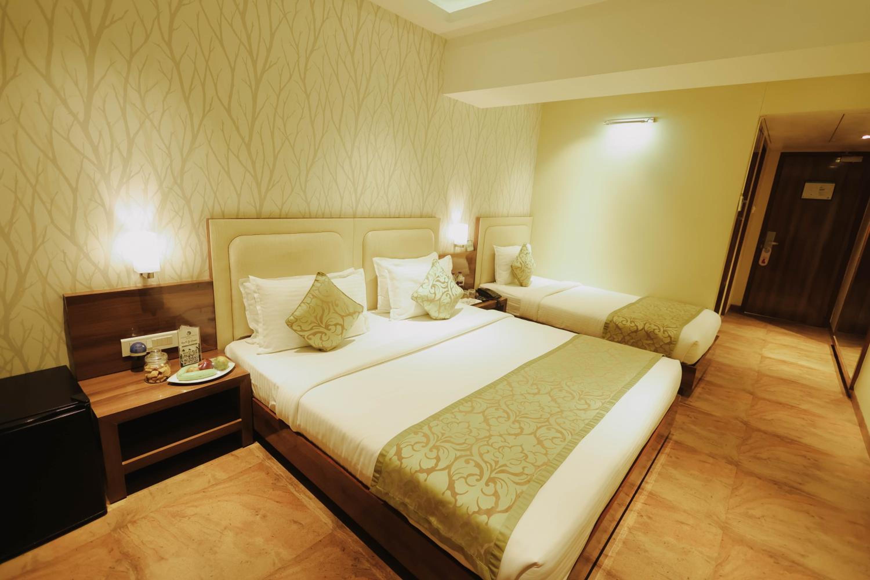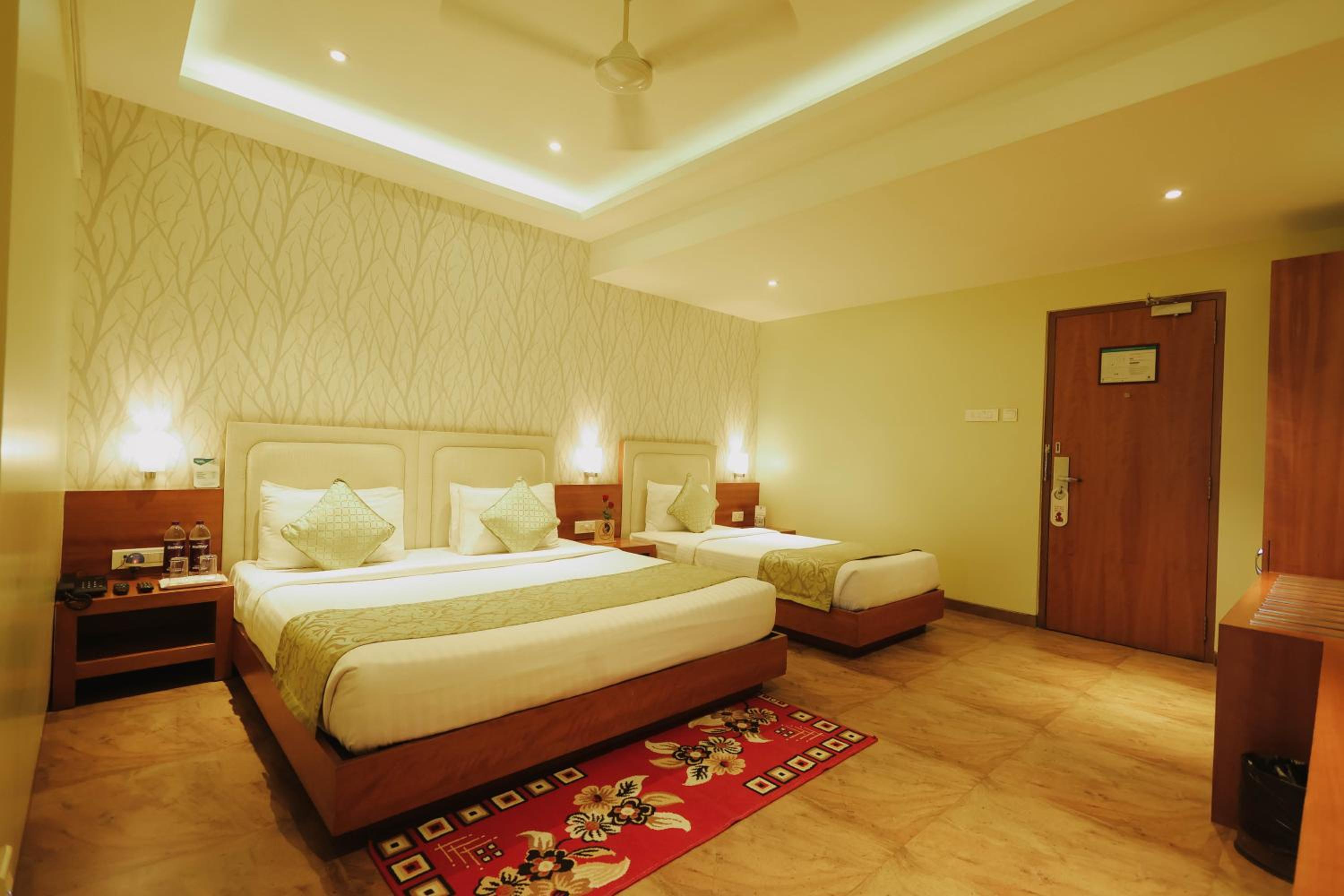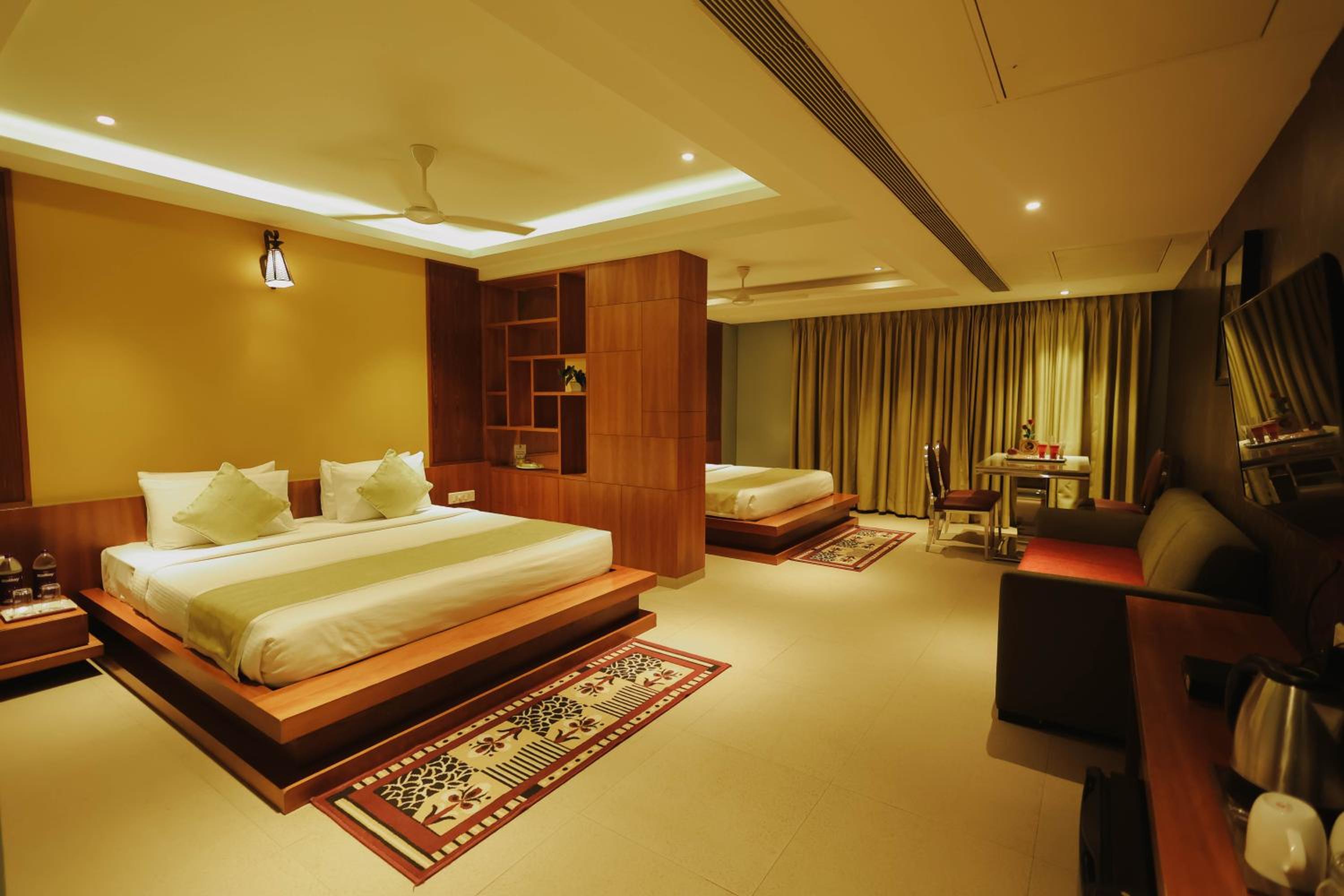 The room, otherwise very comfortable did not have space for keeping luggage. I placed my luggage over the small sized refrigerator. Also, the room did not have a chair. It would be a good idea to remove the extra single bed (over and above the king sized bed) and find place for a luggage rack and chair.