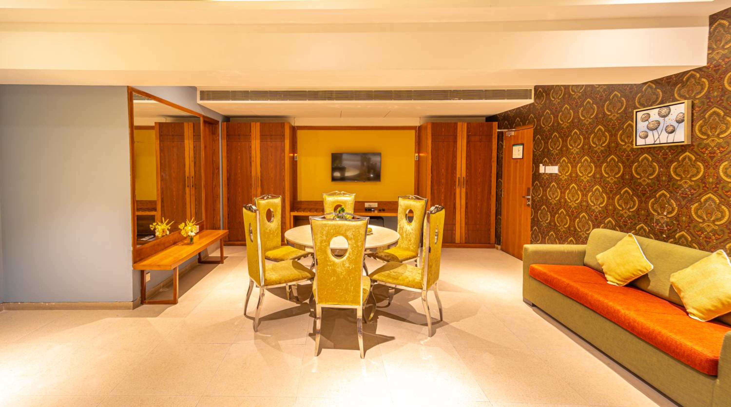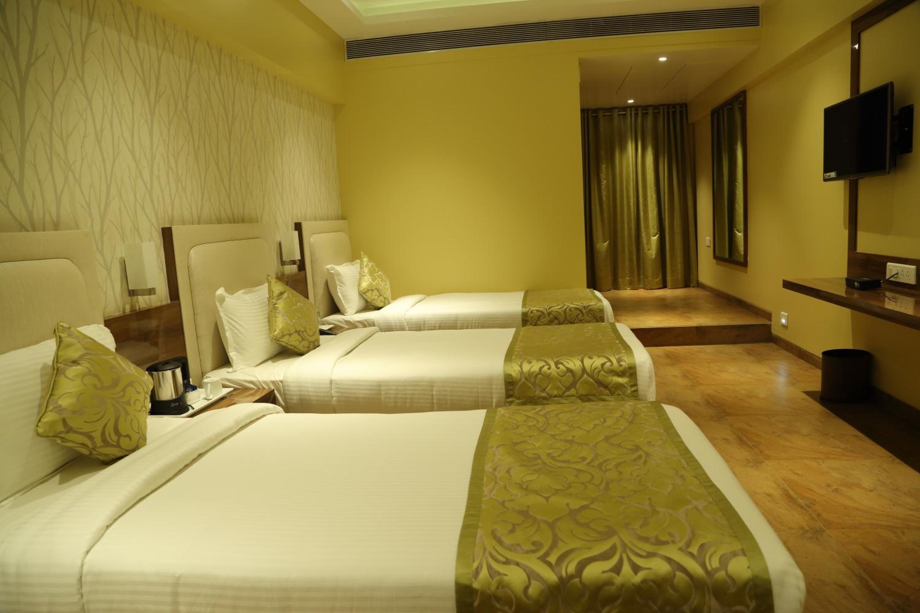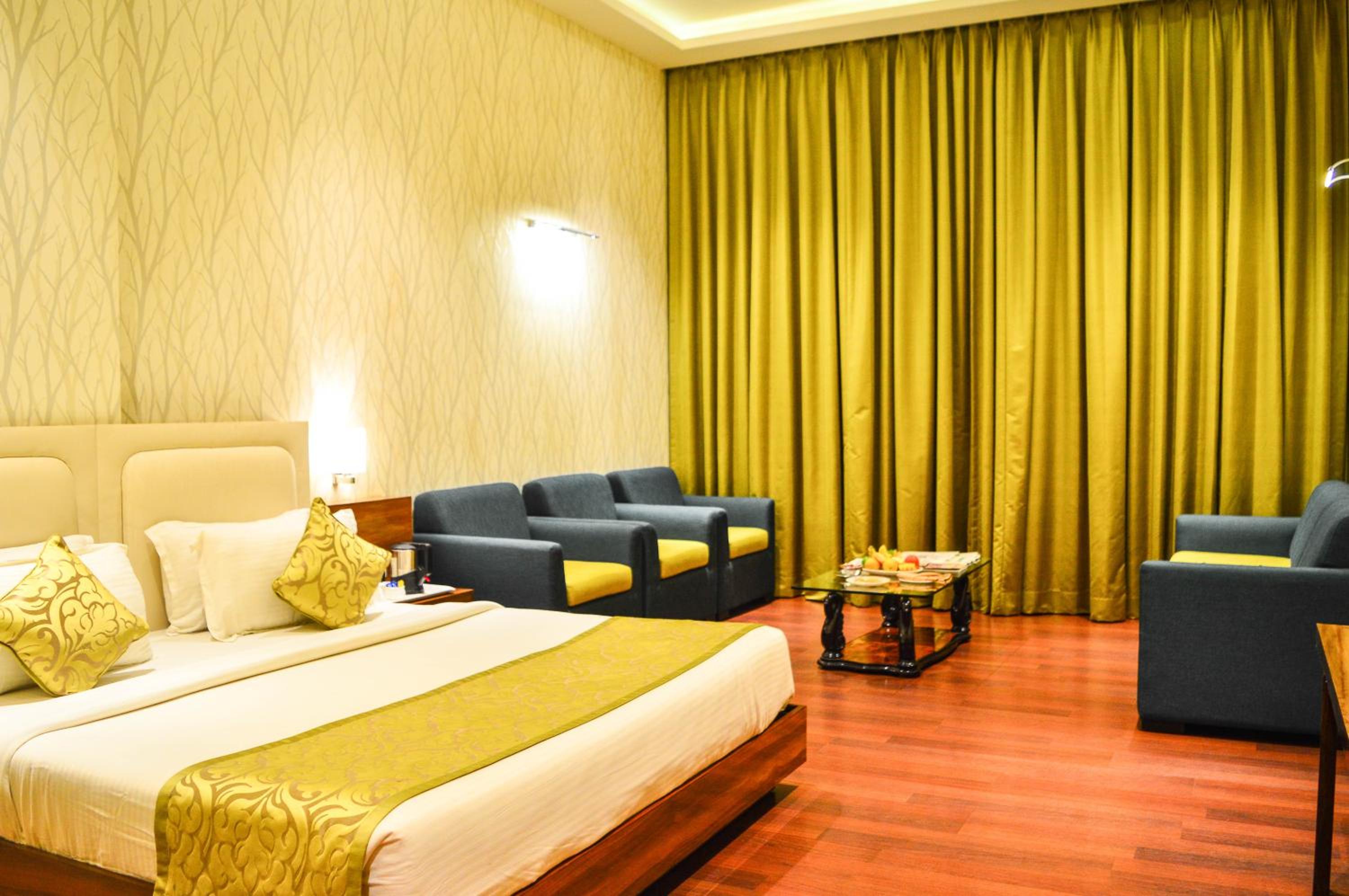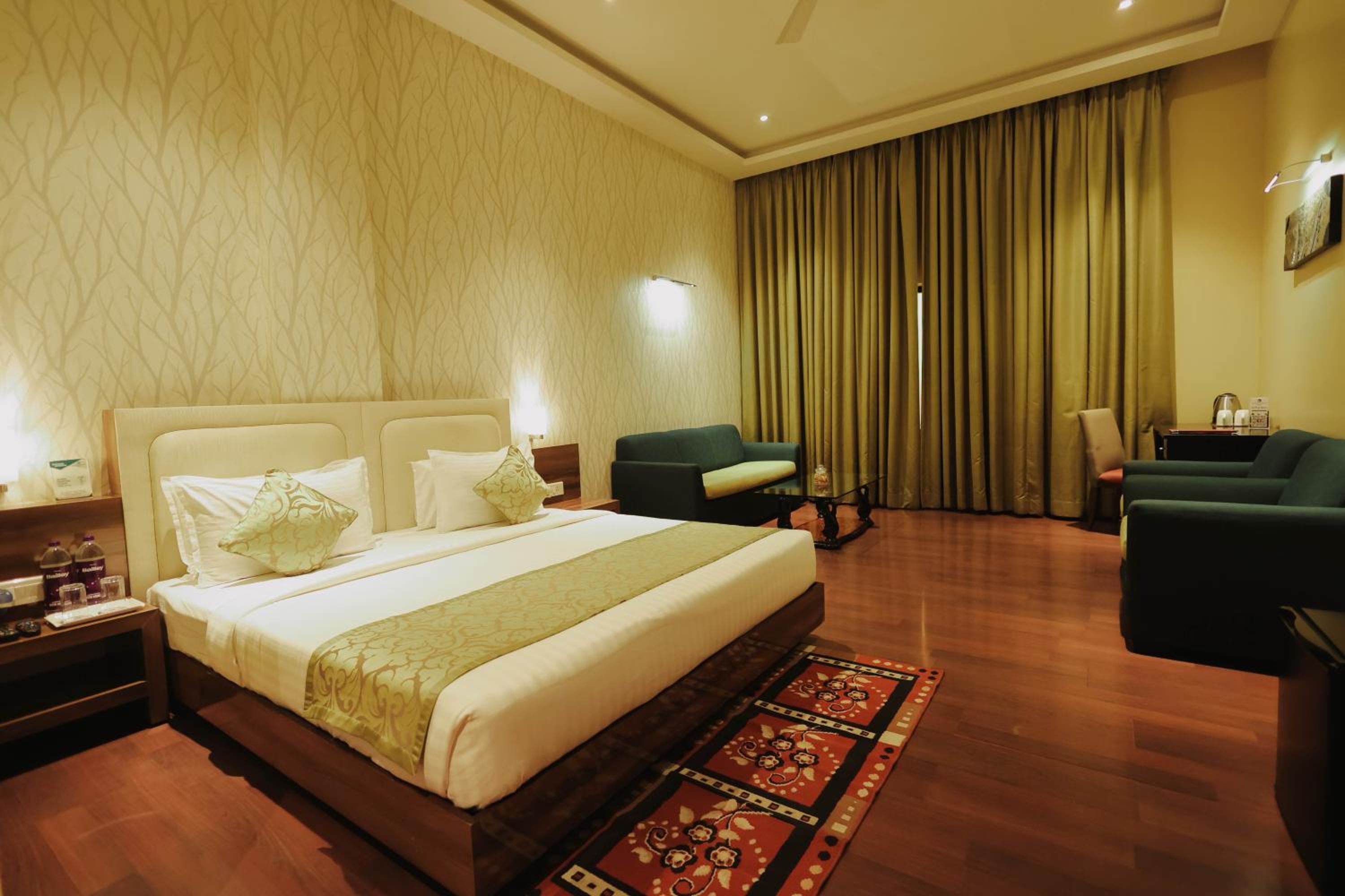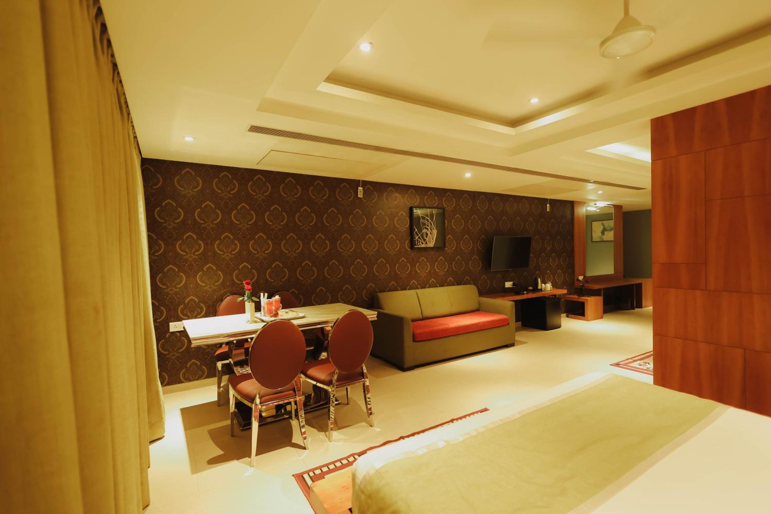 Luxurious Accommodation: Hotel Shamrock Greens in Raipur offers a comfortable stay with well-equipped rooms featuring flat-screen TVs and cozy seating areas.